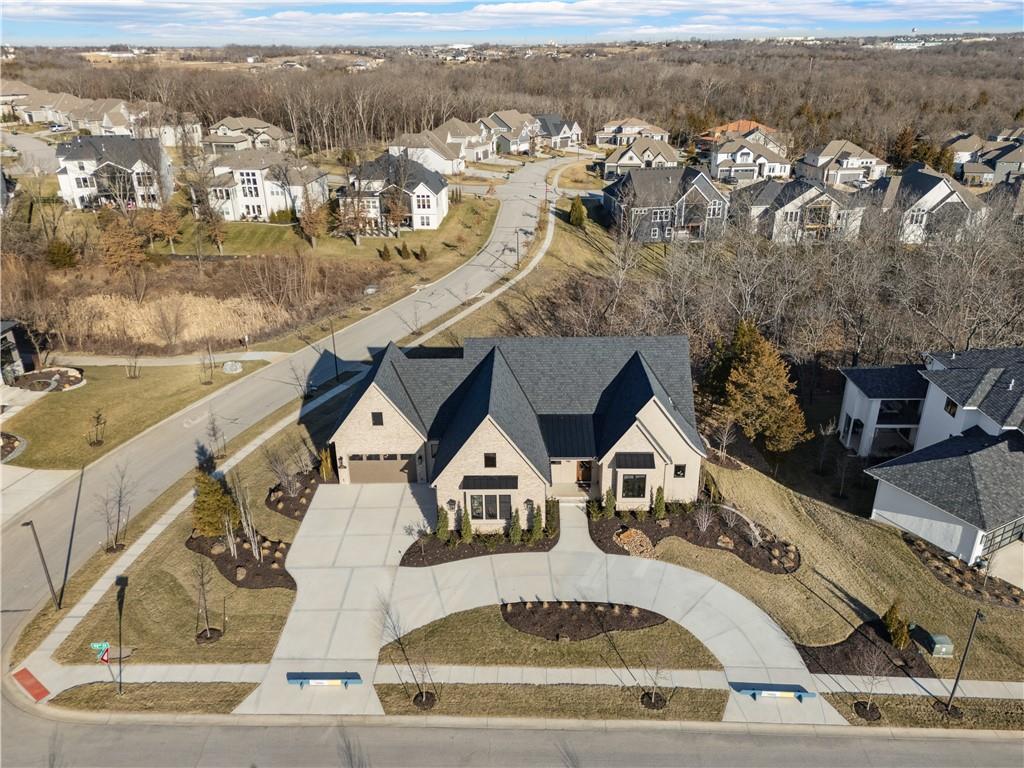 MOVE IN READY! "Riviera" plan by Bickimer Homes. This Reverse 1.5 story on large wooded, walkout, corner lot in features many upgrades including a golf simulator in the finished walkout lower level which features an additional 2ft drop for a 12ft ceiling in simulator area. Lower level also includes a fitness room & wet bar in large rec room area. Gourmet kitchen features large gas range and quartzite countertops and built-in, paneled refrigerator. Huge 4 car garage (2 each!) plus large mudroom area, extensive landscaping and landscape lighting! Enjoy Timber Rock amenities such as our luxurious clubhouse, swimming pool, pickleball courts, play area and walking trails! Contact neighborhood listing agents for a tour today! Home is complete and MOVE IN READY! Olathe School District