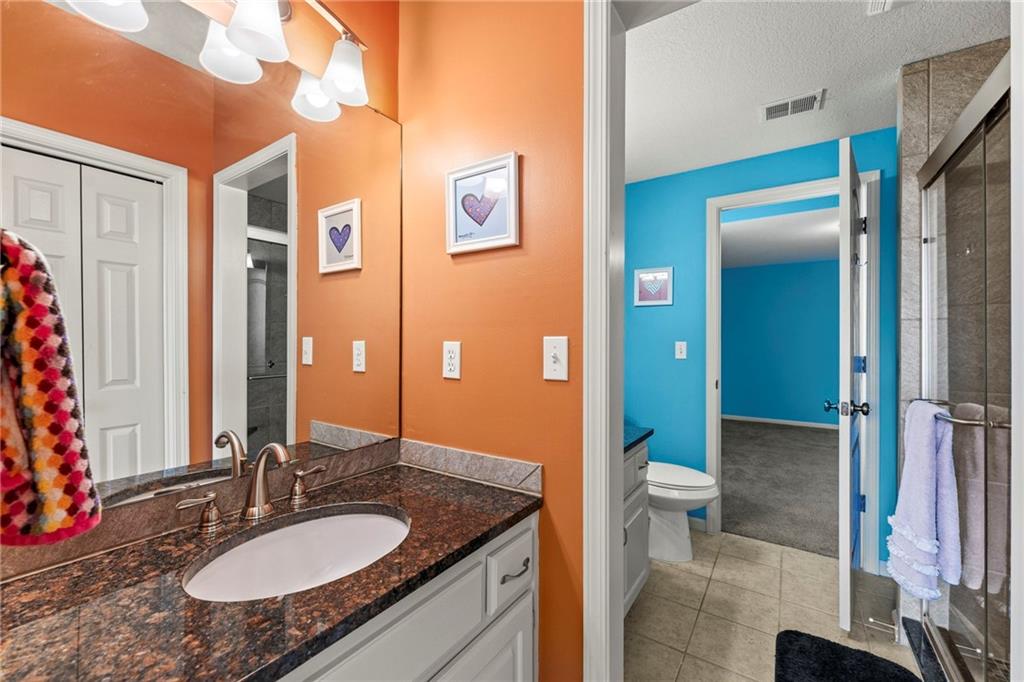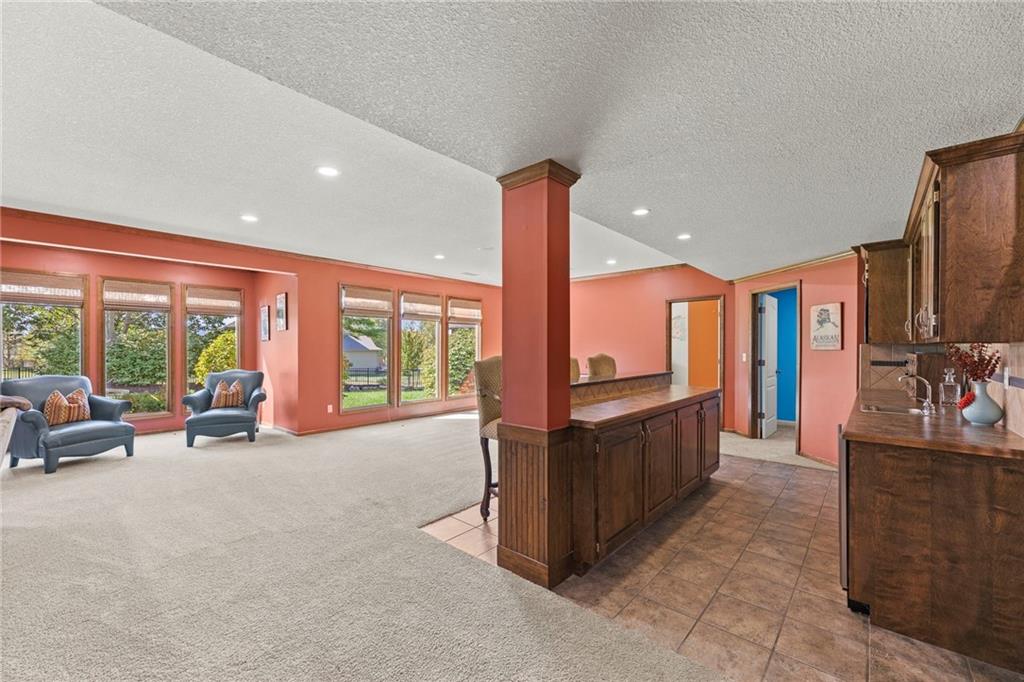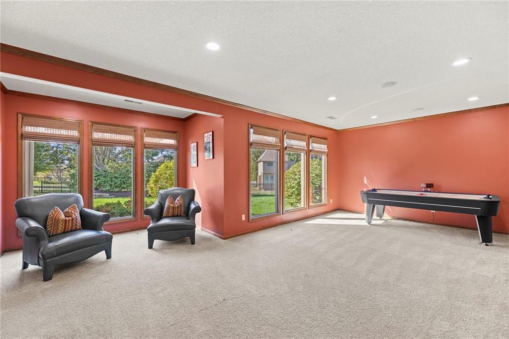 Gorgeous 4000+sf reverse 1.5 story with 3 fireplaces including hearth room off kitchen, great room and master bedroom! New screened in deck, finished walkout lower level with wetbar and 3 bedrooms. Kitchen features stainless appliances, large island, bar seating and granite counters! Fresh paint and new carpet in entire main level! Cul-de-sac location and De Soto school district! Neighborhood Pool too!