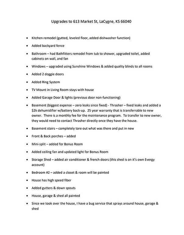 Right in the heart of LaCygne your new home awaits! Close enough to the amenities and yet far enough to be away from it all, this house has what you need! With a completely remodeled kitchen (with new appliances) and bathroom (remodeled by Bathfitters), window upgrades, new basement stairs, new gutters and downspouts, new front and rear porches plus the basement has been made water tight by Thrasher that comes with at 25 year warranty! This property has so much more to offer and all it needs is you! This 2 bed 1 bath does have an office or storage room upstairs that could be a bedroom with the addition of a closet. It also has 2 out buildings, the garage and a mancave / she shed ready for your ideas. With a completely fenced in yard, a couple of doggie doors and high speed fiber, you may never want to leave! The house both inside and out has been completely painted as well. With all that done, all it needs is you! Schedule today because it wont last long!