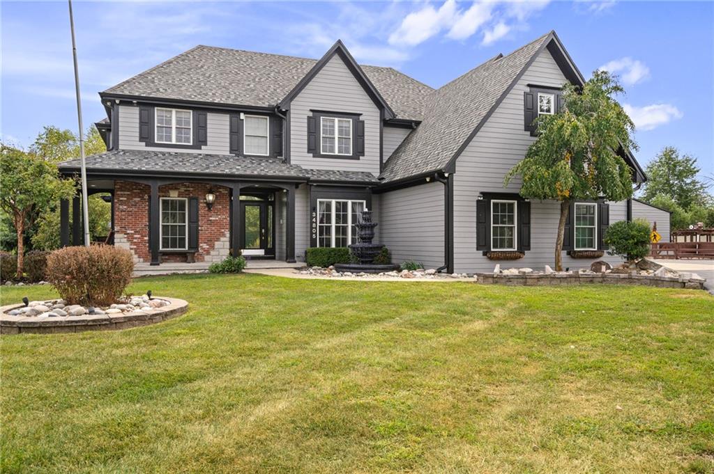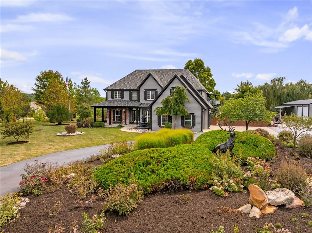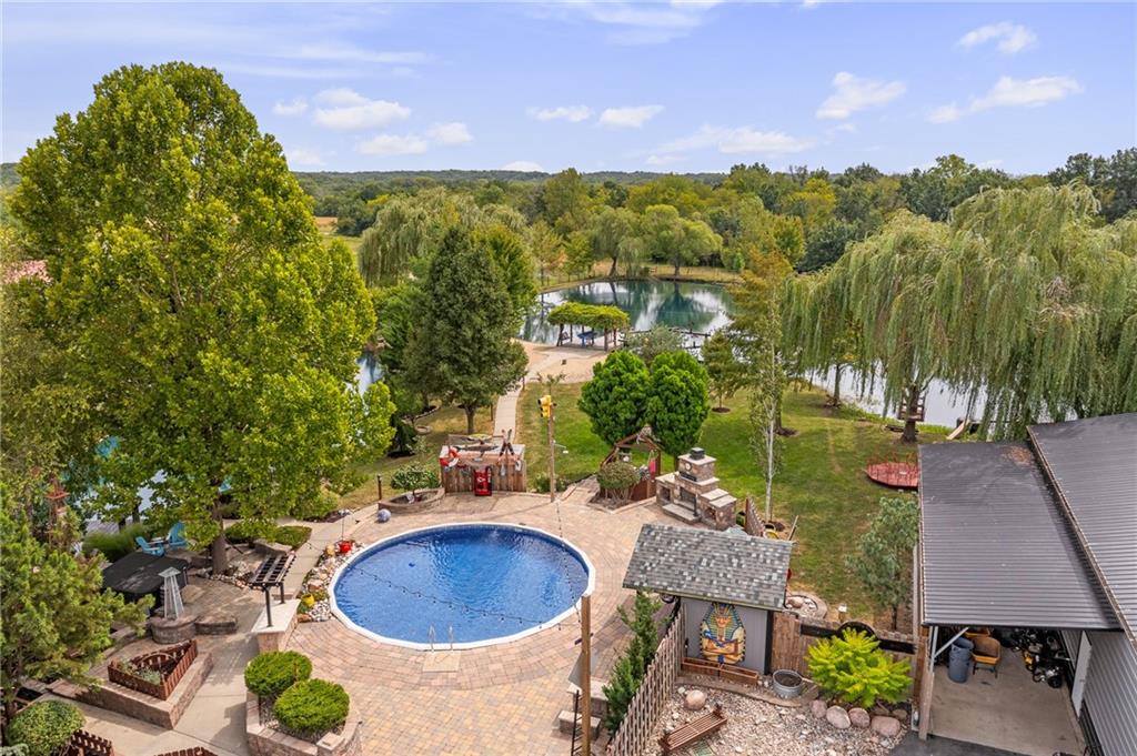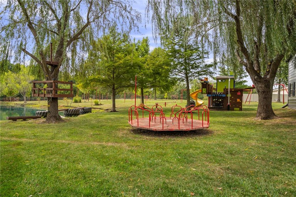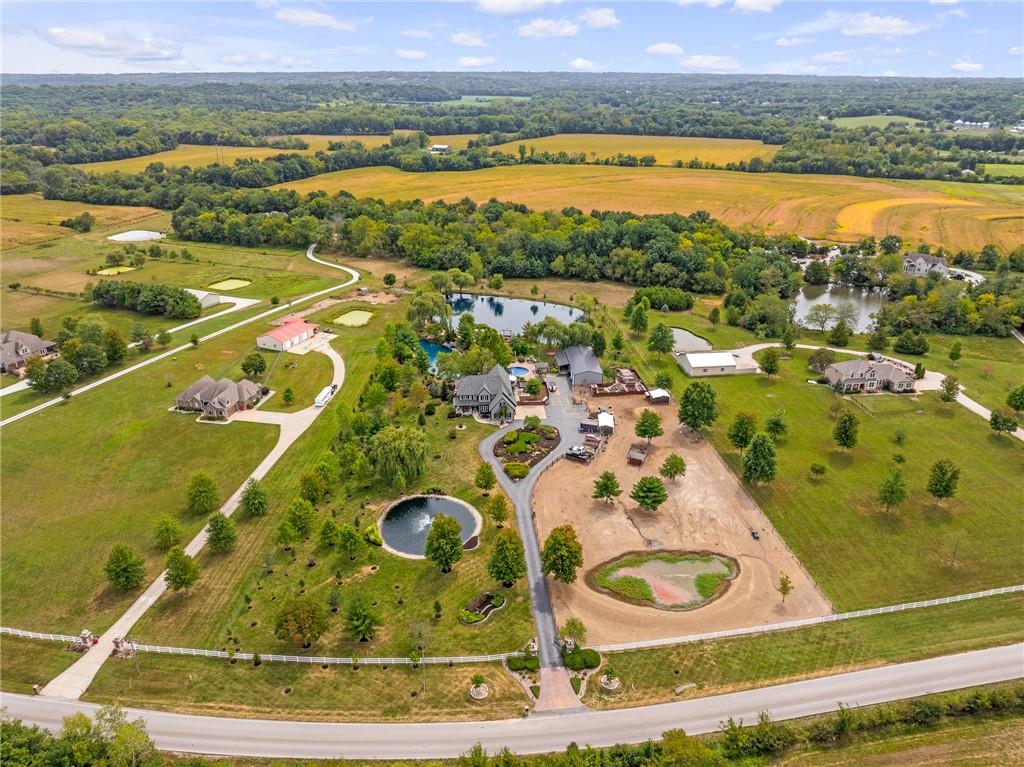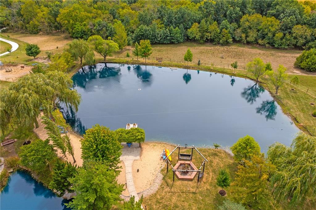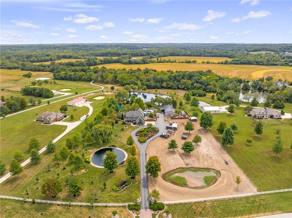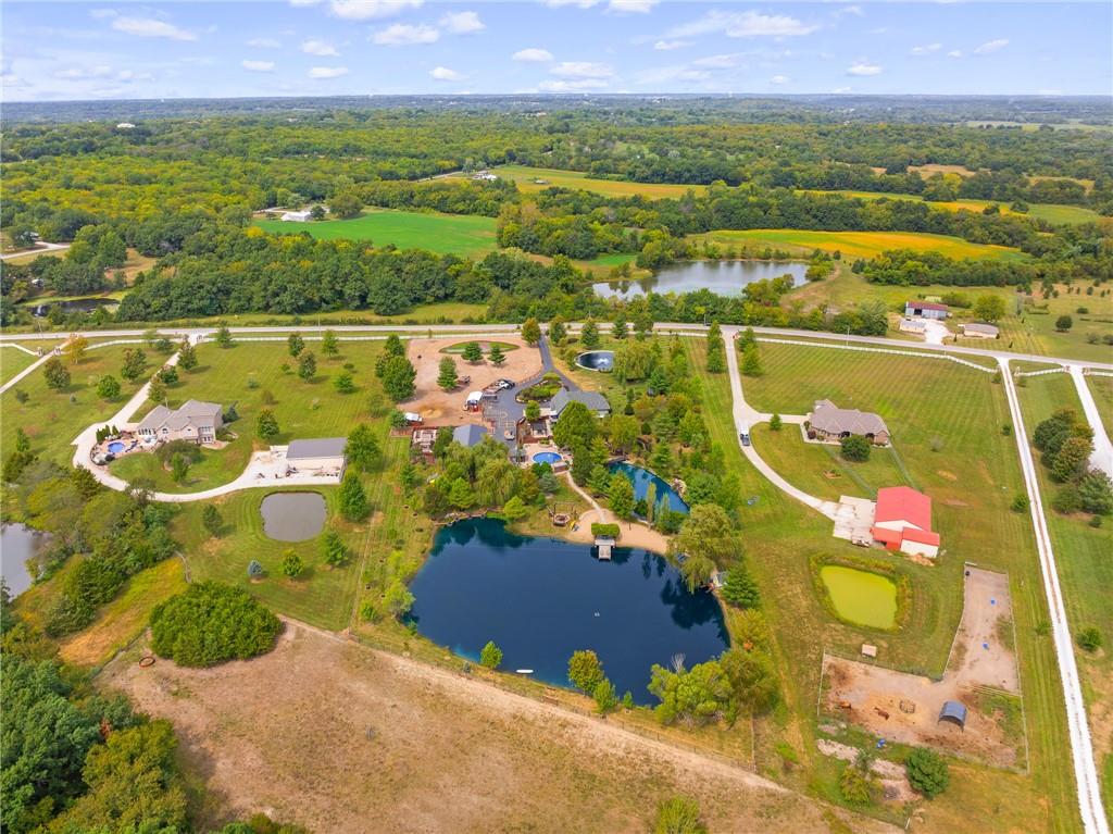 Unmatched in character and amenities, this gated 5-acre Lone Jack property is designed for those who love to entertain, live outdoors, and need space for a home-based business. The grounds are extraordinary, with two large ponds—one offering a sandy beach, dock, playhouse with hurricane deck, and zip line, the other showcasing a dramatic 12-foot stone waterfall. Multiple weeping willows surround the water, creating a picturesque, park-like setting. Outdoor living is unbelievable with a swimming pool, outdoor shower, festive poolside bar, basketball court, striped parking for nine cars, multiple firepits, fountains, and extensive landscaping and unique trees. A huge raised-bed garden with drip irrigation and automatic watering, vintage 1950s merry-go-round, playground and pergola framed with wisteria over the water complete the retreat. The 2006-built two-story home offers quality and comfort with hard surface flooring throughout the main level, five fireplaces, formal dining, office, and a hearth room/kitchen with island seating for five, Viking six-burner cooktop. French doors open to a fenced dog yard with pergola and hibachi grill. Upstairs, four bedrooms each enjoy private baths; the oversized primary suite boasts a fireplace, sitting area, private covered balcony with mini split, and a massive walk-in closet. The walkout lower level is built for gathering, with a theater, arcade, full bar, non-conforming fifth bedroom, full bath, and access to a saloon-style patio with hot tub and firepit. Complete set up for livestock and farm animals with fenced pen, multiple shelters and duck pond.. The property also includes a new outbuilding with concrete floor, two large overhead doors, built-in compressor, and plumbing for living quarters—ideal for equipment storage, hobbies, or running a business. Meticulously maintained and set on blacktop, this one-of-a-kind estate combines resort-style living with everyday functionality—an entertainer’s paradise inside and out.