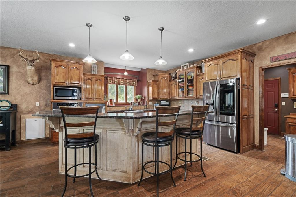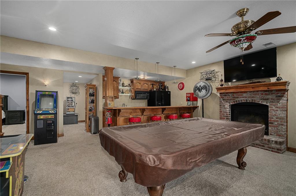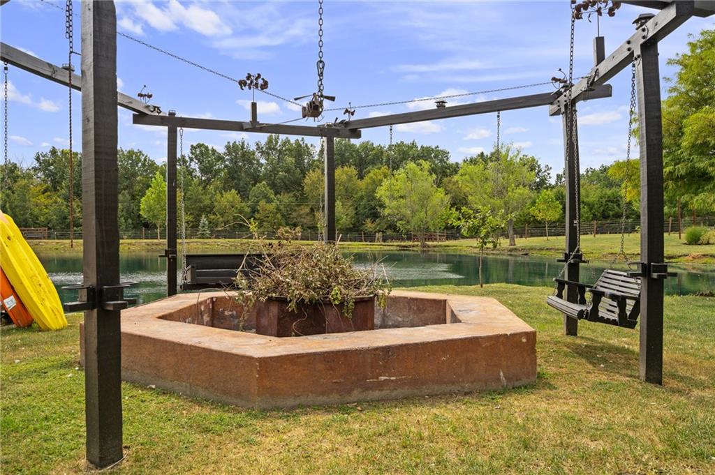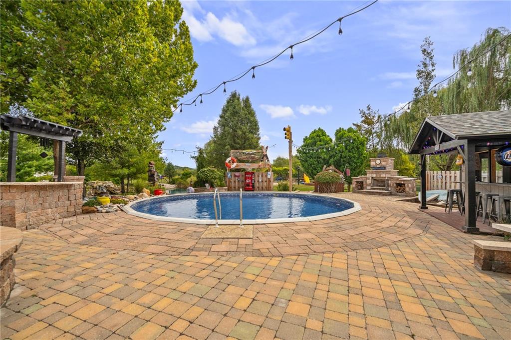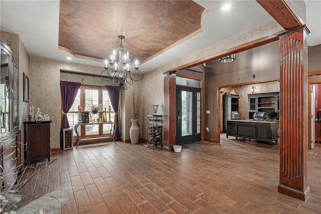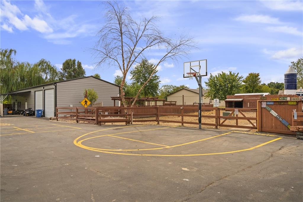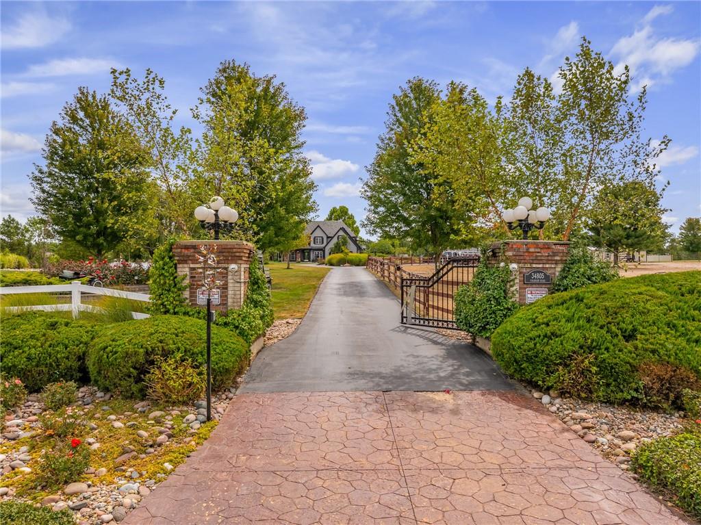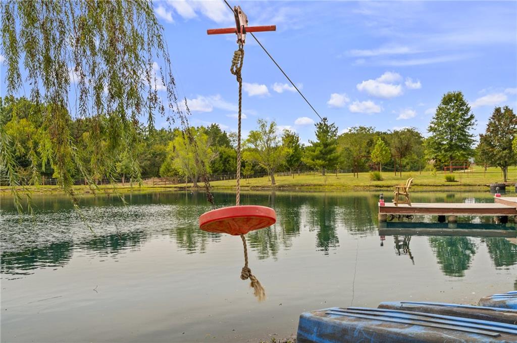Unmatched in character and amenities, this gated 5-acre Lone Jack property is designed for those who love to entertain, live outdoors, and need space for a home-based business. The grounds are extraordinary, with two large ponds—one offering a sandy beach, dock, playhouse with hurricane deck, and zip line, the other showcasing a dramatic 12-foot stone waterfall. Multiple weeping willows surround the water, creating a picturesque, park-like setting. Outdoor living is unbelievable with a swimming pool, outdoor shower, festive poolside bar, basketball court, striped parking for nine cars, multiple firepits, fountains, and extensive landscaping and unique trees. A huge raised-bed garden with drip irrigation and automatic watering, vintage 1950s merry-go-round, playground and pergola framed with wisteria over the water complete the retreat. The 2006-built two-story home offers quality and comfort with hard surface flooring throughout the main level, five fireplaces, formal dining, office, and a hearth room/kitchen with island seating for five, Viking six-burner cooktop. French doors open to a fenced dog yard with pergola and hibachi grill. Upstairs, four bedrooms each enjoy private baths; the oversized primary suite boasts a fireplace, sitting area, private covered balcony with mini split, and a massive walk-in closet. The walkout lower level is built for gathering, with a theater, arcade, full bar, non-conforming fifth bedroom, full bath, and access to a saloon-style patio with hot tub and firepit. Complete set up for livestock and farm animals with fenced pen, multiple shelters and duck pond.. The property also includes a new outbuilding with concrete floor, two large overhead doors, built-in compressor, and plumbing for living quarters—ideal for equipment storage, hobbies, or running a business. Meticulously maintained and set on blacktop, this one-of-a-kind estate combines resort-style living with everyday functionality—an entertainer’s paradise inside and out.