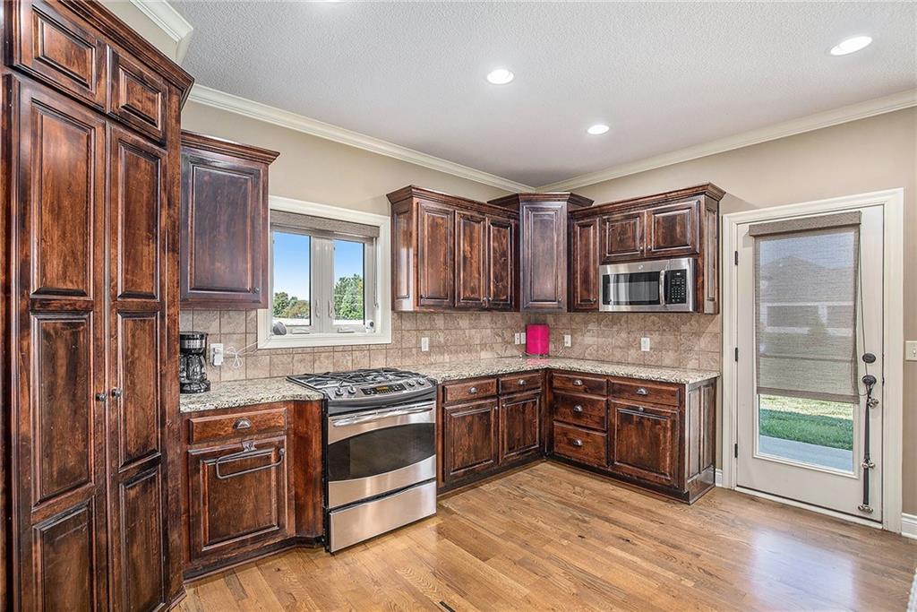 This stunning 5-bedroom home offers the perfect blend of style, comfort, and convenience—all within the highly sought-after Lee’s Summit School District. Step inside to find gorgeous hardwood floors, a bright and inviting living space, and a kitchen designed for both cooking and gathering—featuring granite countertops, stainless steel appliances, and plenty of storage. The oversized primary suite is truly a retreat, complete with a spa-like en-suite bathroom and a huge walk-in closet you’ll fall in love with. Fresh updates throughout include new exterior paint, plush new carpet, and tasteful modern touches that make this home move-in ready. The finished lower level is the ultimate space for entertaining, hosting game nights, or creating the perfect media room. Sitting on almost 1/2 an acre, privacy & space is abundant!