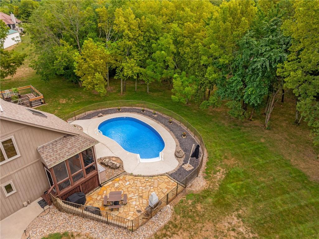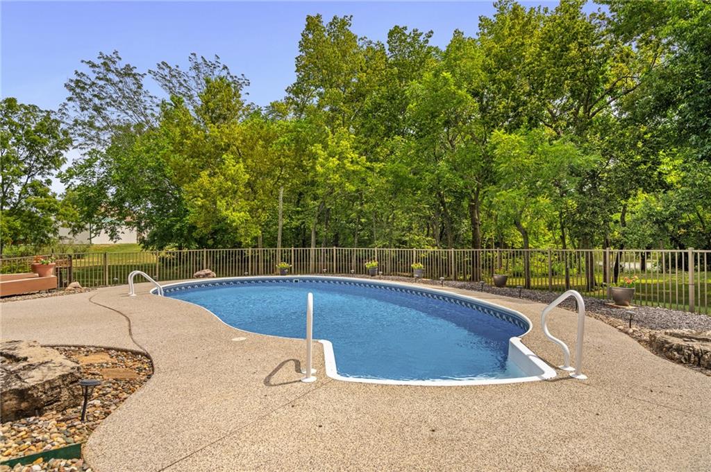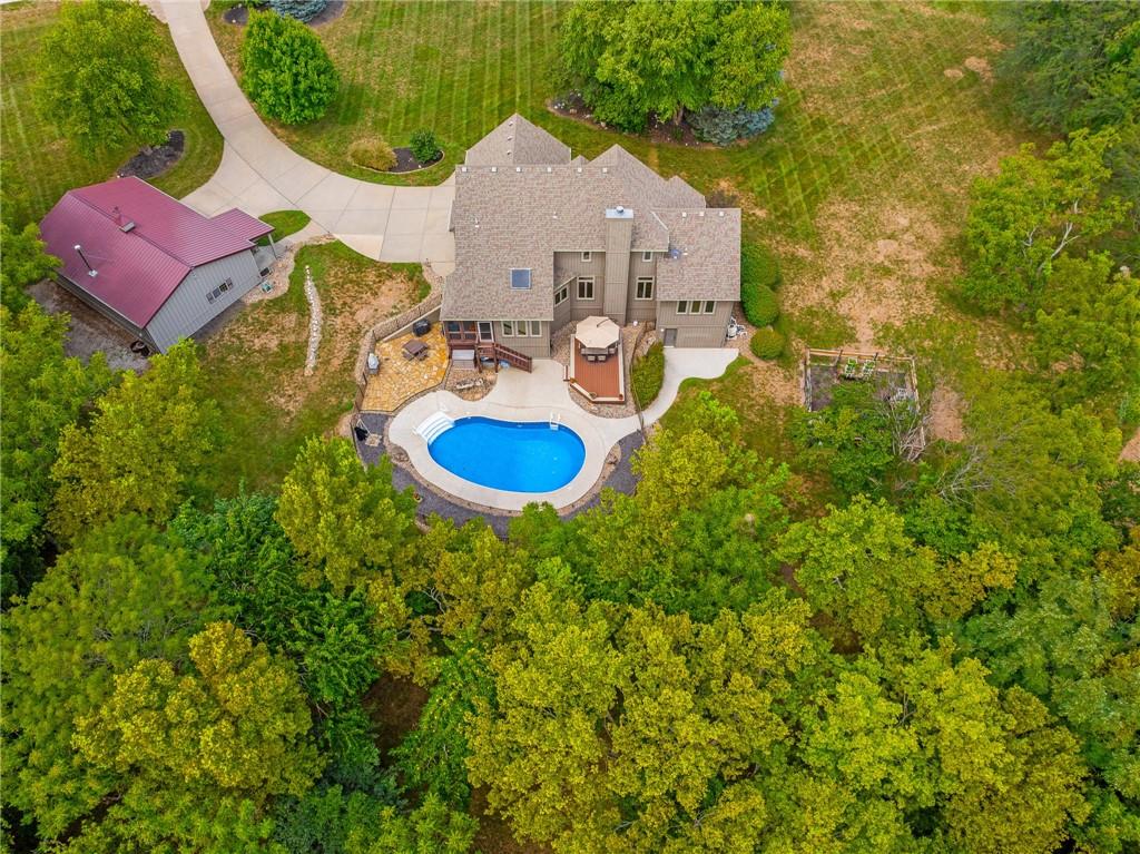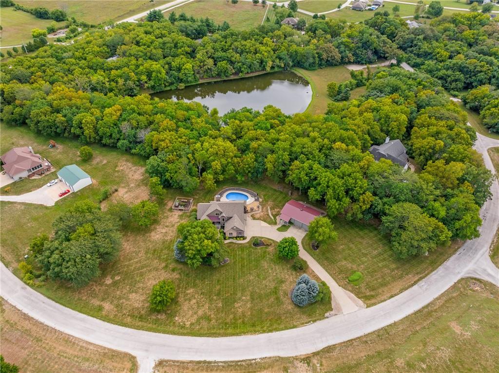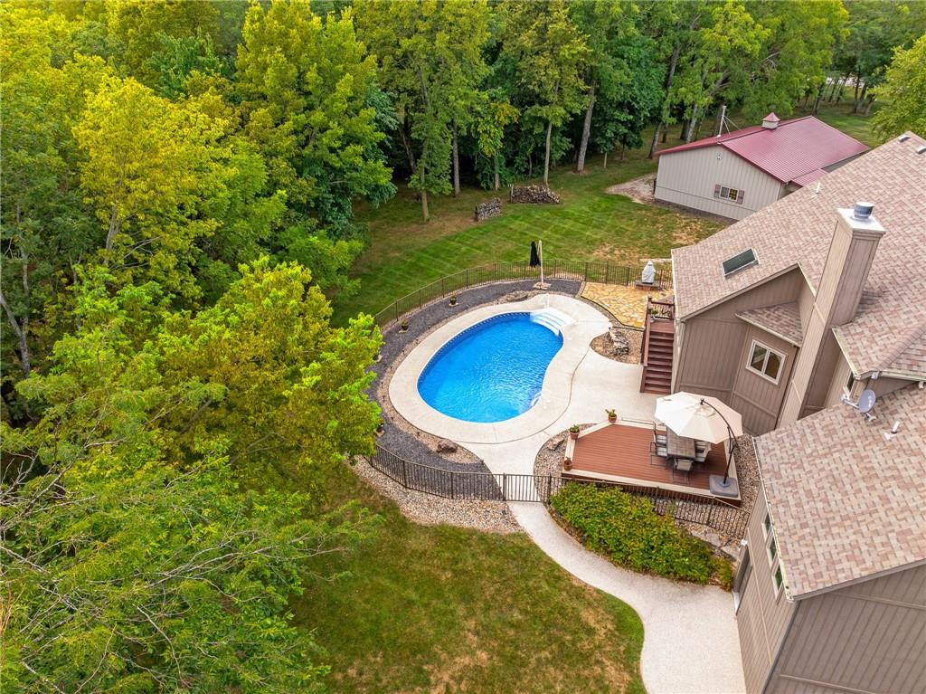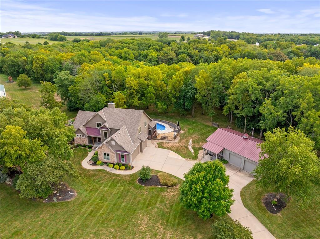 This stunning 1.5-Story custom-built Lodge-Style home offers 4 bedrooms, 2.5 baths, an open floor plan, all set on 3 acres w/the ultimate country lifestyle. A 2 minute walk finds you fishing or kayaking the 2.5-acre community pond stocked with multiple fishes.The home overlooks scenic woods where wildlife abounds. Car lovers and hobbyists will appreciate the incredible 45x29 Morton Bldg (SHOP) just across the driveway.The 2 garage bays here give you a total of 5 bays. BONUS -behind the SHOP is a 42x12 RV pad w/30 AMP service.Turning to the inside, a rustic elegance awaits you w/natural pecan flooring and woodwork. You'll be greeted immediately to a beautiful dry-stacked stone wood burning fireplace with a one of a kind, hand-carved mantle. The Great Room features 10’ ceilings w/massive hand-hewn beams.The kitchen will impress with all high-end appliances and large quartz center island. You won't believe the 10x6 pantry. Enjoy the custom "Cafe Booth" for that quick breakfast. The custom built-in hutch will astonish you.The laundry room has an oversized stainless steel sink/built-in ironing board and folding counter. The primary suite includes a daylight-lit walk-in closet and built-in desk. Upstairs a 19x10 loft is perfect for a home office. Also find 2 bedrooms and a 22x20 bonus room/bedroom. The daylight walkout basement (9’ ceilings) is stubbed for a bathroom. Here you'll find a "Safe Room". Step outside your screened in porch overlooking the pool to your personal oasis:a large in-ground swimming pool & massive deck along with a custom built critter-proof garden. Timber Trace Ranch is home to just 62 residences, carefully designed for privacy & a strong connection to nature. Hillsdale Lake and State Park is just one mile away. You’ll enjoy fishing, boating, kayaking, jet skiing, camping, with a sandy public beach.This is privacy in the country at its best—all while being minutes from urban conveniences. Don’t miss your chance to tour this extraordinary home today!