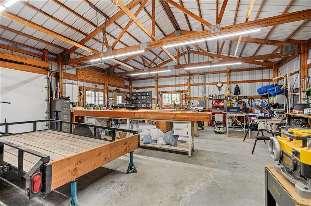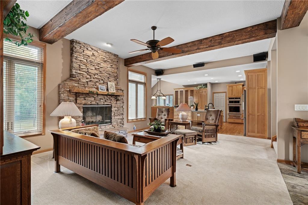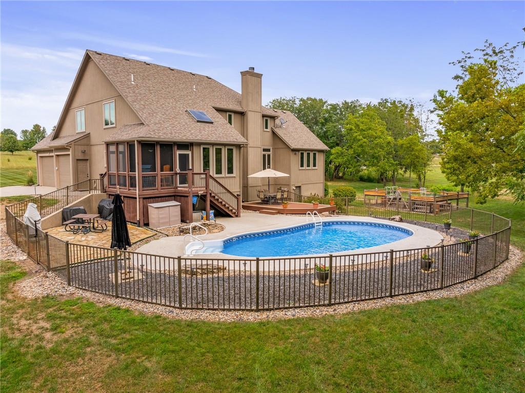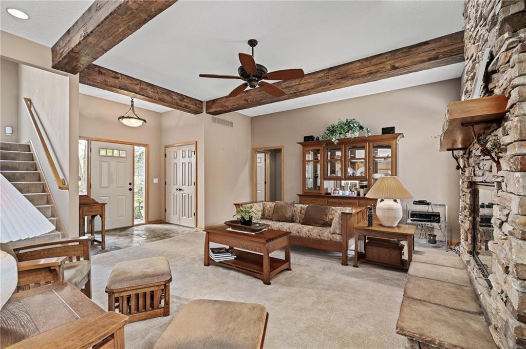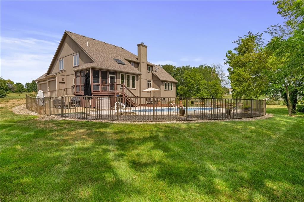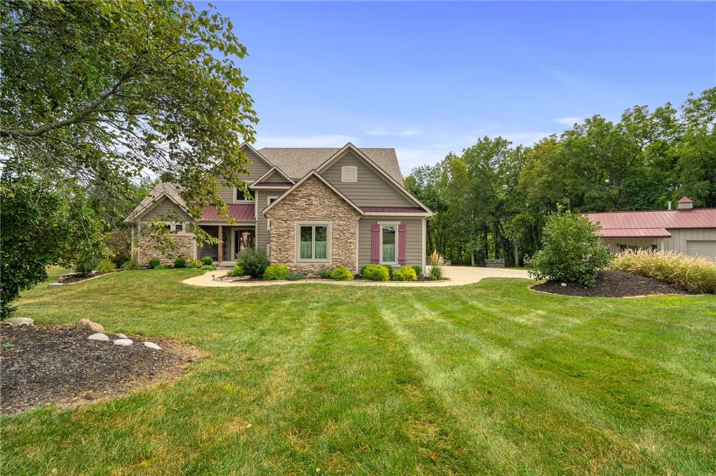 This stunning 1.5-Story custom-built Lodge-Style home offers 4 bedrooms, 2.5 baths, an open floor plan, all set on 3 acres w/the ultimate country lifestyle. A 2 minute walk finds you fishing or kayaking the 2.5-acre community pond stocked with multiple fishes.The home overlooks scenic woods where wildlife abounds. Car lovers and hobbyists will appreciate the incredible 45x29 Morton Bldg (SHOP) just across the driveway.The 2 garage bays here give you a total of 5 bays. BONUS -behind the SHOP is a 42x12 RV pad w/30 AMP service.Turning to the inside, a rustic elegance awaits you w/natural pecan flooring and woodwork. You'll be greeted immediately to a beautiful dry-stacked stone wood burning fireplace with a one of a kind, hand-carved mantle. The Great Room features 10’ ceilings w/massive hand-hewn beams.The kitchen will impress with all high-end appliances and large quartz center island. You won't believe the 10x6 pantry. Enjoy the custom "Cafe Booth" for that quick breakfast. The custom built-in hutch will astonish you.The laundry room has an oversized stainless steel sink/built-in ironing board and folding counter. The primary suite includes a daylight-lit walk-in closet and built-in desk. Upstairs a 19x10 loft is perfect for a home office. Also find 2 bedrooms and a 22x20 bonus room/bedroom. The daylight walkout basement (9’ ceilings) is stubbed for a bathroom. Here you'll find a "Safe Room". Step outside your screened in porch overlooking the pool to your personal oasis:a large in-ground swimming pool & massive deck along with a custom built critter-proof garden. Timber Trace Ranch is home to just 62 residences, carefully designed for privacy & a strong connection to nature. Hillsdale Lake and State Park is just one mile away. You’ll enjoy fishing, boating, kayaking, jet skiing, camping, with a sandy public beach.This is privacy in the country at its best—all while being minutes from urban conveniences. Don’t miss your chance to tour this extraordinary home today!