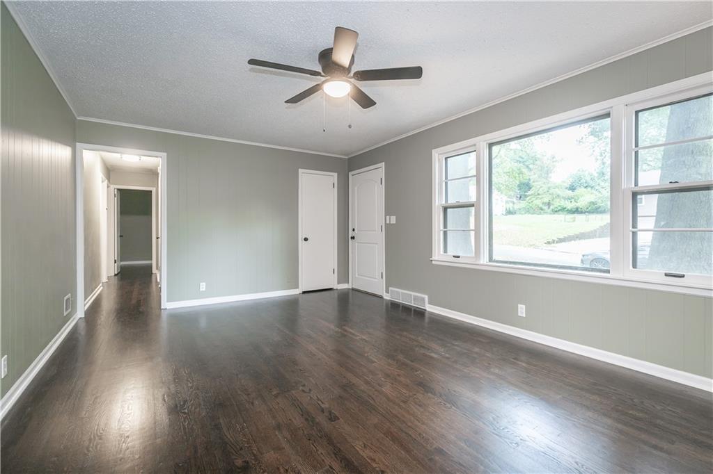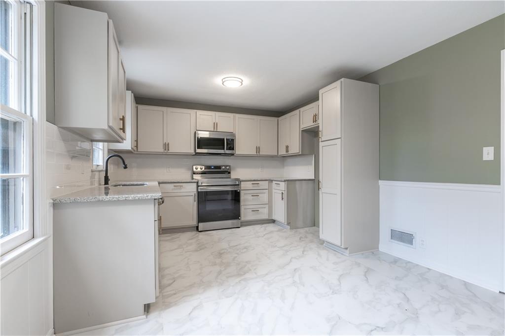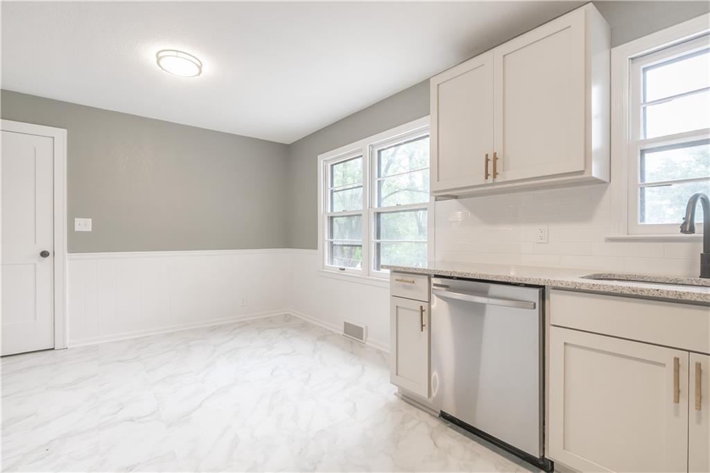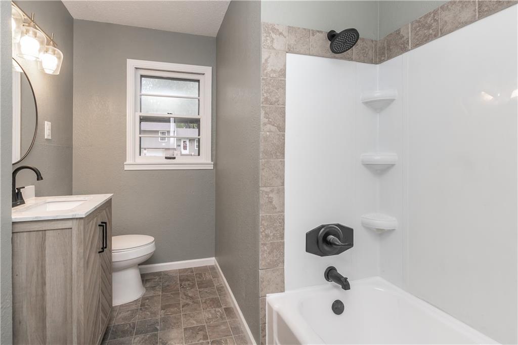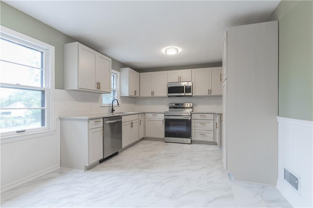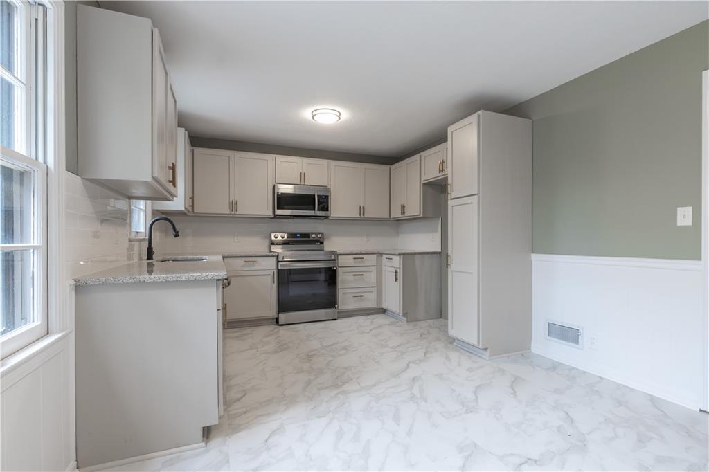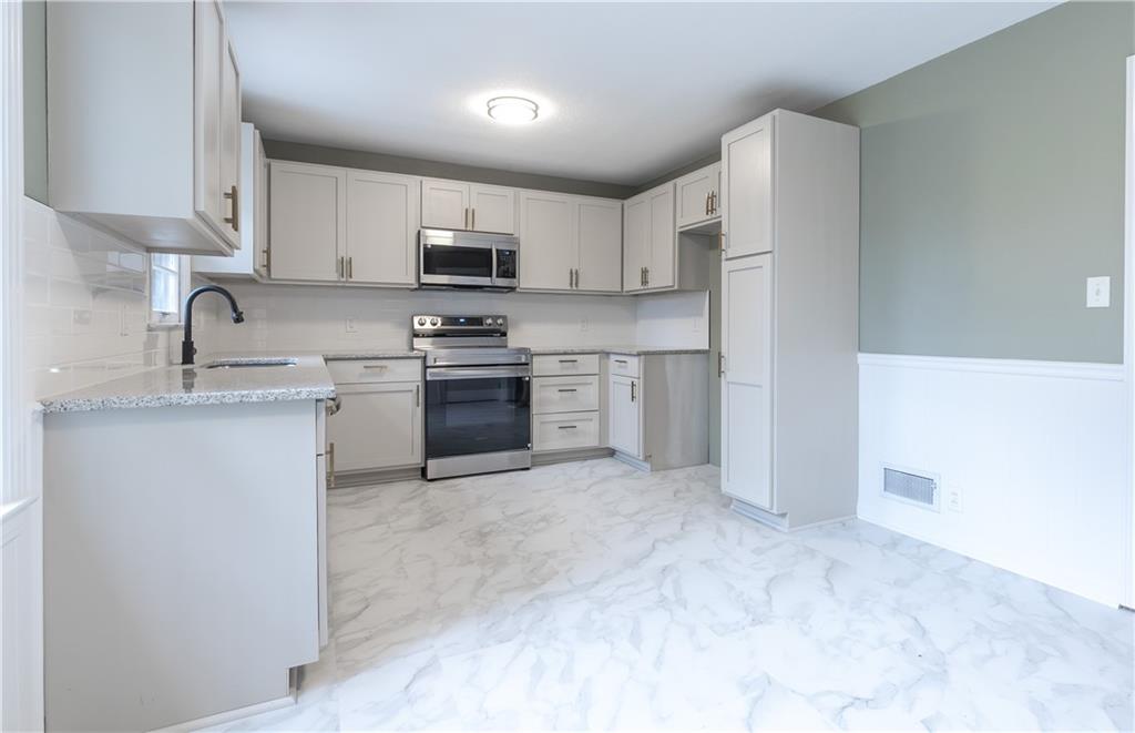 Welcome to this beautifully remodeled 3 bedroom, 3 bathroom ranch! The main level features refinished hardwood floors, a brand new kitchen with custom cabinets, granite countertops and a pantry, a cozy living room with a fireplace, three bedrooms including a primary suite with private bath, and an additional full hall bath. A convenient two car garage completes the main level. The finished walkout basement offers a spacious family room, featuring a fireplace, a wet bar, a third full bathroom, laundry area, and plenty of storage. Step outside to enjoy the covered patio overlooking the fenced backyard. The yard also includes a large shed with electricity, perfect for a workshop or extra storage. With thoughtful updates throughout and plenty of space indoors and out, this home is truly move in ready!