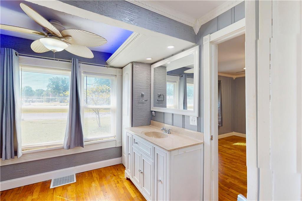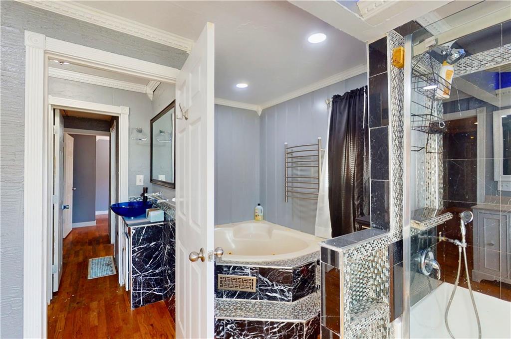 Experience the perfect blend of location and luxury in this spacious home. The intuitive floor plan makes it easy to navigate and ideal for both daily life and entertaining. The kitchen, with its multiple access points and a designated serving space, is both practical and stylish, set off by a beautiful custom backsplash. The master bathroom redefines relaxation. Sink into the jetted tub, where a built-in mini-refrigerator keeps your favorite drinks chilled and a clever storage spot holds your glasses. Set the mood with custom lighting and enjoy your favorite music through the integrated Bluetooth speakers. This home has a unique charm and features that make it a must-see.