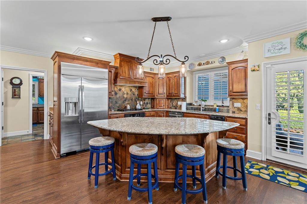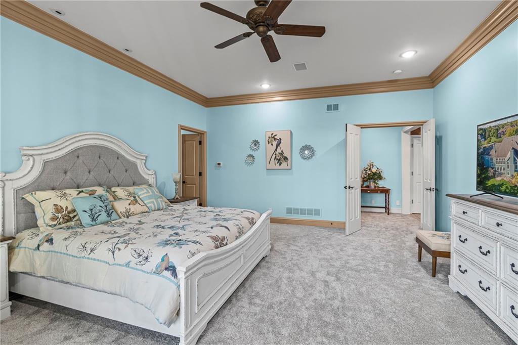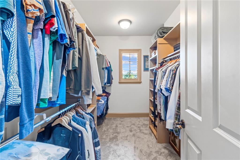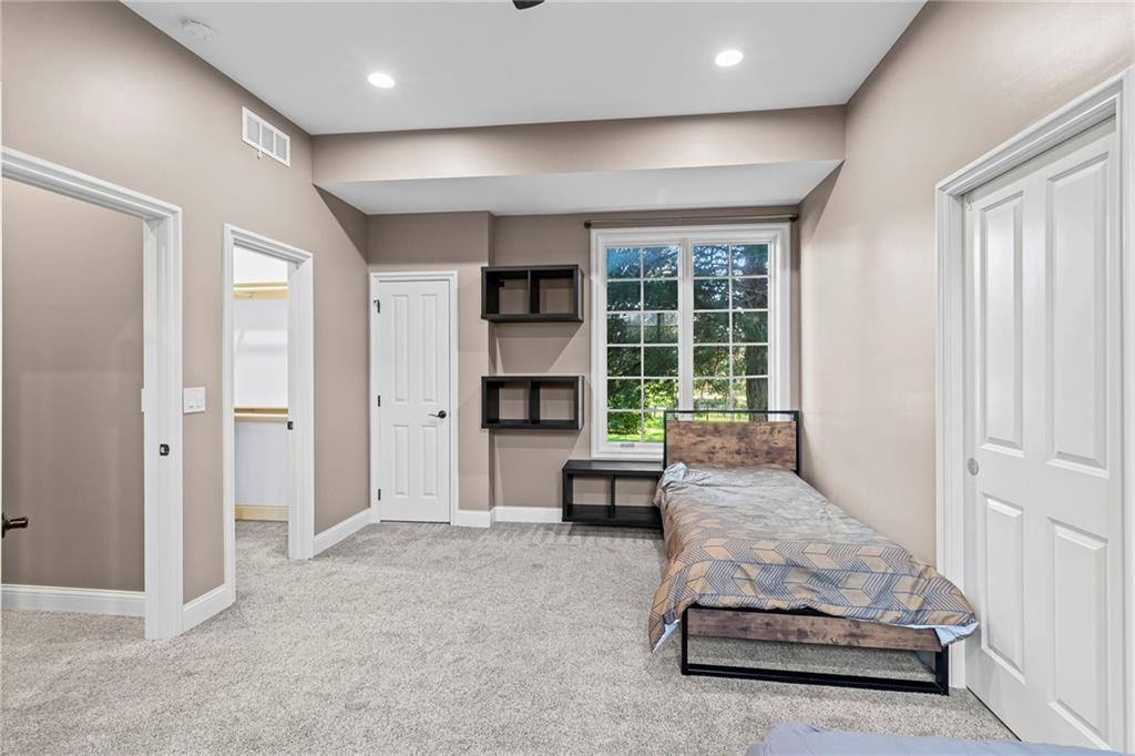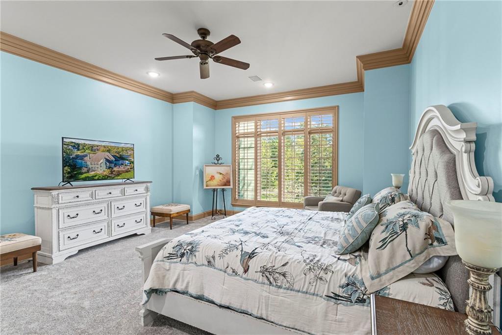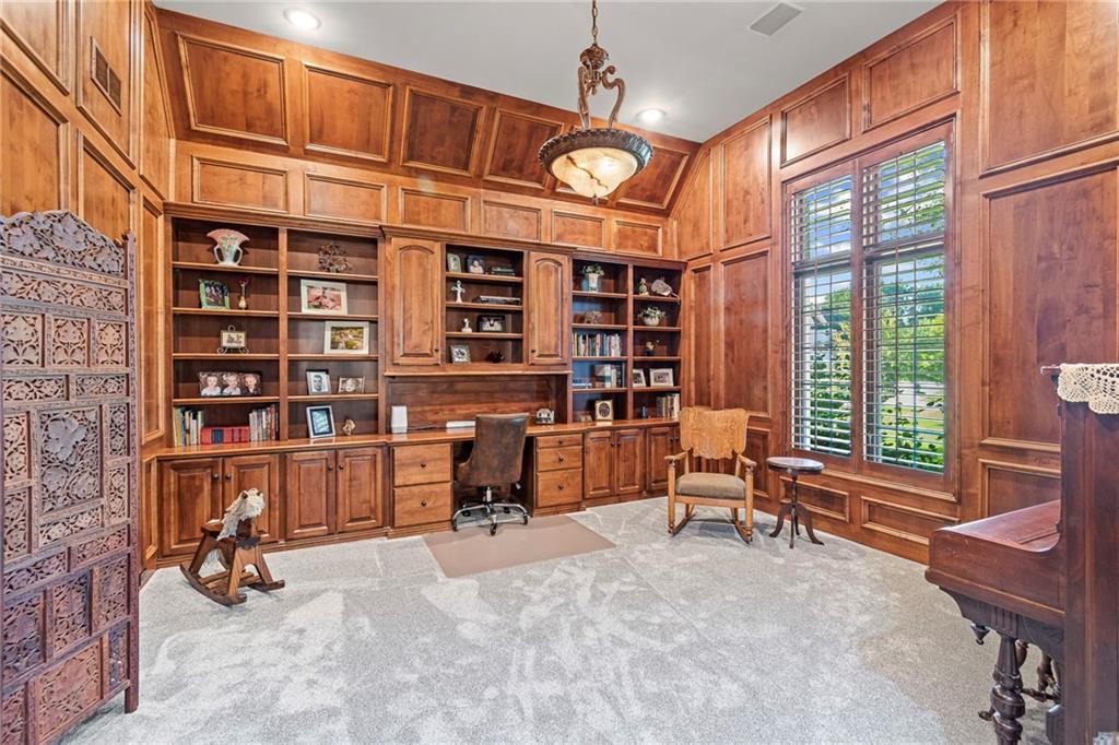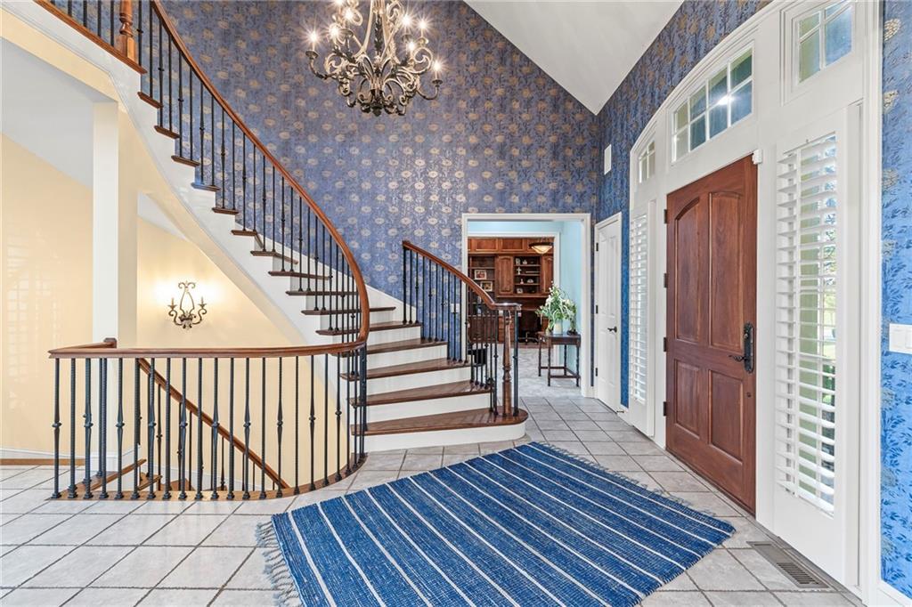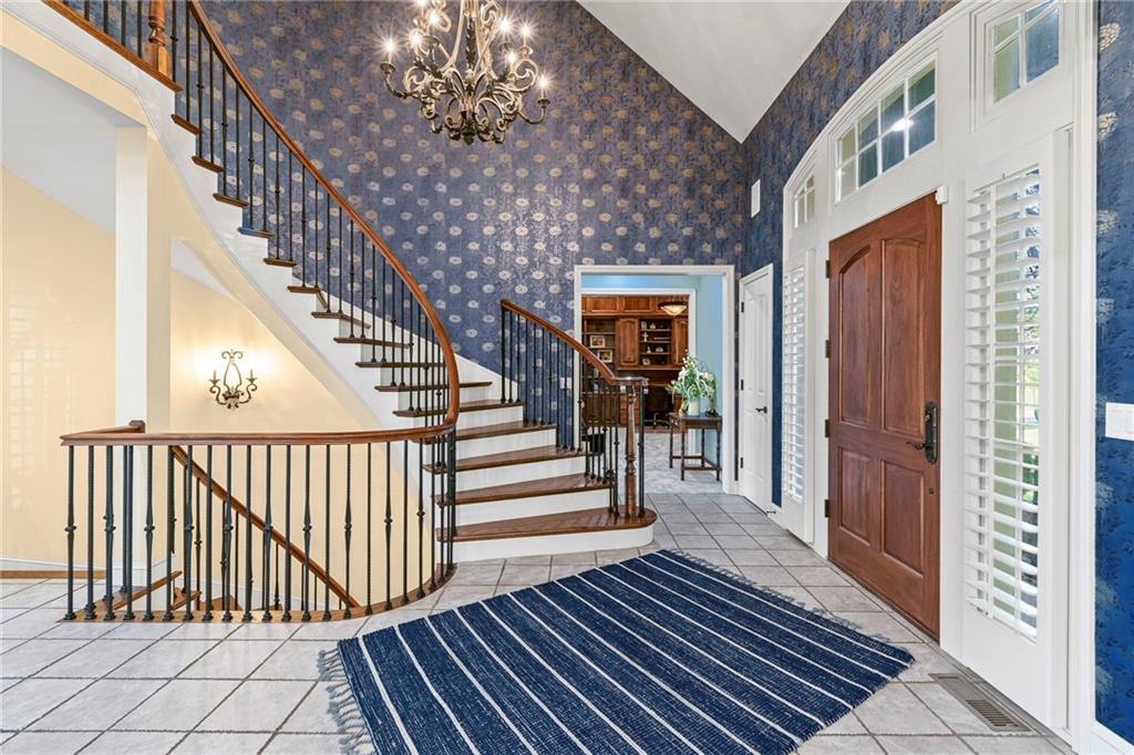 Multi-generational Estate size home with 2 primary suites and a 4 car side entry garage offers privacy on this 1+ acre lot. Additional square footage in the lower level has been professionally finished adding 2 bedrooms and 2 bathrooms to this home. Outside boast lots of trees, landscaping, a water feature, firepit & 2 patios. Upon entering you are greeted with a stunning 2 story circular staircase, plantation shutters, library with floor to ceiling built-ins, large Primary suite with new carpet, walk in shower and 2 closets. There are beautiful hardwood and carpet on the main level with a formal living and dinning room. Large chef's kitchen featuring gas cooktop, island, double ovens and pantry. The hearthroom has a beautiful stone fireplace, built ins and wet bar. Upstairs has 3 bedrooms with private baths, second laundry. New carpet upstairs in 2 bedrooms and hall. Walkout lower level w/full kitchen, rec room, 3rd fireplace, second primary suite and additional bedroom w/bath. 4 car Garage has floor to ceiling cabinets a 2nd separate staircase to the basement. This home a plenty of space for entertaining.