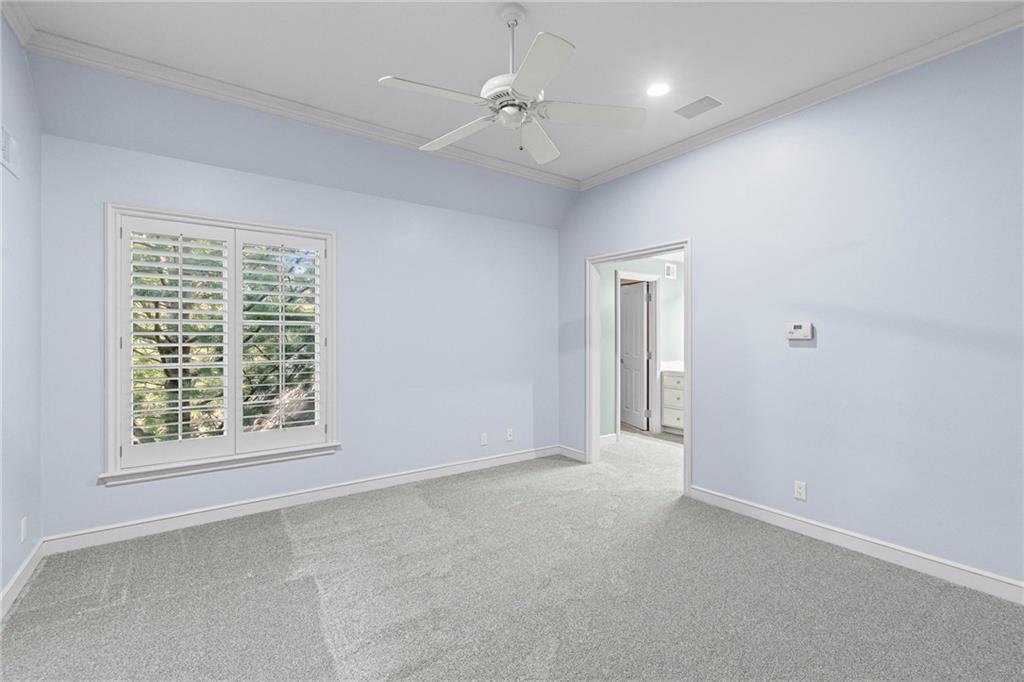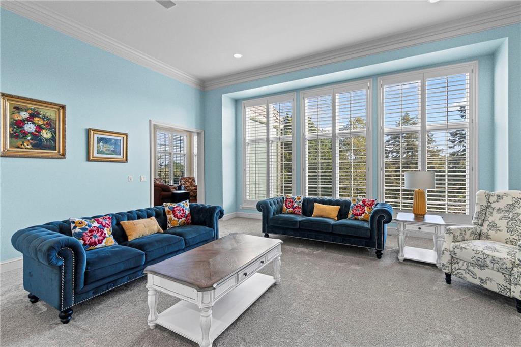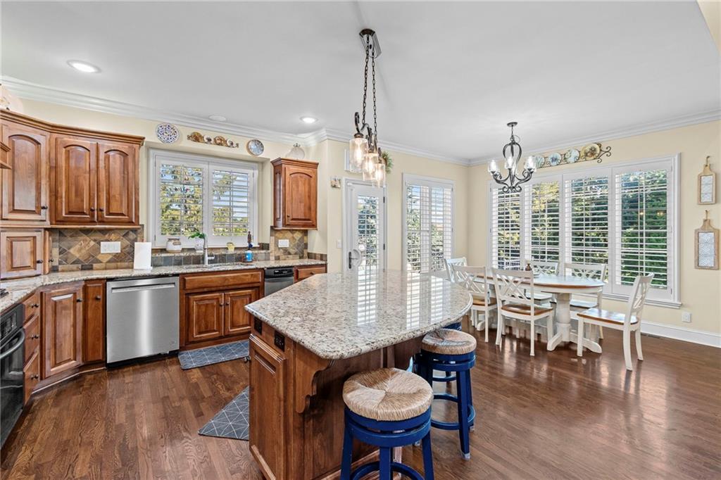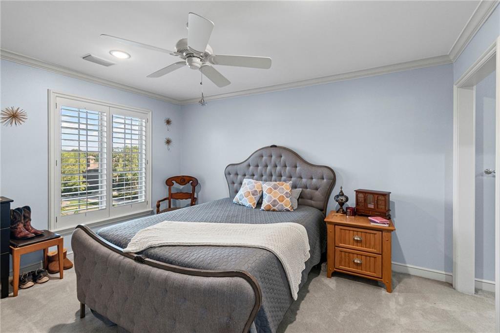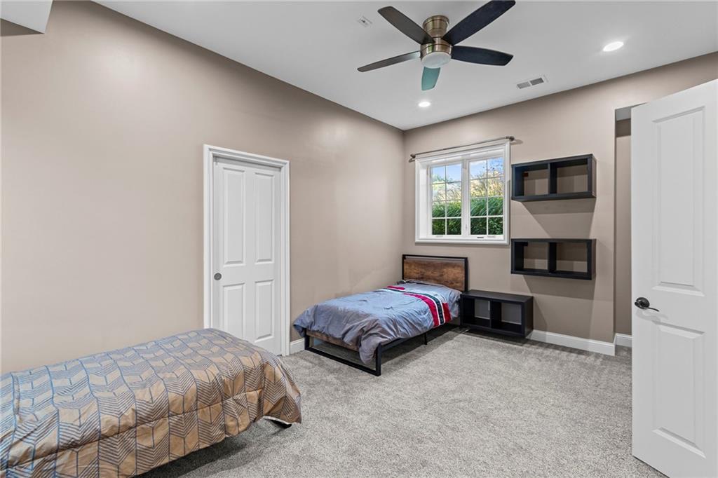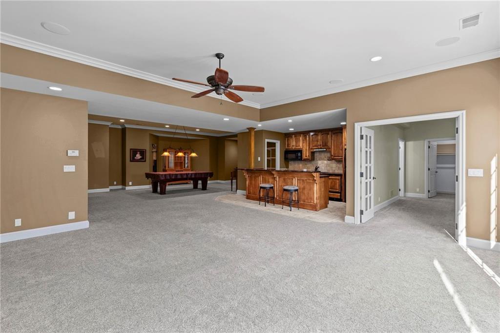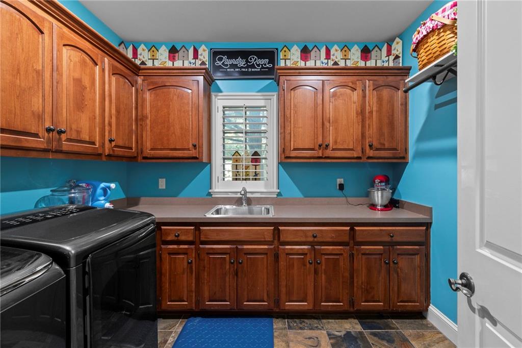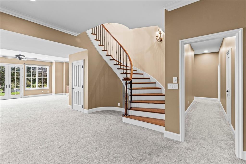Multi-generational Estate size home with 2 primary suites and a 4 car side entry garage offers privacy on this 1+ acre lot. Additional square footage in the lower level has been professionally finished adding 2 bedrooms and 2 bathrooms to this home. Outside boast lots of trees, landscaping, a water feature, firepit & 2 patios. Upon entering you are greeted with a stunning 2 story circular staircase, plantation shutters, library with floor to ceiling built-ins, large Primary suite with new carpet, walk in shower and 2 closets. There are beautiful hardwood and carpet on the main level with a formal living and dinning room. Large chef's kitchen featuring gas cooktop, island, double ovens and pantry. The hearthroom has a beautiful stone fireplace, built ins and wet bar. Upstairs has 3 bedrooms with private baths, second laundry. New carpet upstairs in 2 bedrooms and hall. Walkout lower level w/full kitchen, rec room, 3rd fireplace, second primary suite and additional bedroom w/bath. 4 car Garage has floor to ceiling cabinets a 2nd separate staircase to the basement. This home a plenty of space for entertaining.