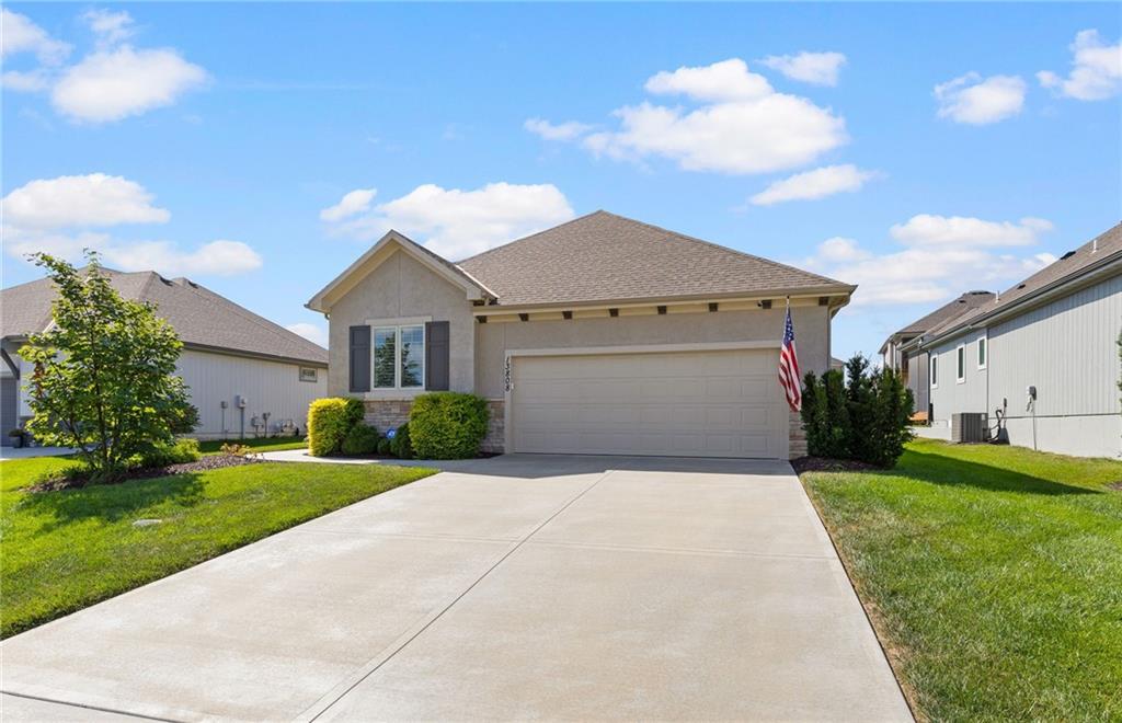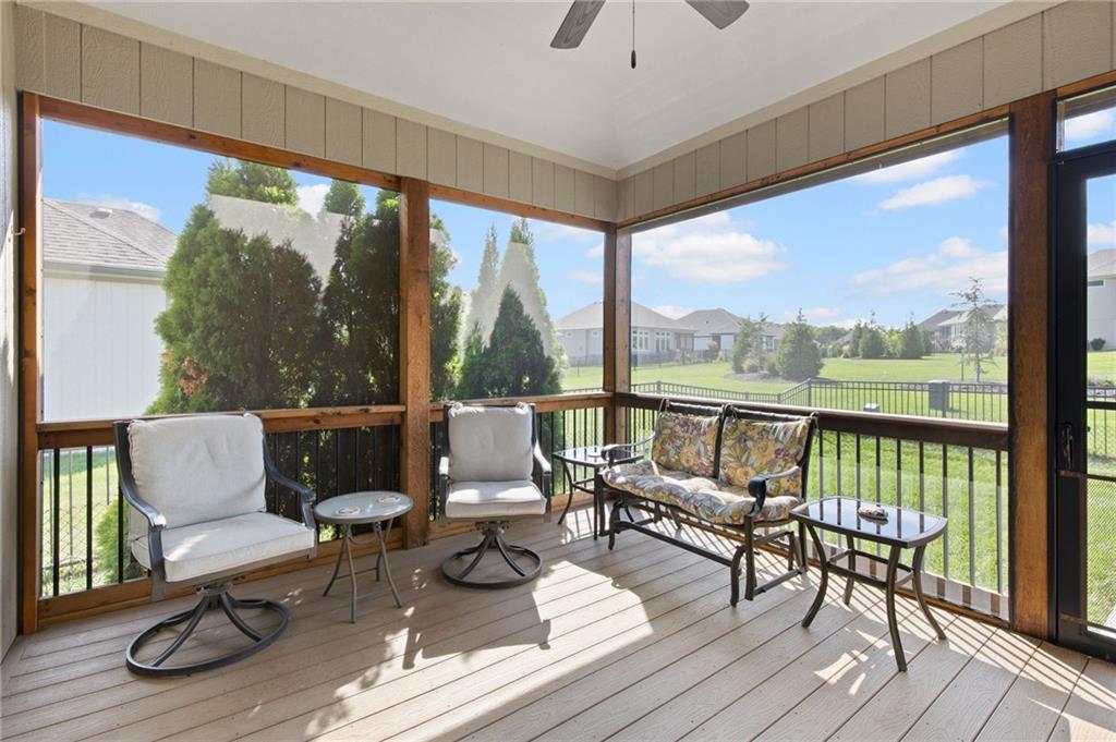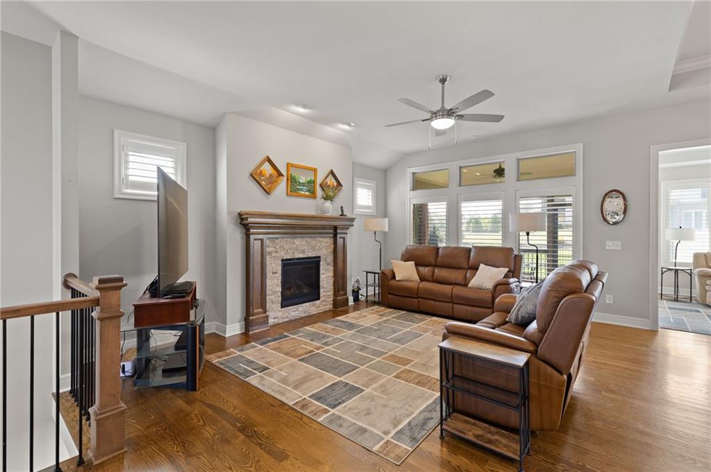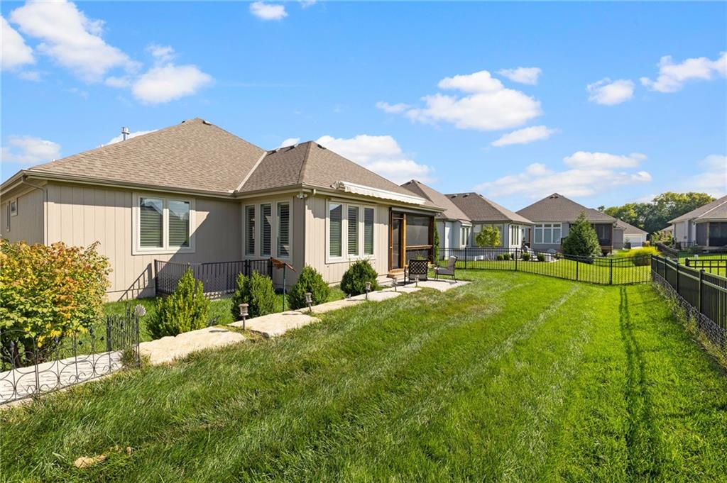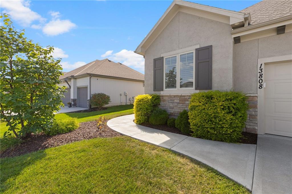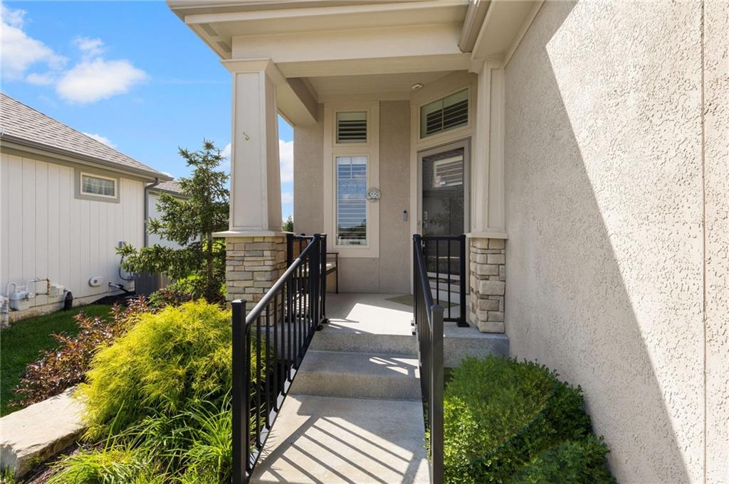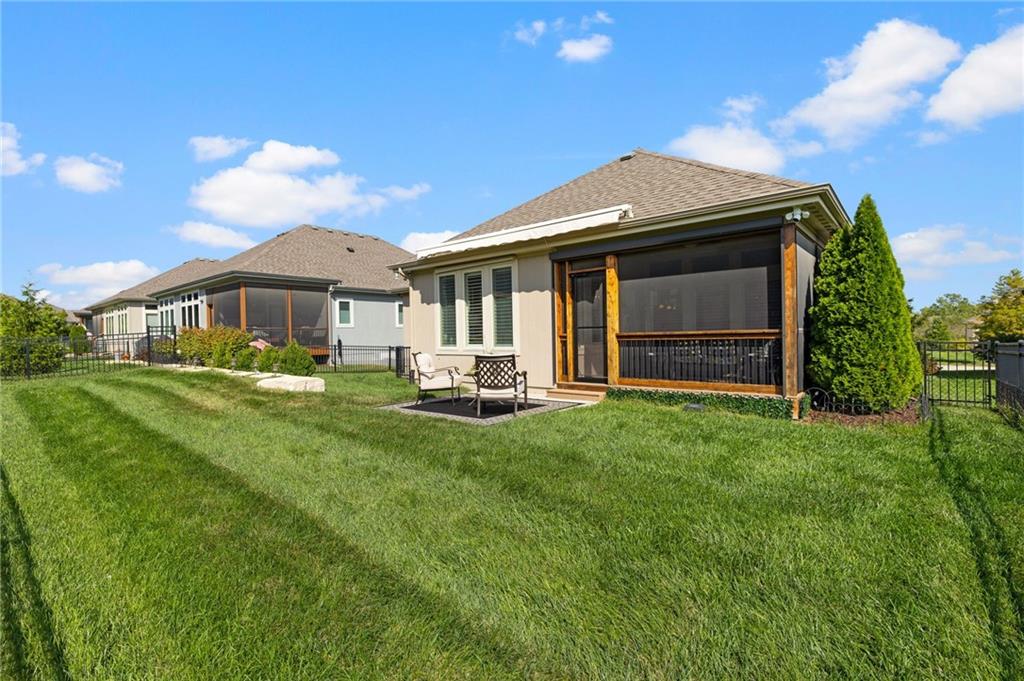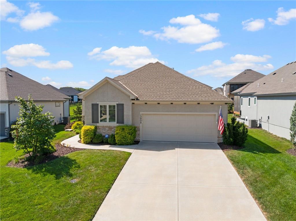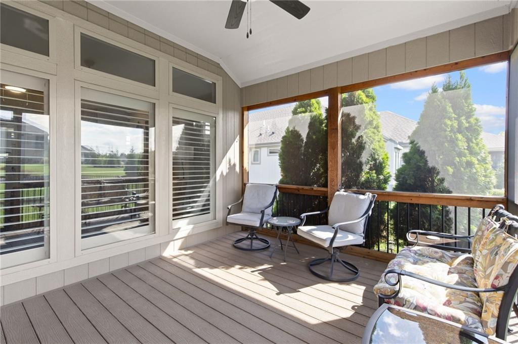 Nearly new patio villa in sought-after Solera Reserve offers maintenance-provided living in a friendly, walkable neighborhood with lush, green, manicured lawns and beautiful landscaping. The inviting stucco exterior with stone ledge accents and cedar shutters set the tone as you step onto the covered front porch and through the angled full glass storm door onto hardwood floors that extend through the hallway and main living areas. Plantation shutters provide timeless character throughout the main level. A vaulted second bedroom and nearby full bath with granite counters, tile flooring, and shower/tub combo are perfect for guests or a home office. The open concept great room features hardwoods, a gas fireplace with stone surround, and large windows overlooking the covered, screened-in deck. The kitchen is a showstopper with a granite island and breakfast bar, stainless appliances including gas stove and refrigerator, vent hood, coffee bar, under-cabinet lighting, and walk-in pantry, with direct access to the laundry room. The sunny breakfast area opens to a four-season sunroom that flows to the screened-in deck, ideal for entertaining or quiet evenings at home. The primary suite boasts a stepped ceiling, ceiling fan, plush carpet, and spa-like bath with granite counters and oversized Euro shower, plus an expansive walk-in closet connecting to the laundry. The finished lower level includes a spacious rec room with granite wet bar, egress window, and two bedrooms, each with egress windows, along with a full bath. Extras include washer/dryer, sprinkler system, security system, radon mitigation, sump pump with battery backup, Sun Setter awning, tankless water heater, whole house water filter, and Generac generator. Enjoy a resort-style lifestyle with community pool, clubhouse, lawn care, trimming, snow removal, and sprinkler winterization included.