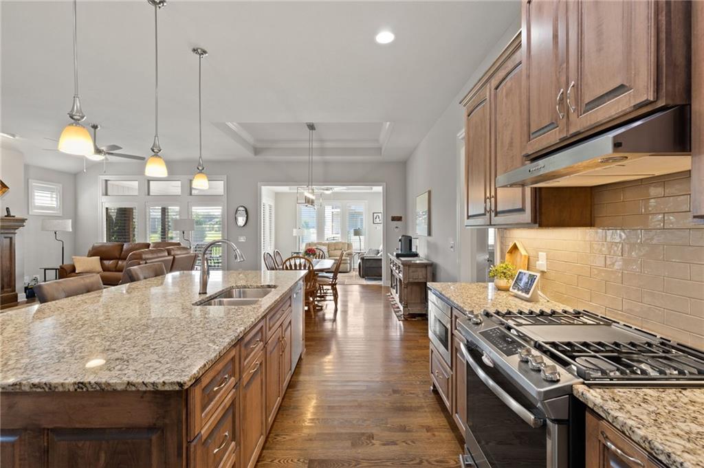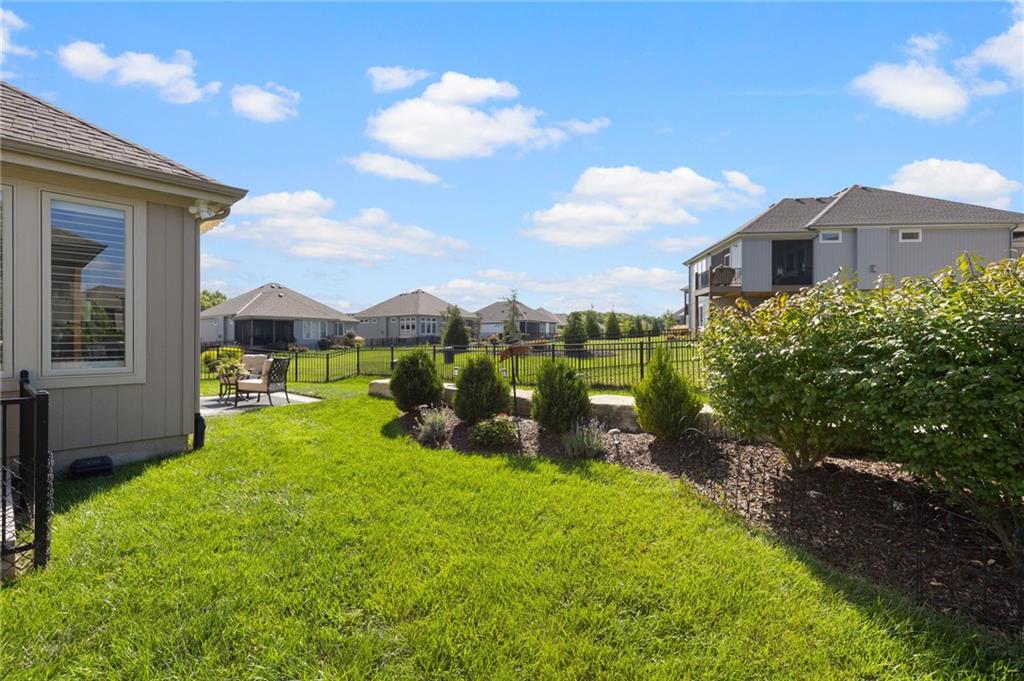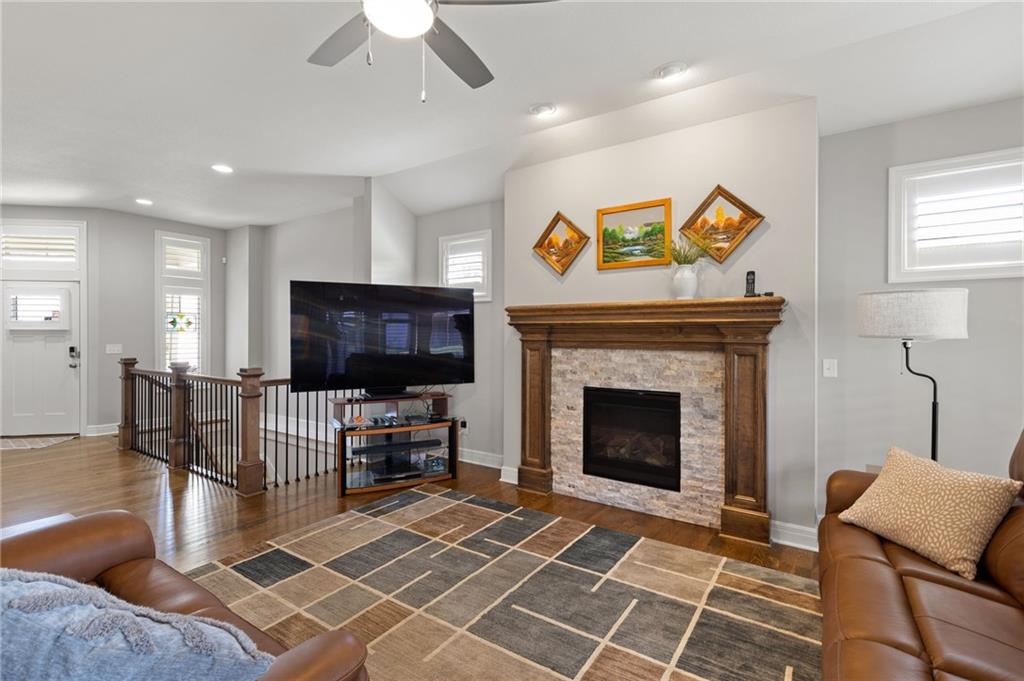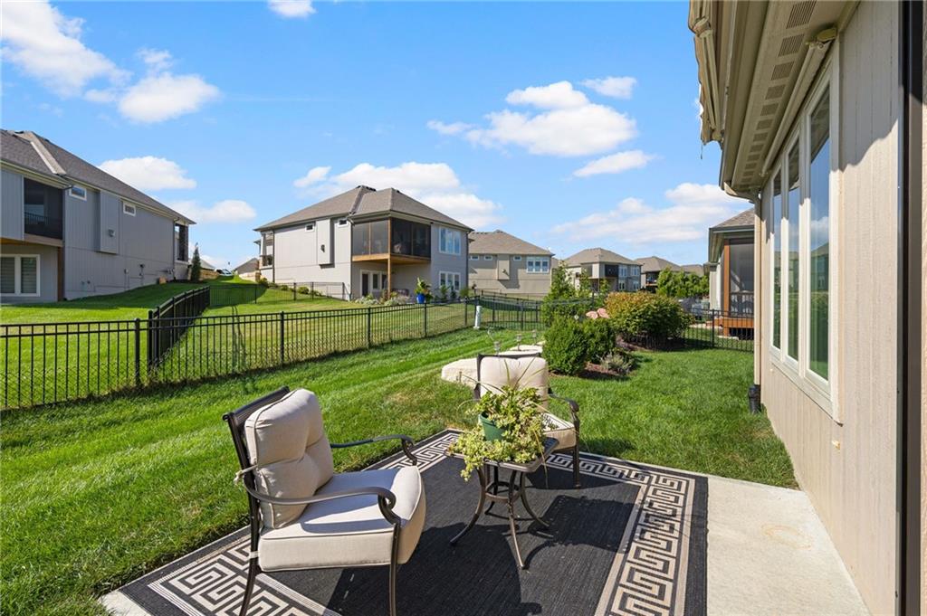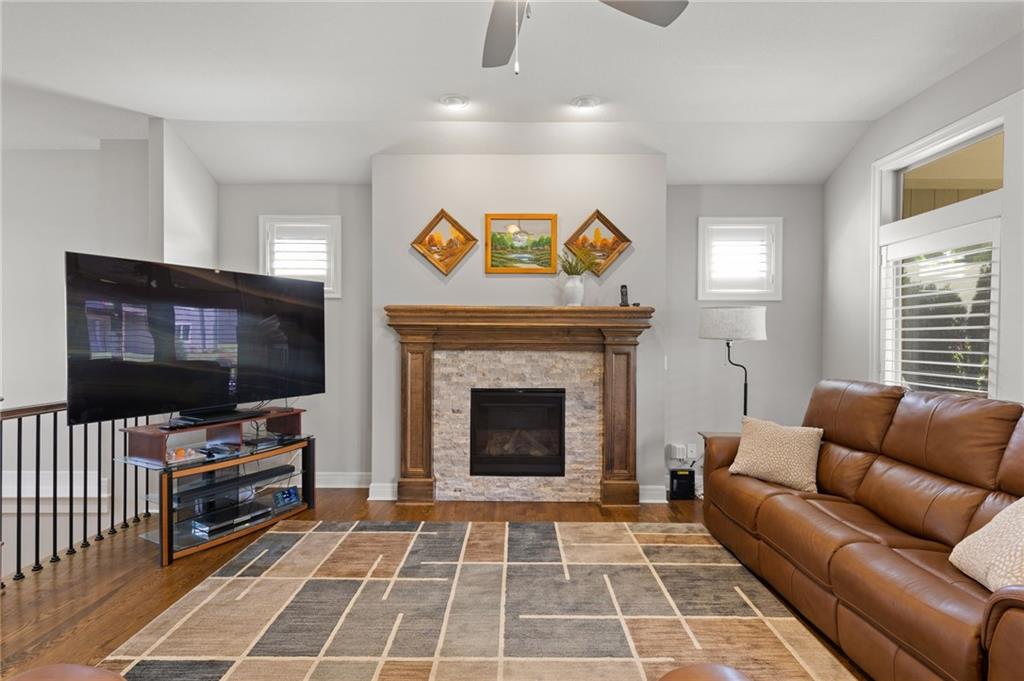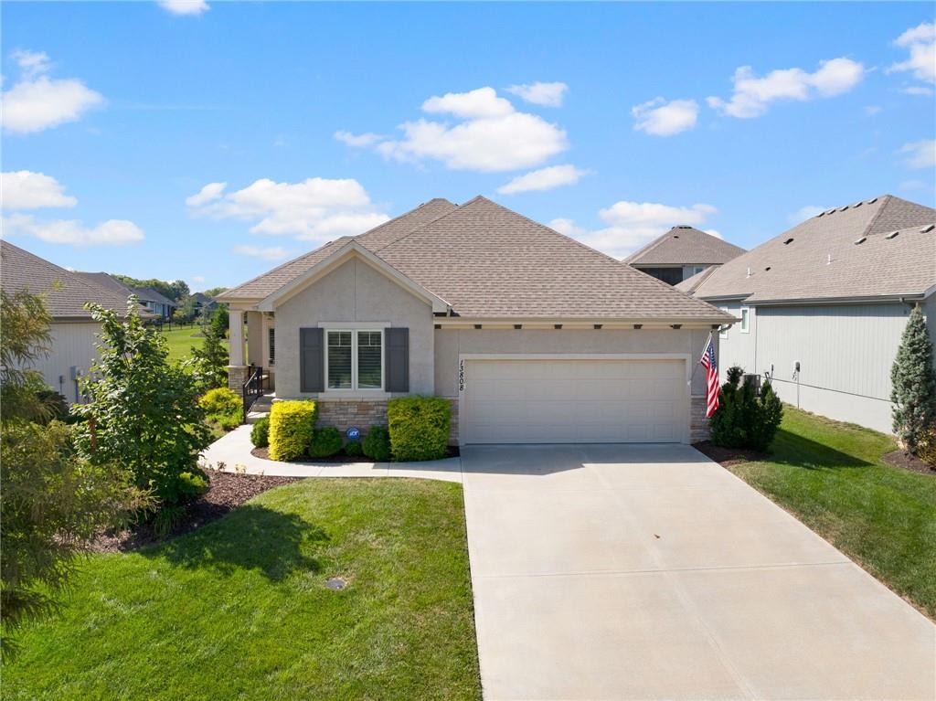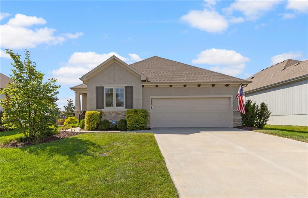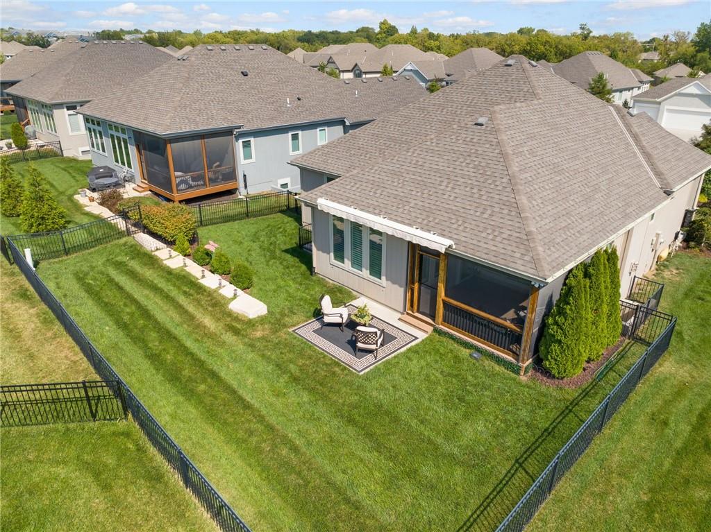 Nearly new patio villa in sought-after Solera Reserve offers maintenance-provided living in a friendly, walkable neighborhood with lush, green, manicured lawns and beautiful landscaping. The inviting stucco exterior with stone ledge accents and cedar shutters set the tone as you step onto the covered front porch and through the angled full glass storm door onto hardwood floors that extend through the hallway and main living areas. Plantation shutters provide timeless character throughout the main level. A vaulted second bedroom and nearby full bath with granite counters, tile flooring, and shower/tub combo are perfect for guests or a home office. The open concept great room features hardwoods, a gas fireplace with stone surround, and large windows overlooking the covered, screened-in deck. The kitchen is a showstopper with a granite island and breakfast bar, stainless appliances including gas stove and refrigerator, vent hood, coffee bar, under-cabinet lighting, and walk-in pantry, with direct access to the laundry room. The sunny breakfast area opens to a four-season sunroom that flows to the screened-in deck, ideal for entertaining or quiet evenings at home. The primary suite boasts a stepped ceiling, ceiling fan, plush carpet, and spa-like bath with granite counters and oversized Euro shower, plus an expansive walk-in closet connecting to the laundry. The finished lower level includes a spacious rec room with granite wet bar, egress window, and two bedrooms, each with egress windows, along with a full bath. Extras include washer/dryer, sprinkler system, security system, radon mitigation, sump pump with battery backup, Sun Setter awning, tankless water heater, whole house water filter, and Generac generator. Enjoy a resort-style lifestyle with community pool, clubhouse, lawn care, trimming, snow removal, and sprinkler winterization included.