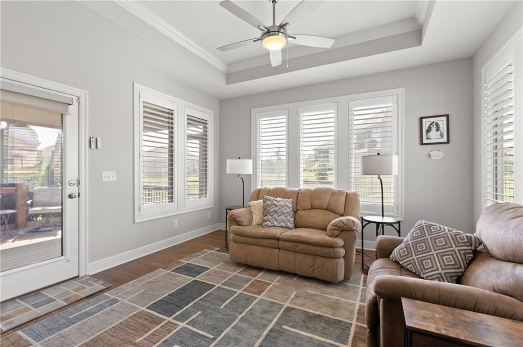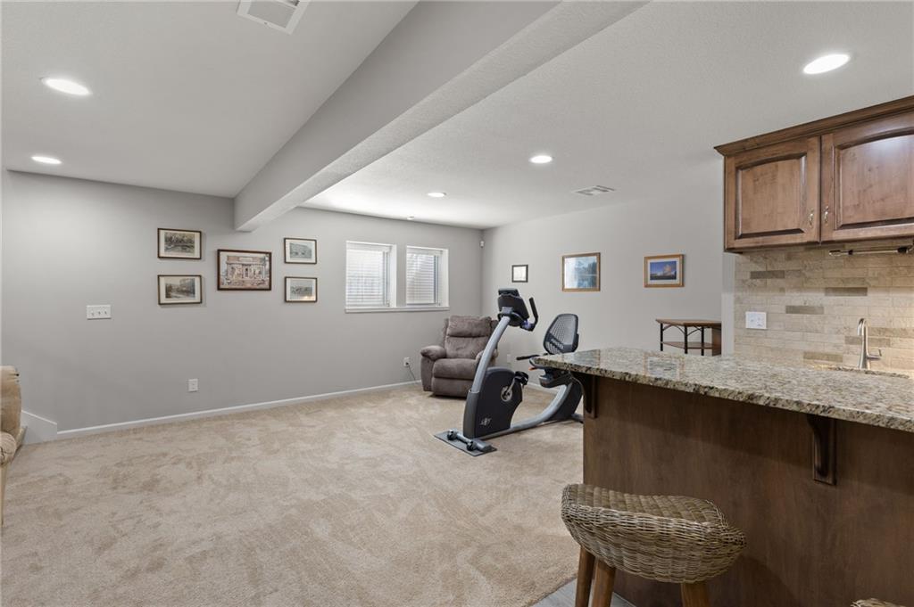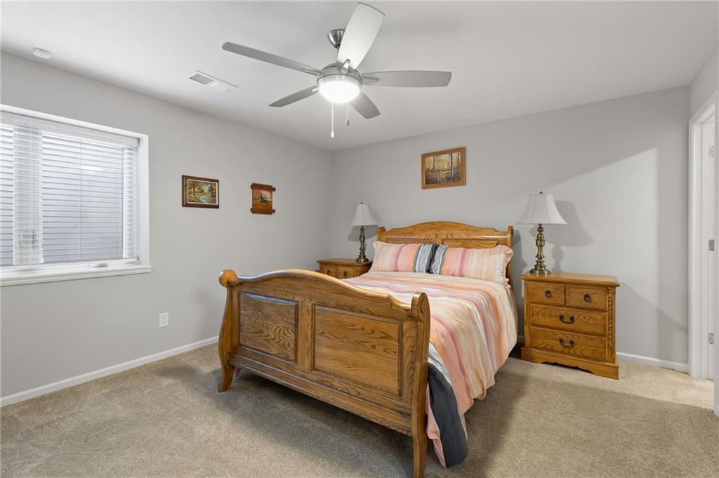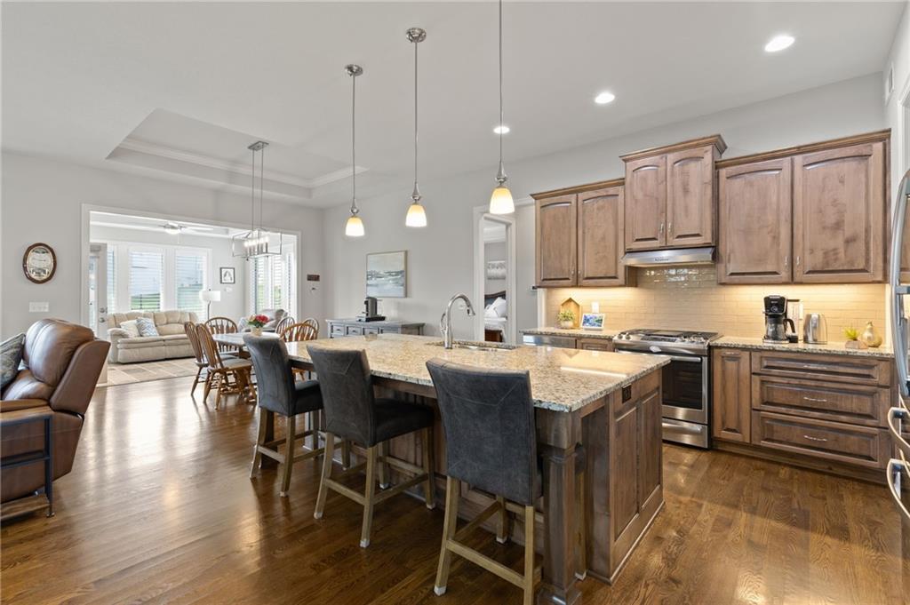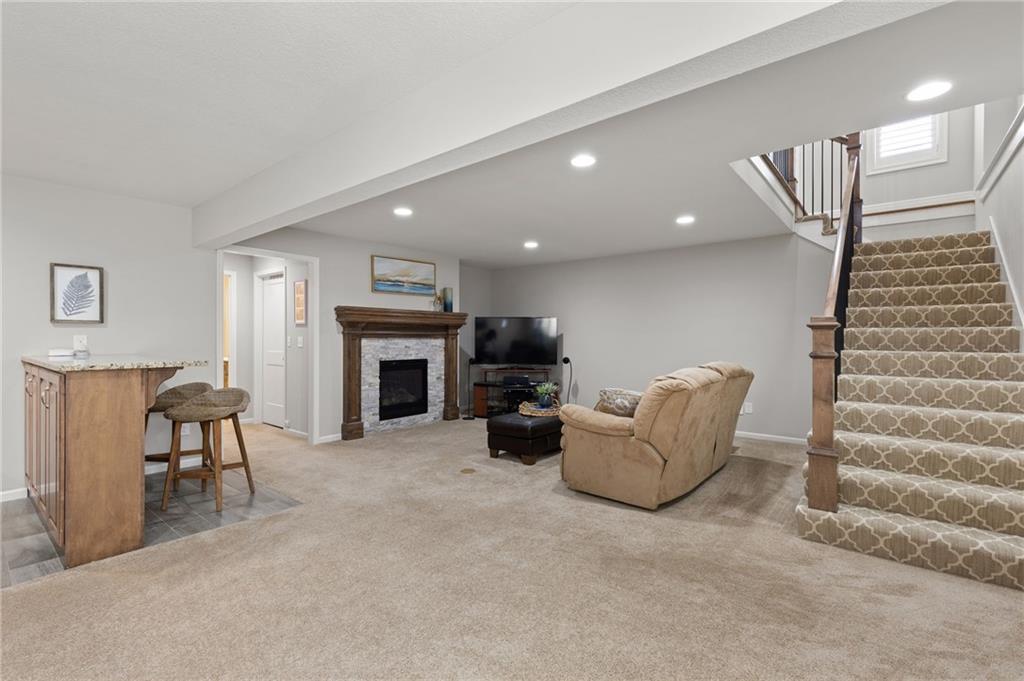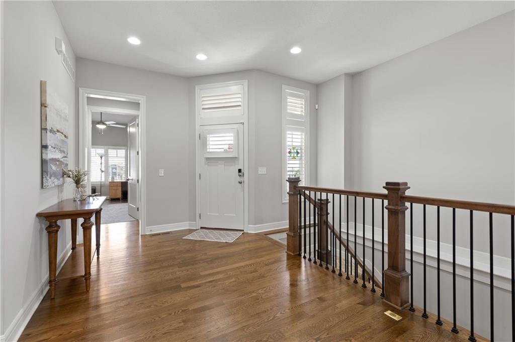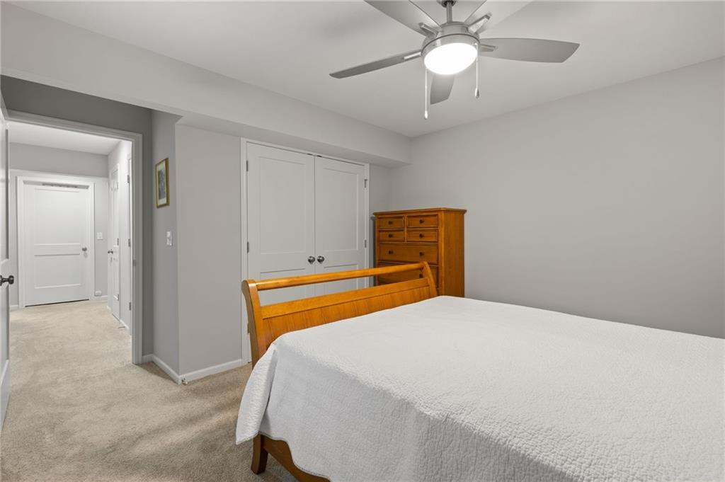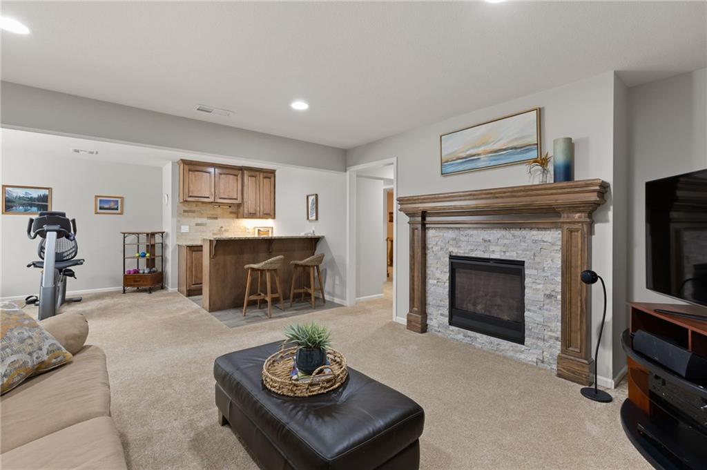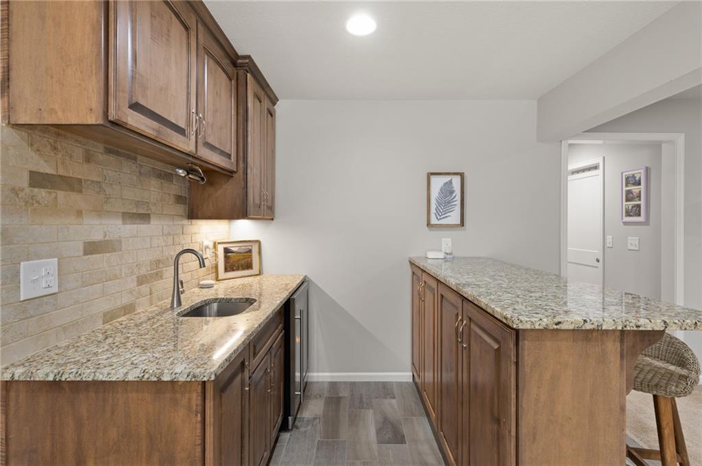 Nearly new patio villa in sought-after Solera Reserve offers maintenance-provided living in a friendly, walkable neighborhood with lush, green, manicured lawns and beautiful landscaping. The inviting stucco exterior with stone ledge accents and cedar shutters set the tone as you step onto the covered front porch and through the angled full glass storm door onto hardwood floors that extend through the hallway and main living areas. Plantation shutters provide timeless character throughout the main level. A vaulted second bedroom and nearby full bath with granite counters, tile flooring, and shower/tub combo are perfect for guests or a home office. The open concept great room features hardwoods, a gas fireplace with stone surround, and large windows overlooking the covered, screened-in deck. The kitchen is a showstopper with a granite island and breakfast bar, stainless appliances including gas stove and refrigerator, vent hood, coffee bar, under-cabinet lighting, and walk-in pantry, with direct access to the laundry room. The sunny breakfast area opens to a four-season sunroom that flows to the screened-in deck, ideal for entertaining or quiet evenings at home. The primary suite boasts a stepped ceiling, ceiling fan, plush carpet, and spa-like bath with granite counters and oversized Euro shower, plus an expansive walk-in closet connecting to the laundry. The finished lower level includes a spacious rec room with granite wet bar, egress window, and two bedrooms, each with egress windows, along with a full bath. Extras include washer/dryer, sprinkler system, security system, radon mitigation, sump pump with battery backup, Sun Setter awning, tankless water heater, whole house water filter, and Generac generator. Enjoy a resort-style lifestyle with community pool, clubhouse, lawn care, trimming, snow removal, and sprinkler winterization included.