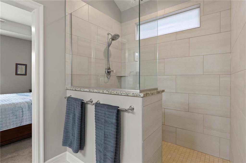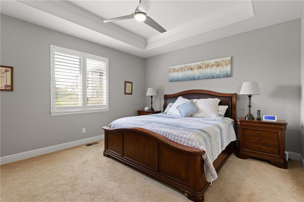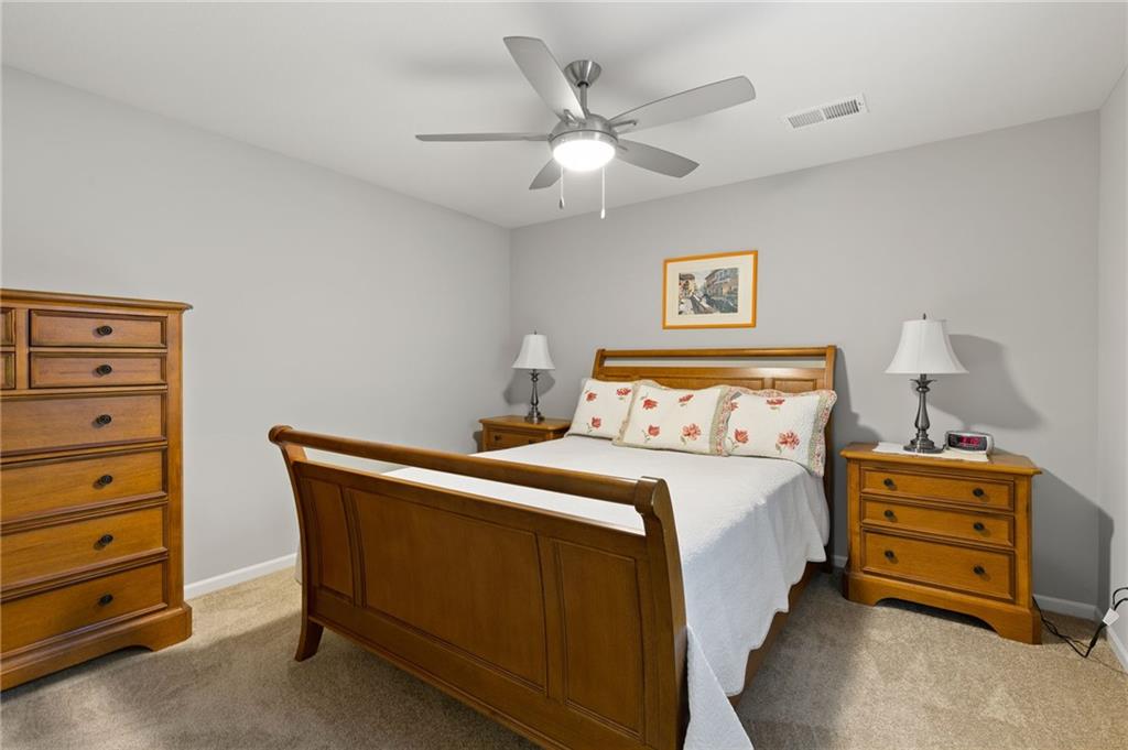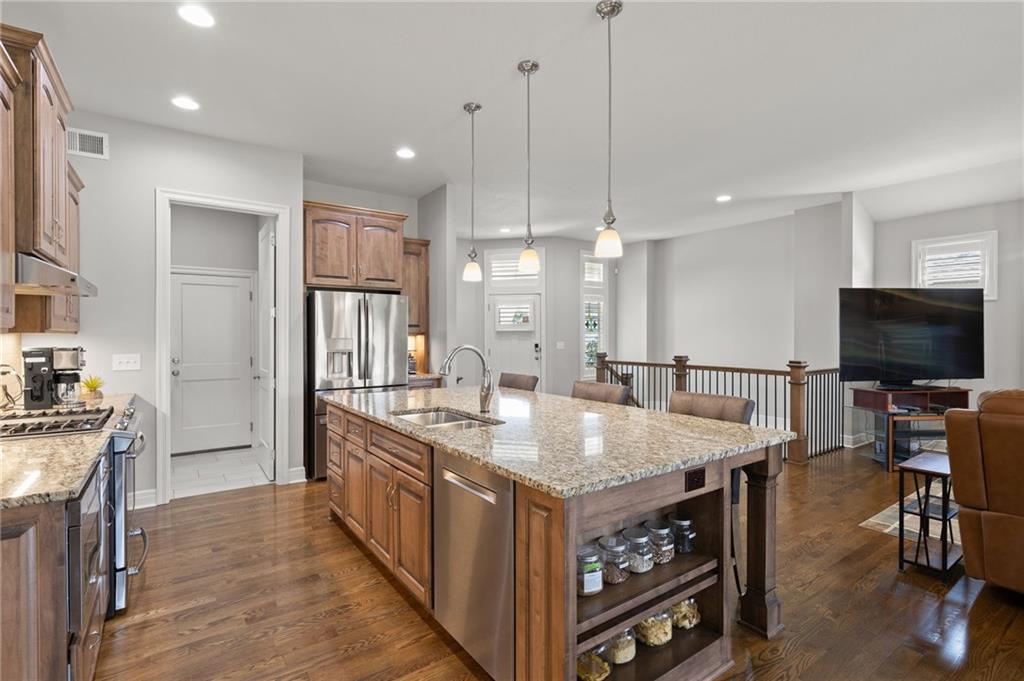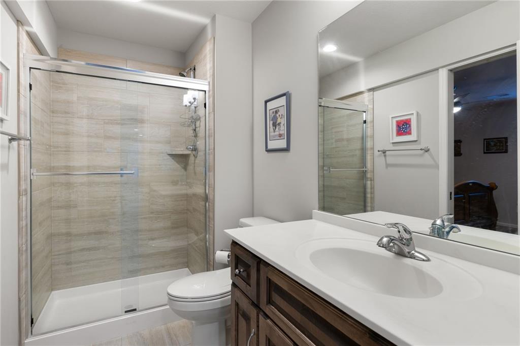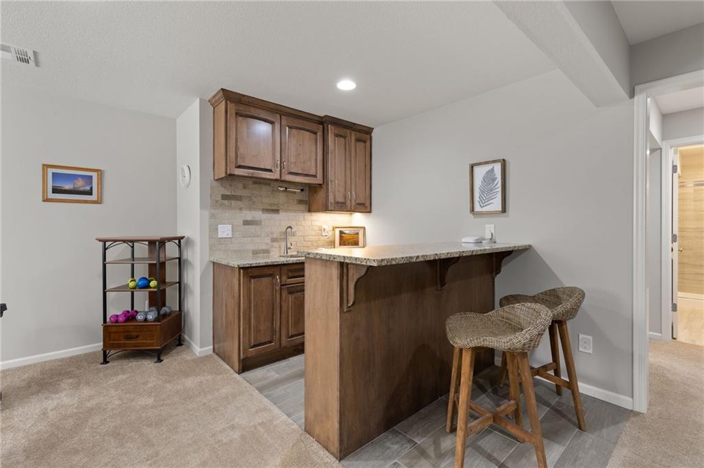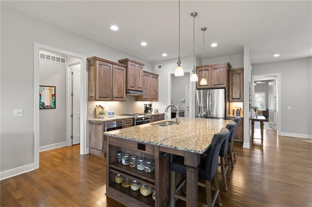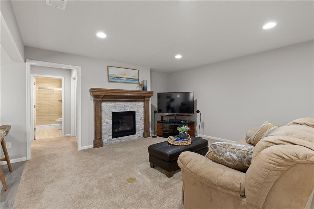 Nearly new patio villa in sought-after Solera Reserve offers maintenance-provided living in a friendly, walkable neighborhood with lush, green, manicured lawns and beautiful landscaping. The inviting stucco exterior with stone ledge accents and cedar shutters set the tone as you step onto the covered front porch and through the angled full glass storm door onto hardwood floors that extend through the hallway and main living areas. Plantation shutters provide timeless character throughout the main level. A vaulted second bedroom and nearby full bath with granite counters, tile flooring, and shower/tub combo are perfect for guests or a home office. The open concept great room features hardwoods, a gas fireplace with stone surround, and large windows overlooking the covered, screened-in deck. The kitchen is a showstopper with a granite island and breakfast bar, stainless appliances including gas stove and refrigerator, vent hood, coffee bar, under-cabinet lighting, and walk-in pantry, with direct access to the laundry room. The sunny breakfast area opens to a four-season sunroom that flows to the screened-in deck, ideal for entertaining or quiet evenings at home. The primary suite boasts a stepped ceiling, ceiling fan, plush carpet, and spa-like bath with granite counters and oversized Euro shower, plus an expansive walk-in closet connecting to the laundry. The finished lower level includes a spacious rec room with granite wet bar, egress window, and two bedrooms, each with egress windows, along with a full bath. Extras include washer/dryer, sprinkler system, security system, radon mitigation, sump pump with battery backup, Sun Setter awning, tankless water heater, whole house water filter, and Generac generator. Enjoy a resort-style lifestyle with community pool, clubhouse, lawn care, trimming, snow removal, and sprinkler winterization included.