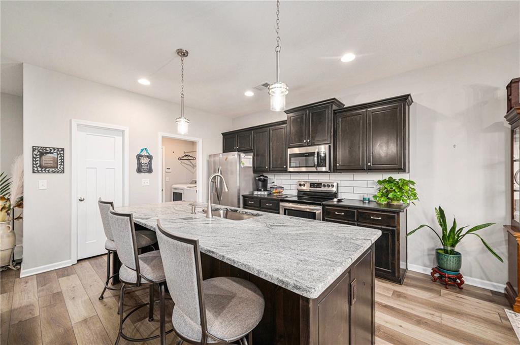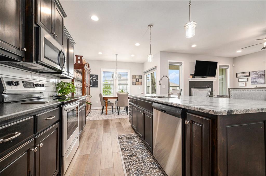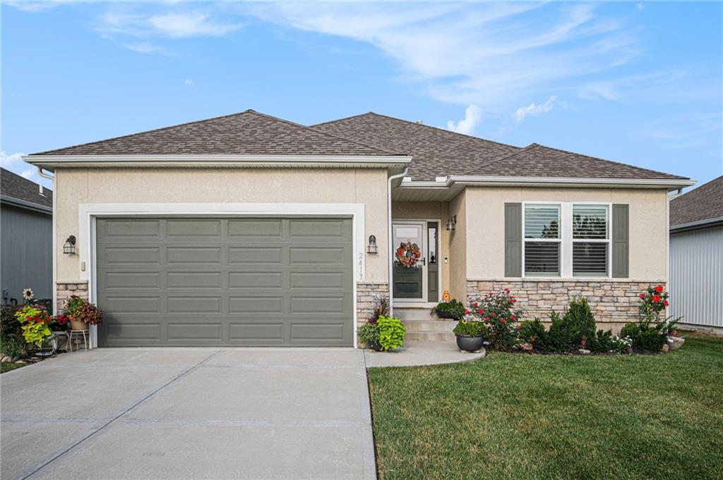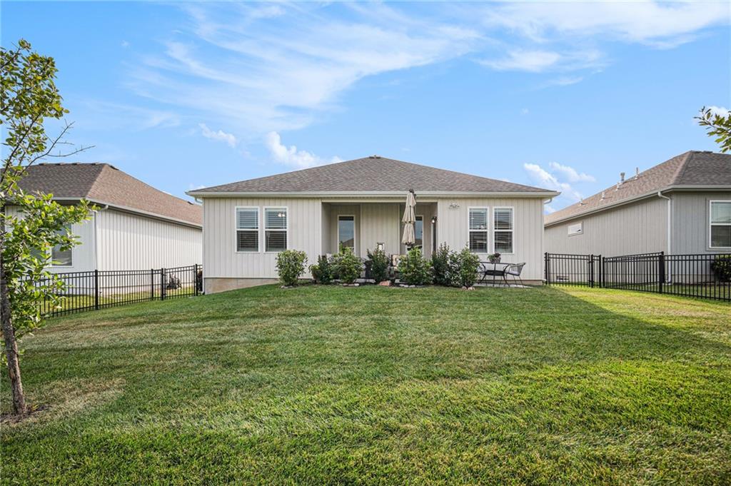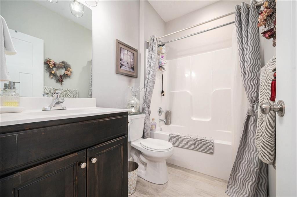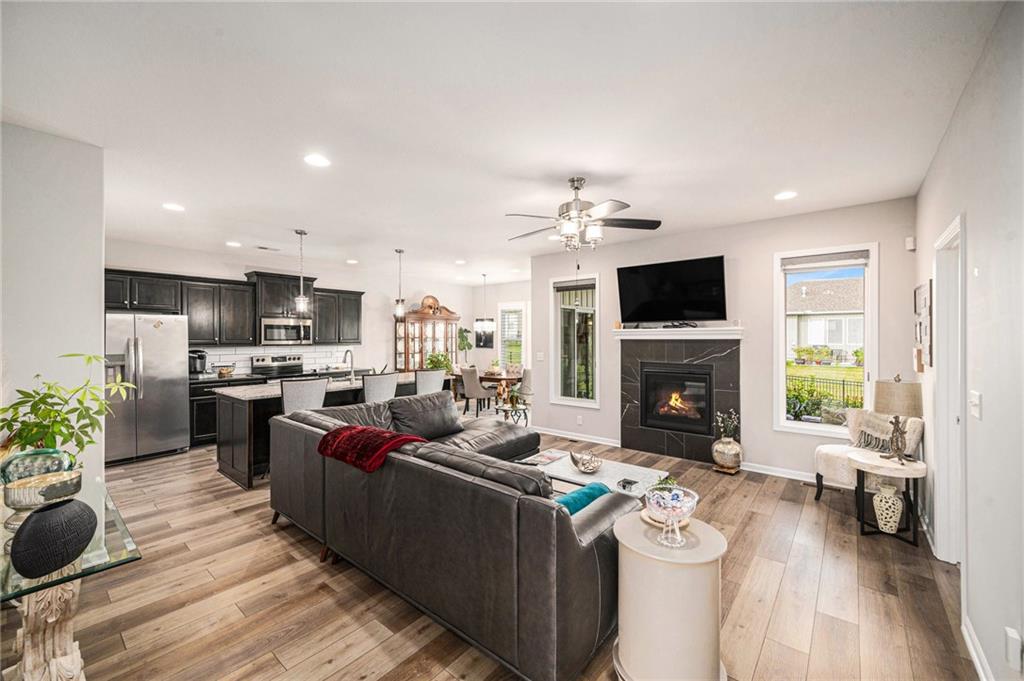 Better than new. Open kitchen, living room & dining room - step out to concrete private patio & fence. Modern and stylish. 9ft granite counter top island perfect for hosting. From garage step into laundry and right into kitchen. Primary bedroom large, features luxury bathroom and walk-in closet. 2nd bedroom and 2nd bathroom convenient for guests. Full unfinished basement, ready for another bedroom, bath, and family are to be built. Full basement ready for buyer to make it their own! Stubbed for another bedroom and bathroom. Maintenance provided that includes lawn maintenance, snow removal, and trash pick up. enjoy nearby walking trails or golf courses. Painted Cabinets, pantry Luxury Vinyl Plank in Main living area, Carpet in bedrooms.