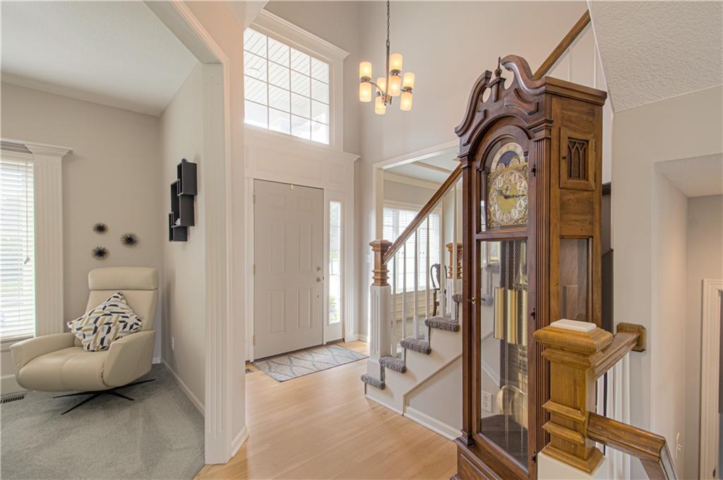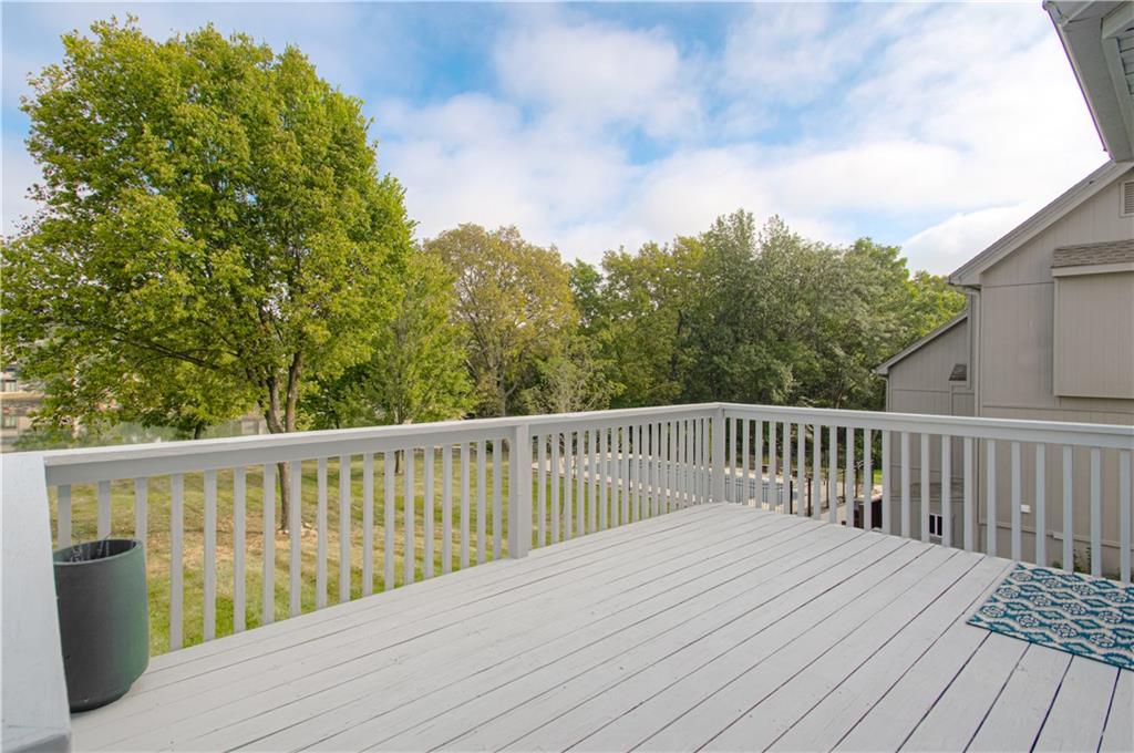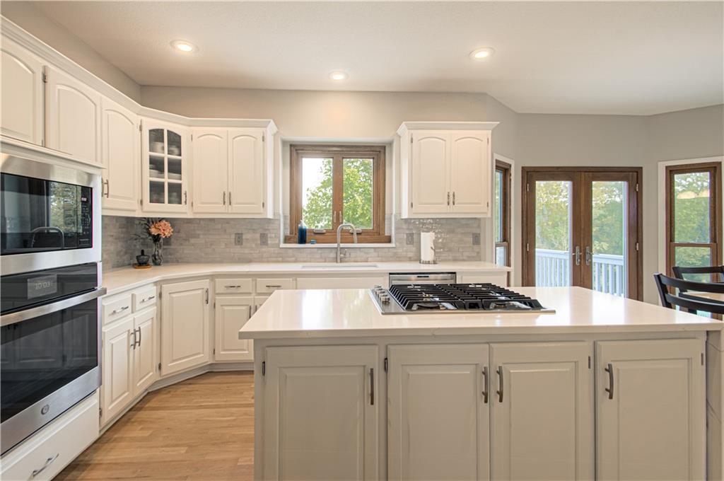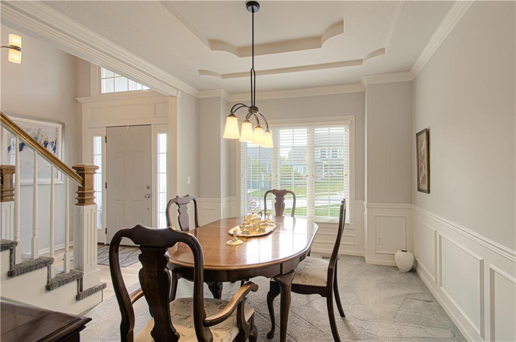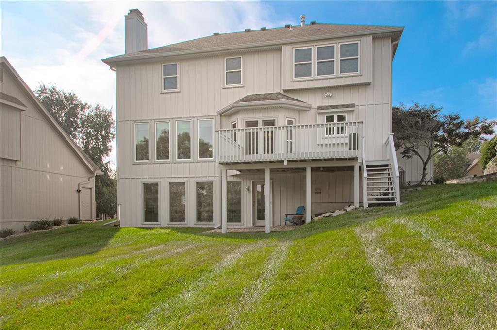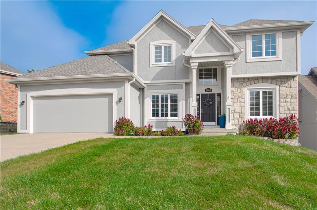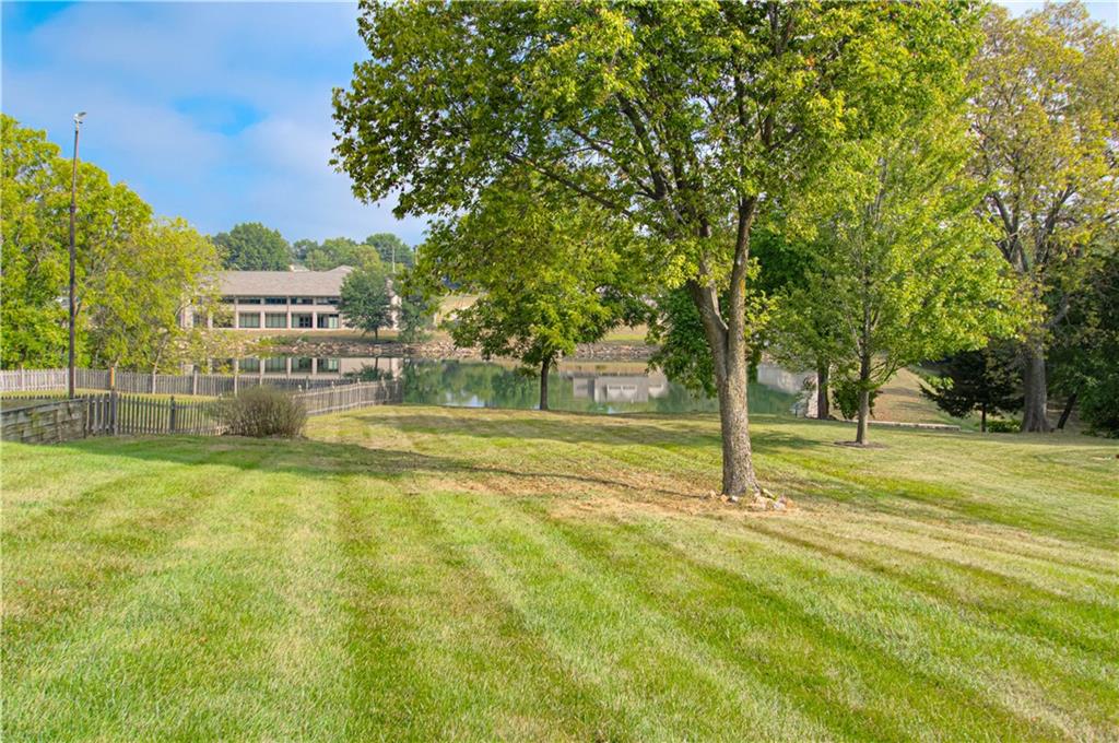 Welcome home to this tucked-away 5-bedroom, 3.5-bath residence offering nearly 3,000 sq. ft. of comfortable living space—perfectly designed for both everyday living and special gatherings. The open main level offers seamless flow between the living room (or office), formal dining room, family room, hall bathroom, and kitchen. The dining room features tray ceilings, crown molding, and wainscoting. The family room impresses with floor-to-ceiling windows, custom built-ins, and a raised gas fireplace. A dining nook with coffee bar/desk area adds extra function with style. The updated kitchen boasts stainless steel appliances, white cabinetry, quartz countertops, a custom tile backsplash, and a striking waterfall island with gas cooktop, spacious pantry/ French doors opening to the expansive deck overlooking the manicured yard and pond complete the space. A double staircase leads to the upper level, where the luxurious primary suite awaits. Tray ceilings, crown molding, and a wall of windows create an airy retreat, while the oversized walk-in closet includes a convenient laundry chute. The spa-inspired ensuite boasts dual vanities, a Jacuzzi tub, walk-in shower with dual shower heads, custom tile floors, and elegant tray ceiling. Three additional spacious bedrooms and a beautifully updated hall bath with dual vanities and private shower area complete this level. The fully finished walk-out lower level offers floor-to-ceiling windows, luxury laminate plank flooring, and is plumbed for a gas fireplace. A private bedroom with full bath, workshop, and finished storage provides both comfort and convenience. 2 car garage with recently updated epoxy flooring. Enjoy tranquil pond views from the expansive backyard, with space to add a pool or fence. Conveniently located with quick access to I-435, Rt. 152, and Hwy 169. Just 15 minutes to the airport and 20 minutes to downtown.