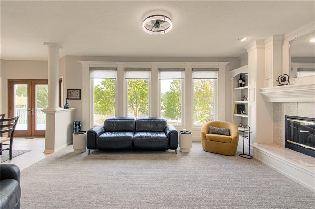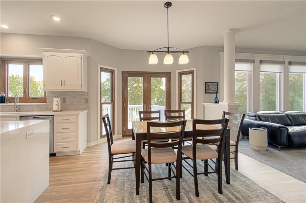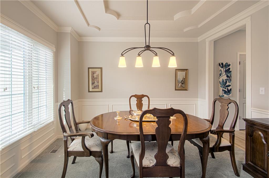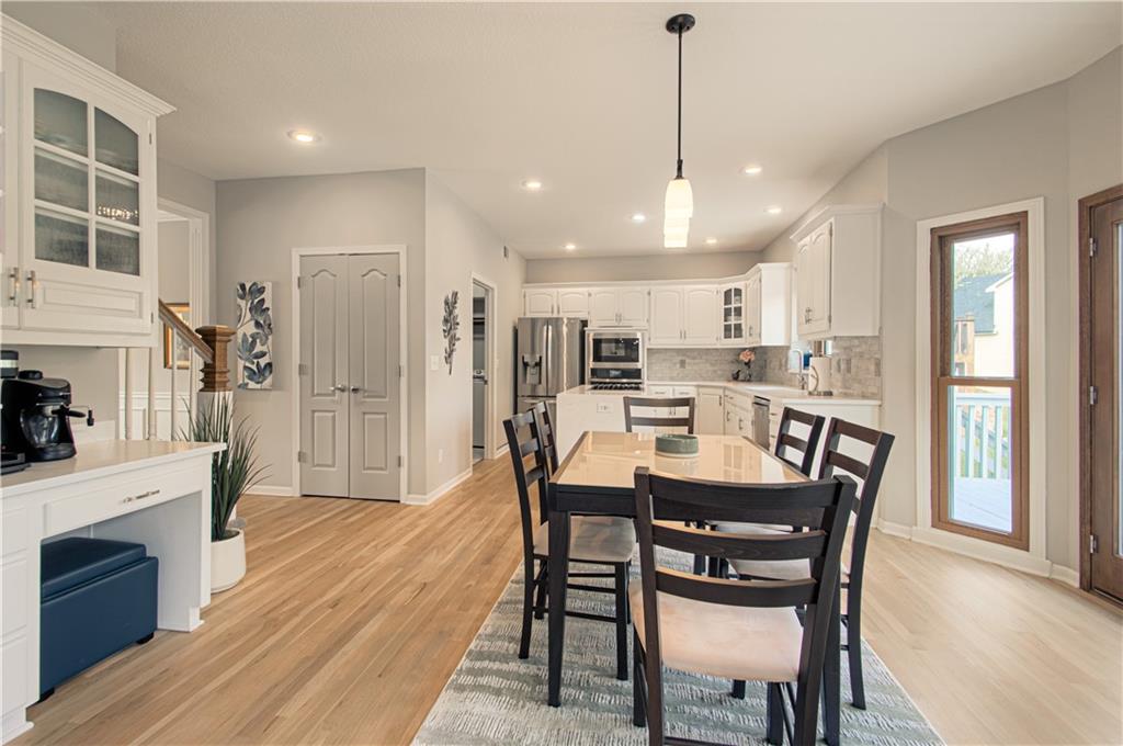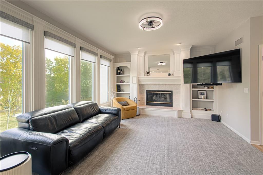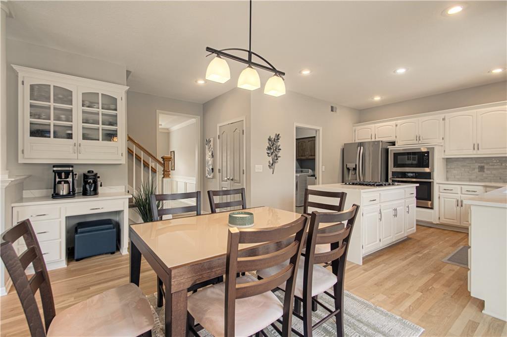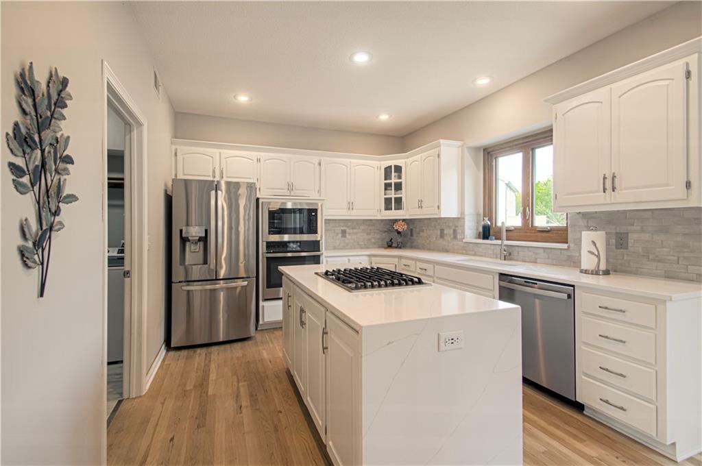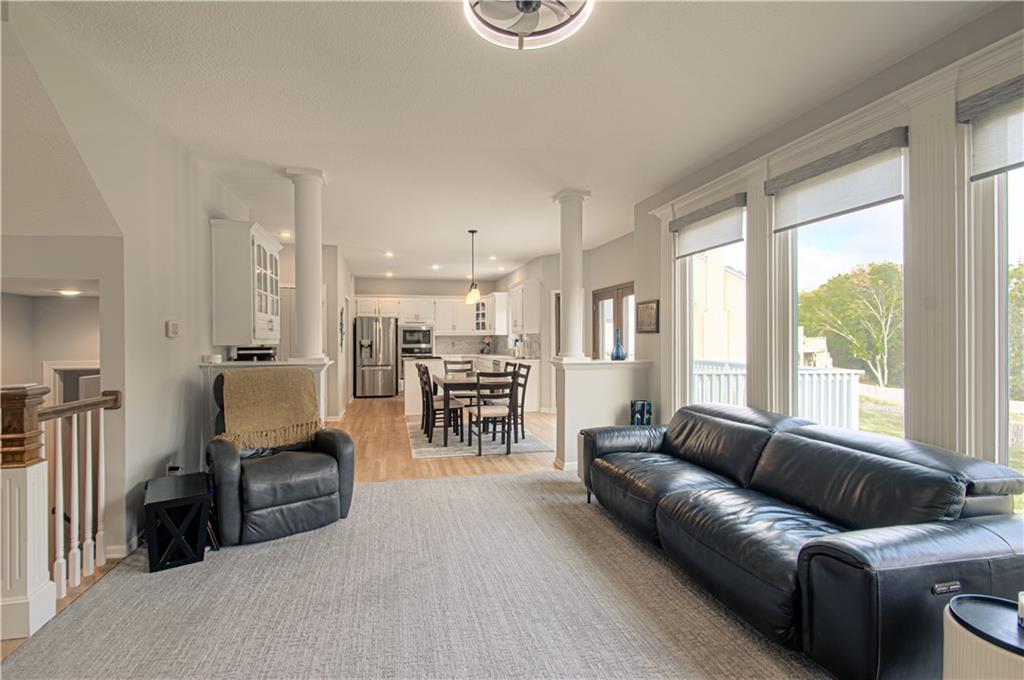 Welcome home to this tucked-away 5-bedroom, 3.5-bath residence offering nearly 3,000 sq. ft. of comfortable living space—perfectly designed for both everyday living and special gatherings. The open main level offers seamless flow between the living room (or office), formal dining room, family room, hall bathroom, and kitchen. The dining room features tray ceilings, crown molding, and wainscoting. The family room impresses with floor-to-ceiling windows, custom built-ins, and a raised gas fireplace. A dining nook with coffee bar/desk area adds extra function with style. The updated kitchen boasts stainless steel appliances, white cabinetry, quartz countertops, a custom tile backsplash, and a striking waterfall island with gas cooktop, spacious pantry/ French doors opening to the expansive deck overlooking the manicured yard and pond complete the space. A double staircase leads to the upper level, where the luxurious primary suite awaits. Tray ceilings, crown molding, and a wall of windows create an airy retreat, while the oversized walk-in closet includes a convenient laundry chute. The spa-inspired ensuite boasts dual vanities, a Jacuzzi tub, walk-in shower with dual shower heads, custom tile floors, and elegant tray ceiling. Three additional spacious bedrooms and a beautifully updated hall bath with dual vanities and private shower area complete this level. The fully finished walk-out lower level offers floor-to-ceiling windows, luxury laminate plank flooring, and is plumbed for a gas fireplace. A private bedroom with full bath, workshop, and finished storage provides both comfort and convenience. 2 car garage with recently updated epoxy flooring. Enjoy tranquil pond views from the expansive backyard, with space to add a pool or fence. Conveniently located with quick access to I-435, Rt. 152, and Hwy 169. Just 15 minutes to the airport and 20 minutes to downtown.