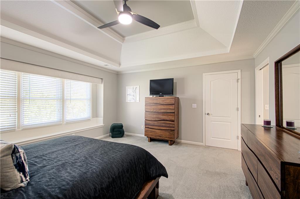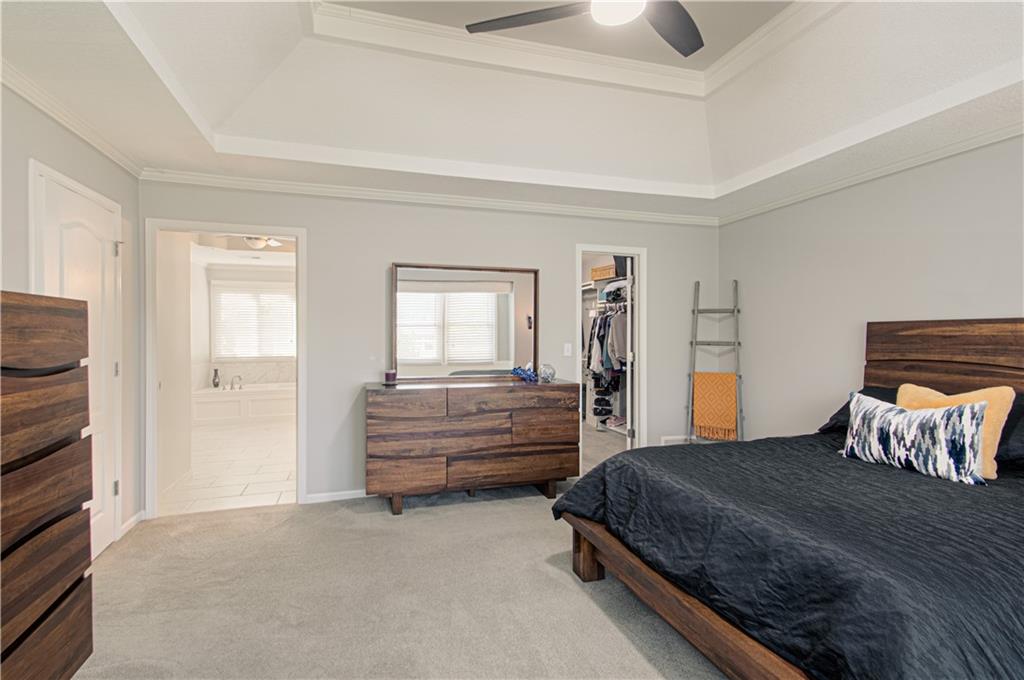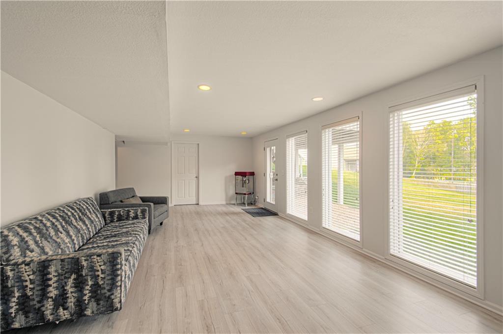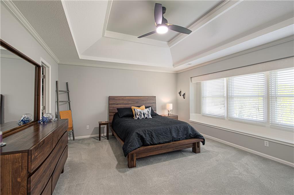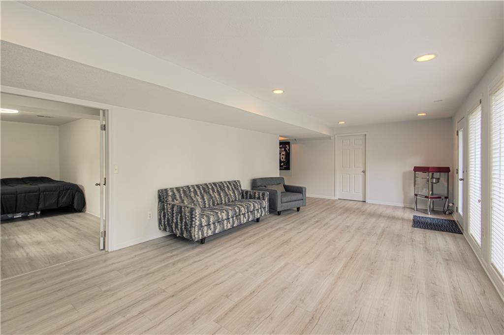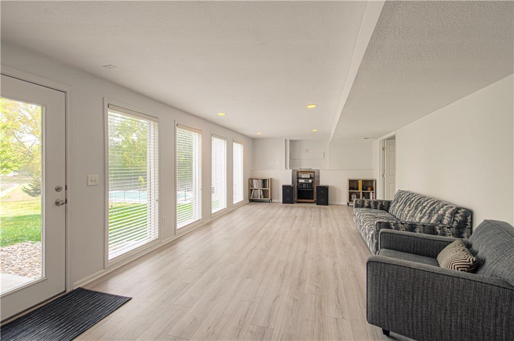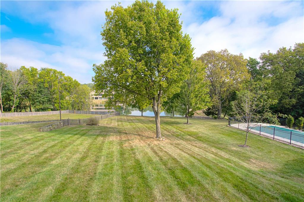Welcome home to this tucked-away 5-bedroom, 3.5-bath residence offering nearly 3,000 sq. ft. of comfortable living space—perfectly designed for both everyday living and special gatherings. The open main level offers seamless flow between the living room (or office), formal dining room, family room, hall bathroom, and kitchen. The dining room features tray ceilings, crown molding, and wainscoting. The family room impresses with floor-to-ceiling windows, custom built-ins, and a raised gas fireplace. A dining nook with coffee bar/desk area adds extra function with style. The updated kitchen boasts stainless steel appliances, white cabinetry, quartz countertops, a custom tile backsplash, and a striking waterfall island with gas cooktop, spacious pantry/ French doors opening to the expansive deck overlooking the manicured yard and pond complete the space. A double staircase leads to the upper level, where the luxurious primary suite awaits. Tray ceilings, crown molding, and a wall of windows create an airy retreat, while the oversized walk-in closet includes a convenient laundry chute. The spa-inspired ensuite boasts dual vanities, a Jacuzzi tub, walk-in shower with dual shower heads, custom tile floors, and elegant tray ceiling. Three additional spacious bedrooms and a beautifully updated hall bath with dual vanities and private shower area complete this level. The fully finished walk-out lower level offers floor-to-ceiling windows, luxury laminate plank flooring, and is plumbed for a gas fireplace. A private bedroom with full bath, workshop, and finished storage provides both comfort and convenience. 2 car garage with recently updated epoxy flooring. Enjoy tranquil pond views from the expansive backyard, with space to add a pool or fence. Conveniently located with quick access to I-435, Rt. 152, and Hwy 169. Just 15 minutes to the airport and 20 minutes to downtown.