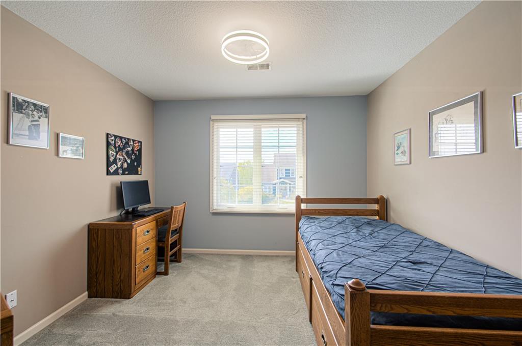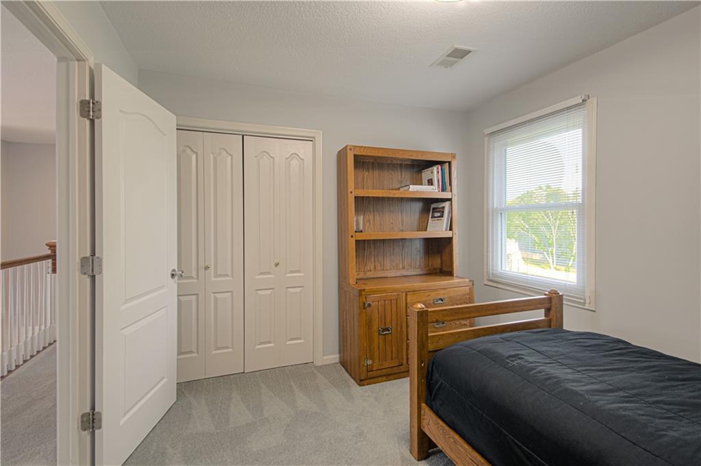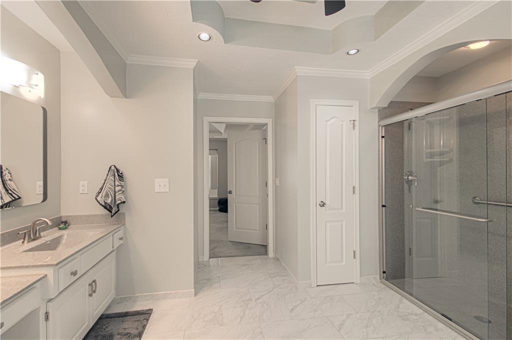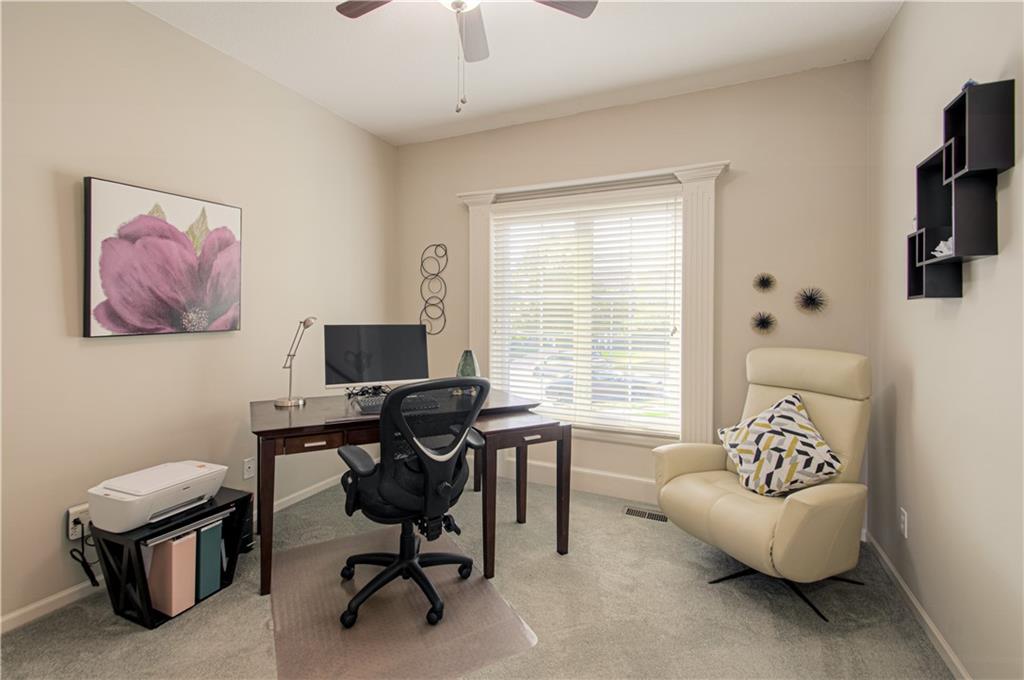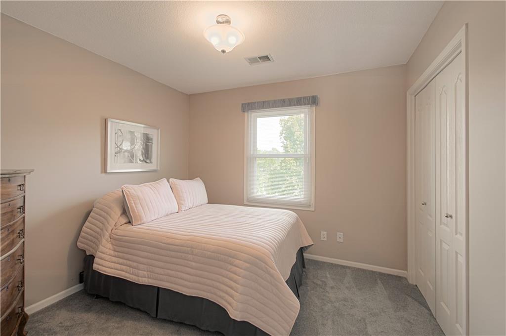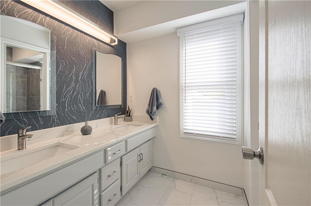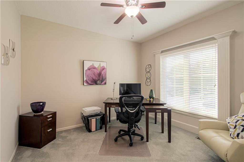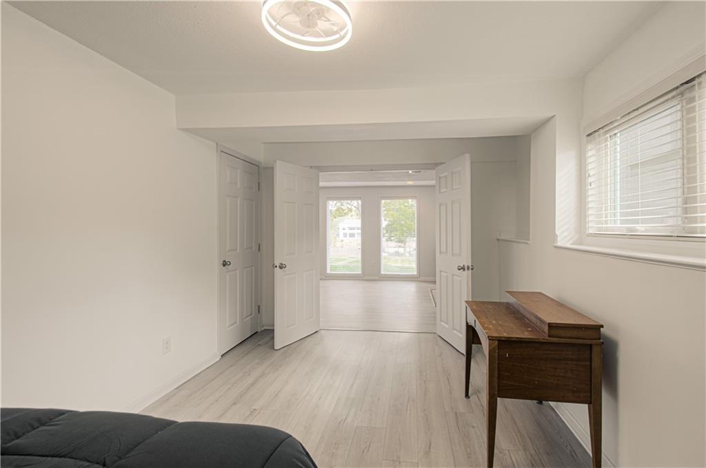 Welcome home to this tucked-away 5-bedroom, 3.5-bath residence offering nearly 3,000 sq. ft. of comfortable living space—perfectly designed for both everyday living and special gatherings. The open main level offers seamless flow between the living room (or office), formal dining room, family room, hall bathroom, and kitchen. The dining room features tray ceilings, crown molding, and wainscoting. The family room impresses with floor-to-ceiling windows, custom built-ins, and a raised gas fireplace. A dining nook with coffee bar/desk area adds extra function with style. The updated kitchen boasts stainless steel appliances, white cabinetry, quartz countertops, a custom tile backsplash, and a striking waterfall island with gas cooktop, spacious pantry/ French doors opening to the expansive deck overlooking the manicured yard and pond complete the space. A double staircase leads to the upper level, where the luxurious primary suite awaits. Tray ceilings, crown molding, and a wall of windows create an airy retreat, while the oversized walk-in closet includes a convenient laundry chute. The spa-inspired ensuite boasts dual vanities, a Jacuzzi tub, walk-in shower with dual shower heads, custom tile floors, and elegant tray ceiling. Three additional spacious bedrooms and a beautifully updated hall bath with dual vanities and private shower area complete this level. The fully finished walk-out lower level offers floor-to-ceiling windows, luxury laminate plank flooring, and is plumbed for a gas fireplace. A private bedroom with full bath, workshop, and finished storage provides both comfort and convenience. 2 car garage with recently updated epoxy flooring. Enjoy tranquil pond views from the expansive backyard, with space to add a pool or fence. Conveniently located with quick access to I-435, Rt. 152, and Hwy 169. Just 15 minutes to the airport and 20 minutes to downtown.