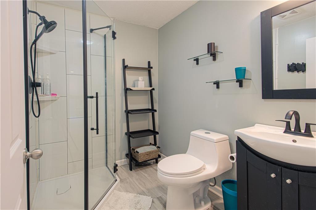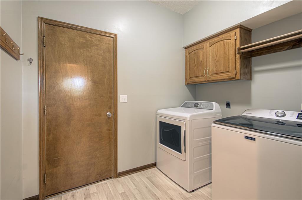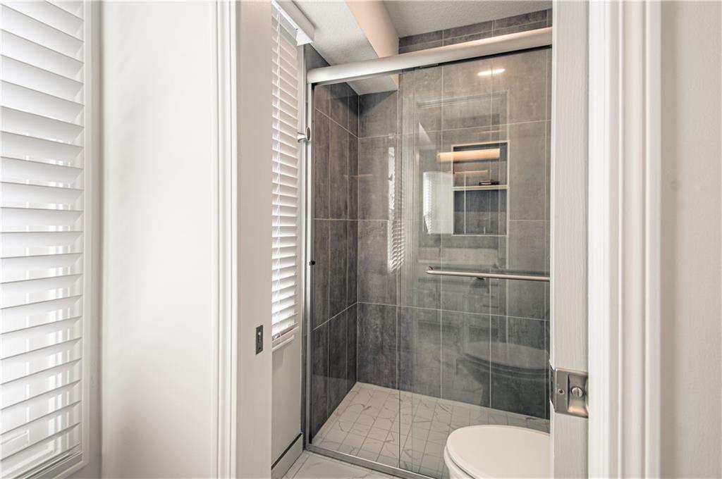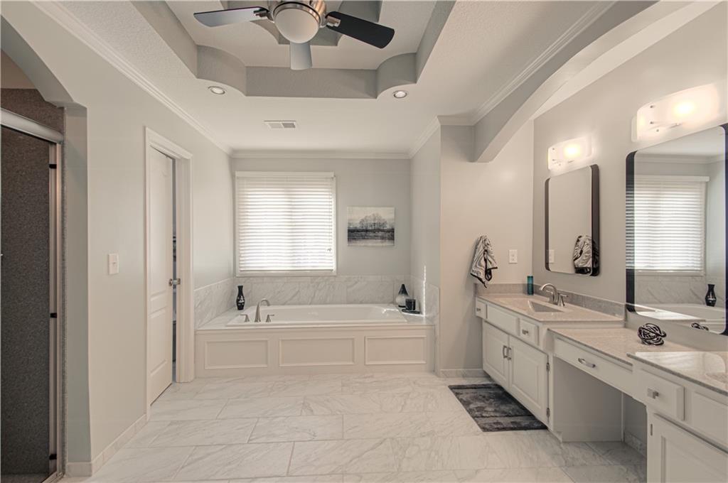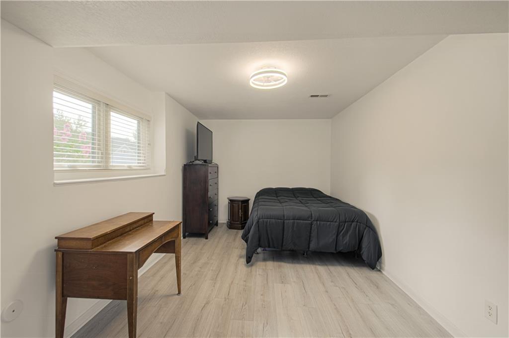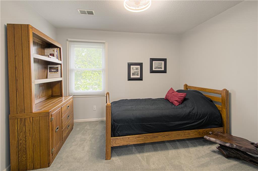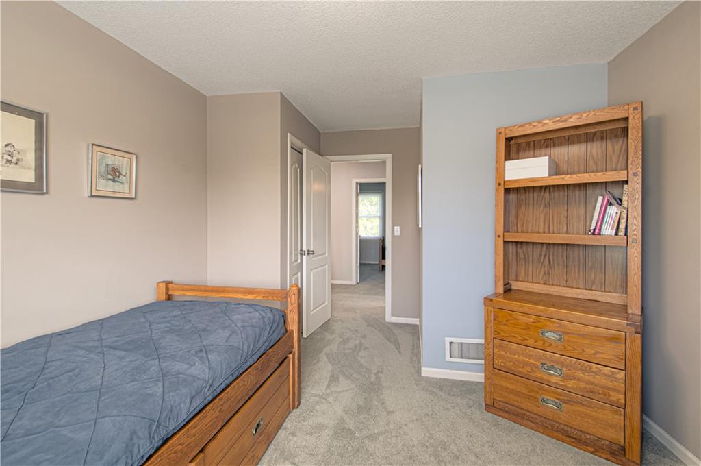 Welcome home to this tucked-away 5-bedroom, 3.5-bath residence offering nearly 3,000 sq. ft. of comfortable living space—perfectly designed for both everyday living and special gatherings. The open main level offers seamless flow between the living room (or office), formal dining room, family room, hall bathroom, and kitchen. The dining room features tray ceilings, crown molding, and wainscoting. The family room impresses with floor-to-ceiling windows, custom built-ins, and a raised gas fireplace. A dining nook with coffee bar/desk area adds extra function with style. The updated kitchen boasts stainless steel appliances, white cabinetry, quartz countertops, a custom tile backsplash, and a striking waterfall island with gas cooktop, spacious pantry/ French doors opening to the expansive deck overlooking the manicured yard and pond complete the space. A double staircase leads to the upper level, where the luxurious primary suite awaits. Tray ceilings, crown molding, and a wall of windows create an airy retreat, while the oversized walk-in closet includes a convenient laundry chute. The spa-inspired ensuite boasts dual vanities, a Jacuzzi tub, walk-in shower with dual shower heads, custom tile floors, and elegant tray ceiling. Three additional spacious bedrooms and a beautifully updated hall bath with dual vanities and private shower area complete this level. The fully finished walk-out lower level offers floor-to-ceiling windows, luxury laminate plank flooring, and is plumbed for a gas fireplace. A private bedroom with full bath, workshop, and finished storage provides both comfort and convenience. 2 car garage with recently updated epoxy flooring. Enjoy tranquil pond views from the expansive backyard, with space to add a pool or fence. Conveniently located with quick access to I-435, Rt. 152, and Hwy 169. Just 15 minutes to the airport and 20 minutes to downtown.