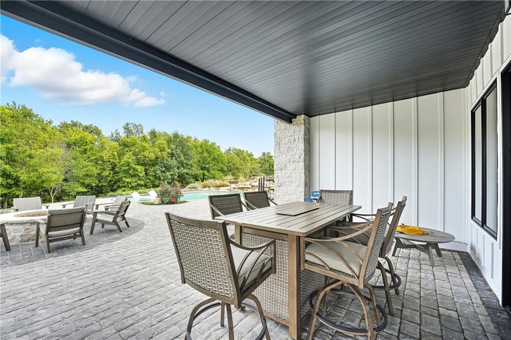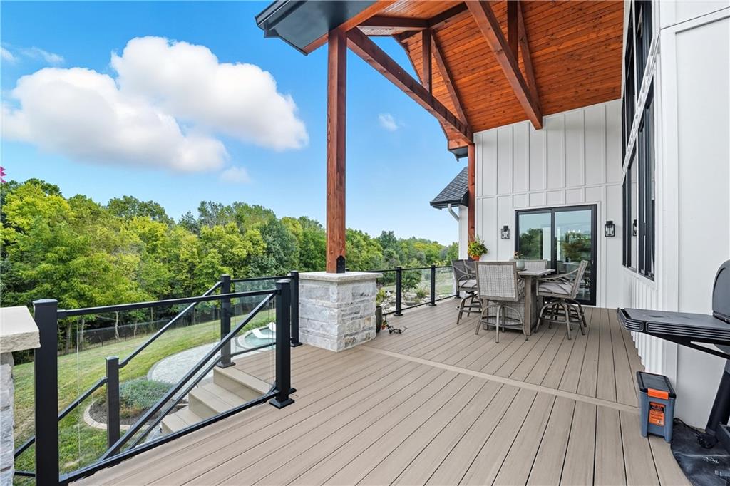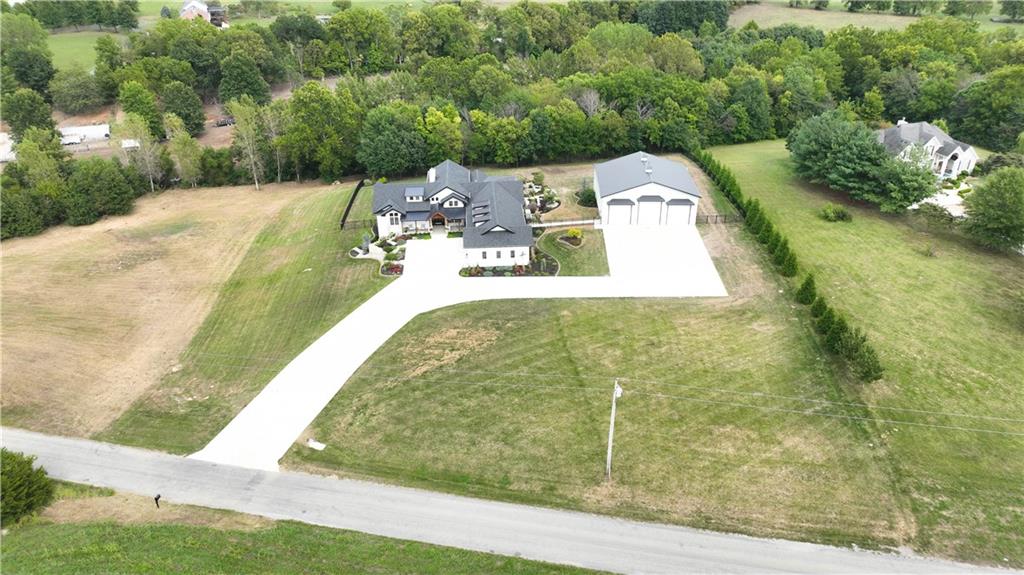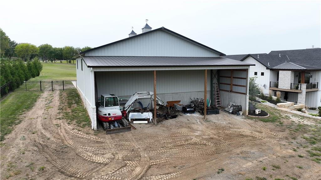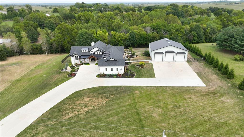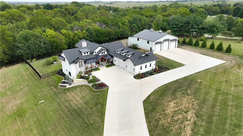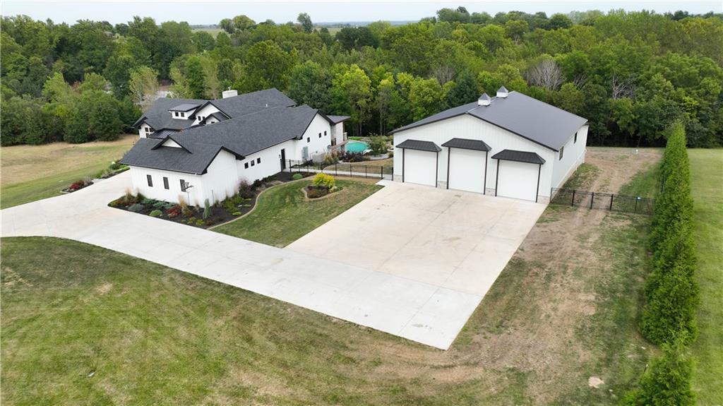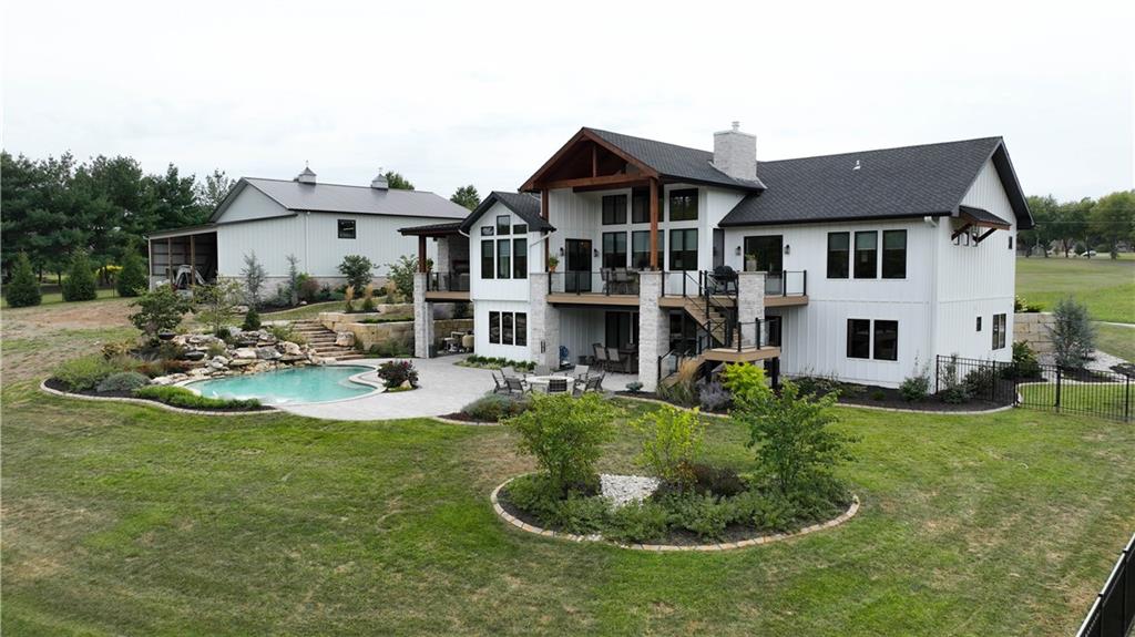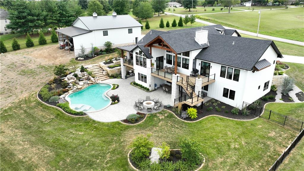 Custom-built retreat with soaring ceilings, wood beams, & tons of windows offering natural light throughout. Backyard oasis w/heated inground pool, waterfalls, fire bowls, firepit, covered deck & patio, & iron fence. Open main floor living w/floor to ceiling fireplace, custom cabinetry, oversize center island, walk-in pantry, high end finishes & built-ins through out, designated office, spacious laundry/mud room, stunning primary suite, & 2nd bedroom. Walk-out lower level with excavated garage, storage room w/exterior door, wet bar, 3 bedrooms, Rec Room, & 2nd laundry. 50x50 metal outbuilding with 3 doors(1 oversized for semi), 1/2 bath, geothermal heat/cool & spray foam insulation. 2 geothermal systems, whole house generator, sprinkler system, underground propane tank, and extensive landscaping w/concrete curb complete this one-of-a-kind home. All bedrooms with walk-in closets and private bath access. Paved drive/parking for business, semi, RV, trailers, etc.