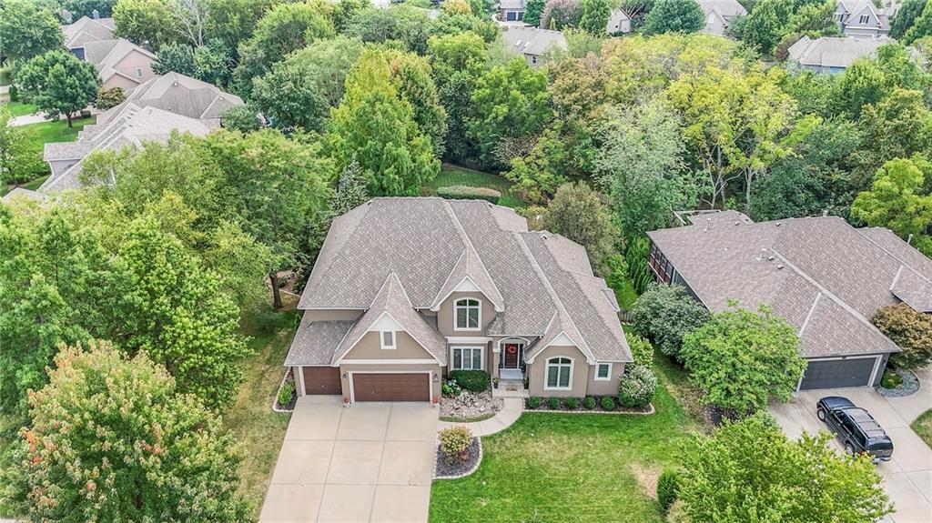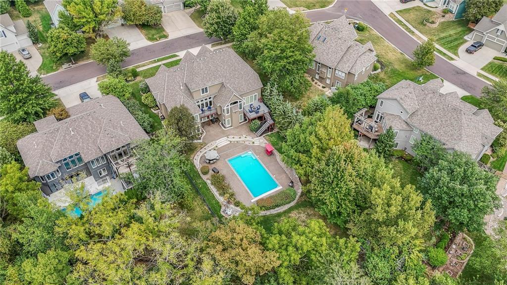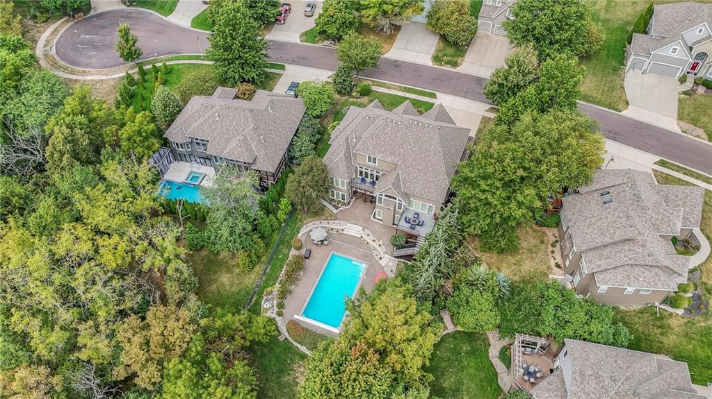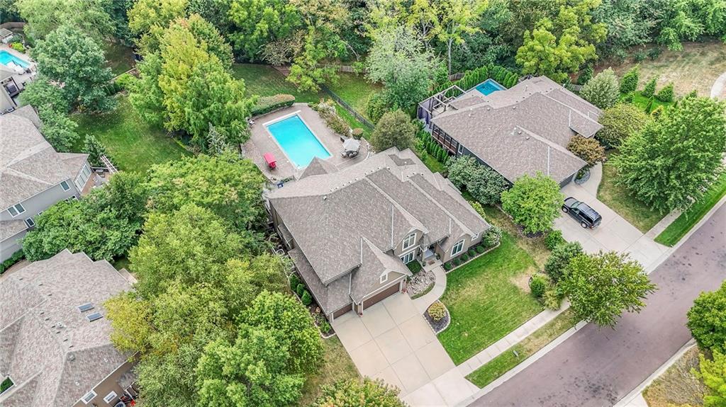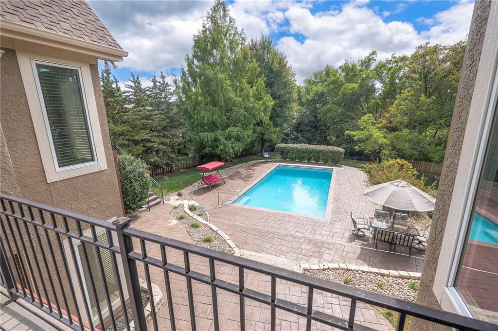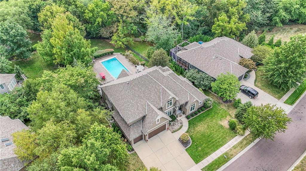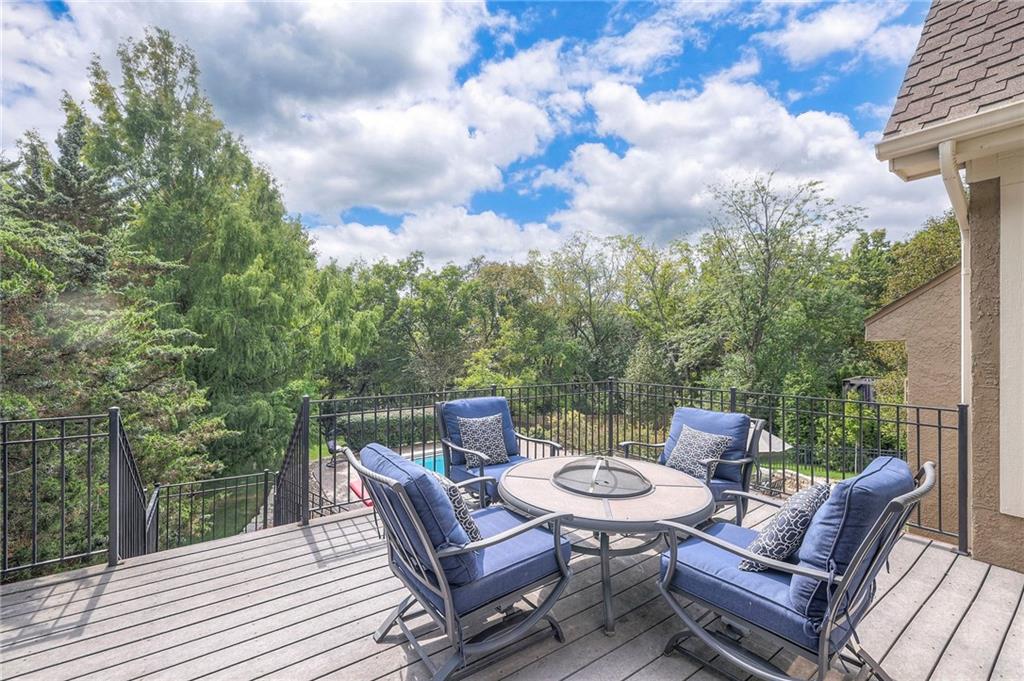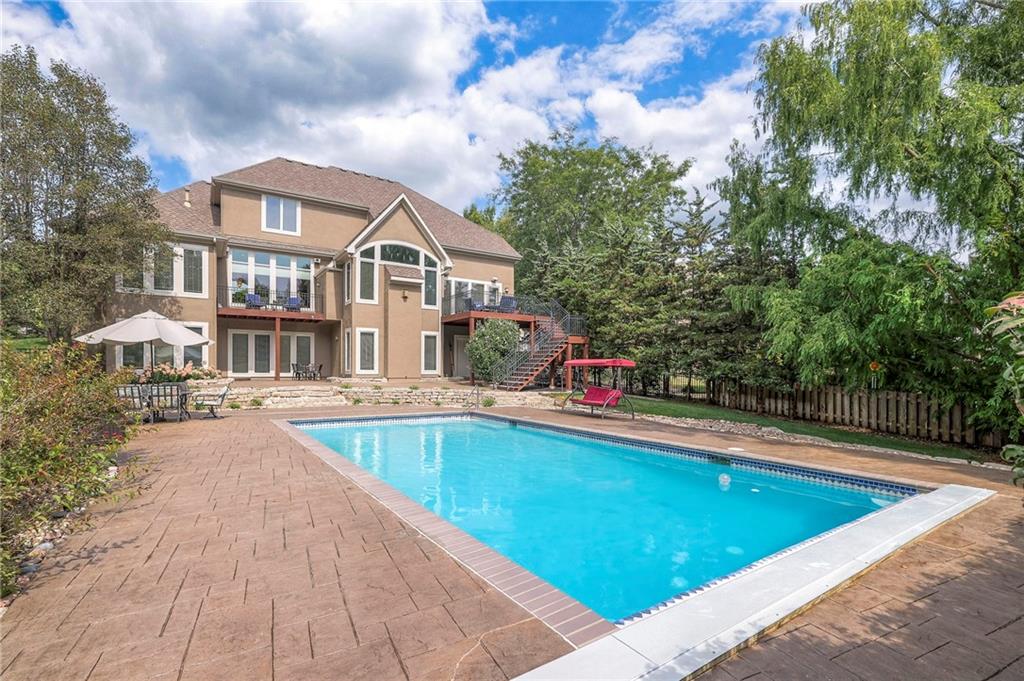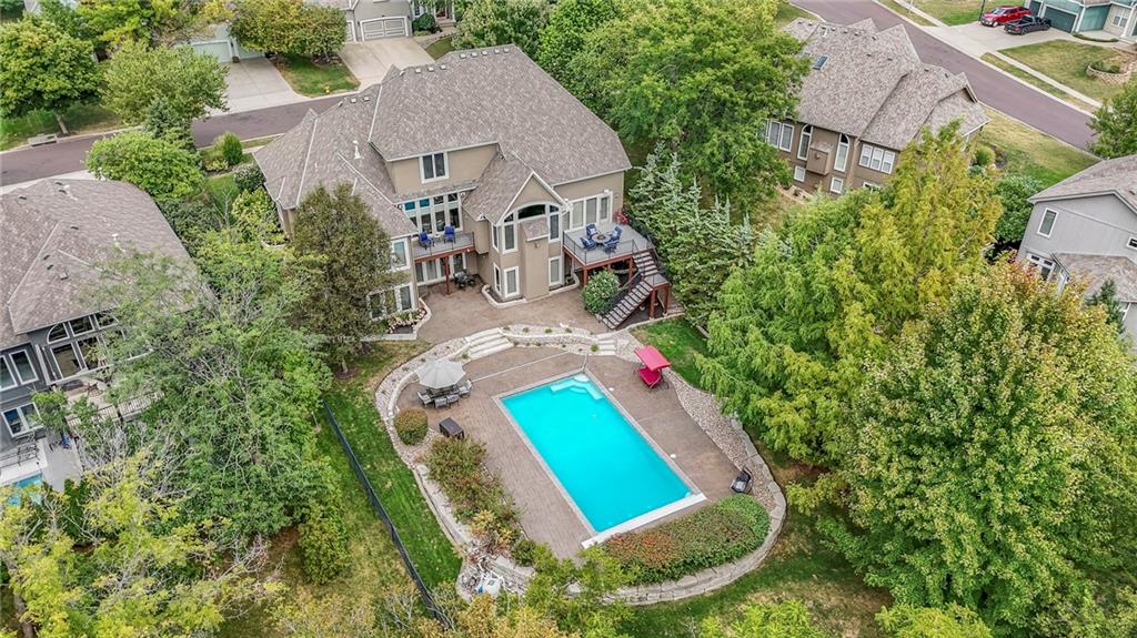 Welcome to this stunning 1.5-story home offering over 5,800 square feet of living space in a fantastic Overland Park location. The inviting entry opens to a formal dining room and home office, setting the tone for the amazing space throughout. The living room is warm and welcoming with vaulted ceilings, a cozy fireplace, and built-ins. The kitchen is truly the heart of the home, featuring an expansive island, double ovens, two sinks, a walk-in pantry, and generous countertop space. Just off the kitchen, a hearth room with its own fireplace and built-ins provides the perfect spot to gather. Step outside to a low-maintenance composite deck overlooking the private, treed backyard. The main-level primary suite is a retreat all its own, with a private balcony, spa-like ensuite bath featuring a walk-in shower and soaking tub, and a huge walk-in closet. A convenient laundry room rounds out the main floor. Upstairs, you’ll find four spacious bedrooms, each with access to bathrooms and large closets. The finished walk-out basement is designed for entertaining, featuring a large rec room, a wet bar, and a separate space perfect for a pool table. A non-conforming sixth bedroom and abundant storage provide additional flexibility. Step outside to the backyard oasis, complete with a beautiful swimming pool, expansive patio, green space, and mature trees for privacy. This home is the complete package, spacious, functional, and perfect for both everyday living and entertaining.