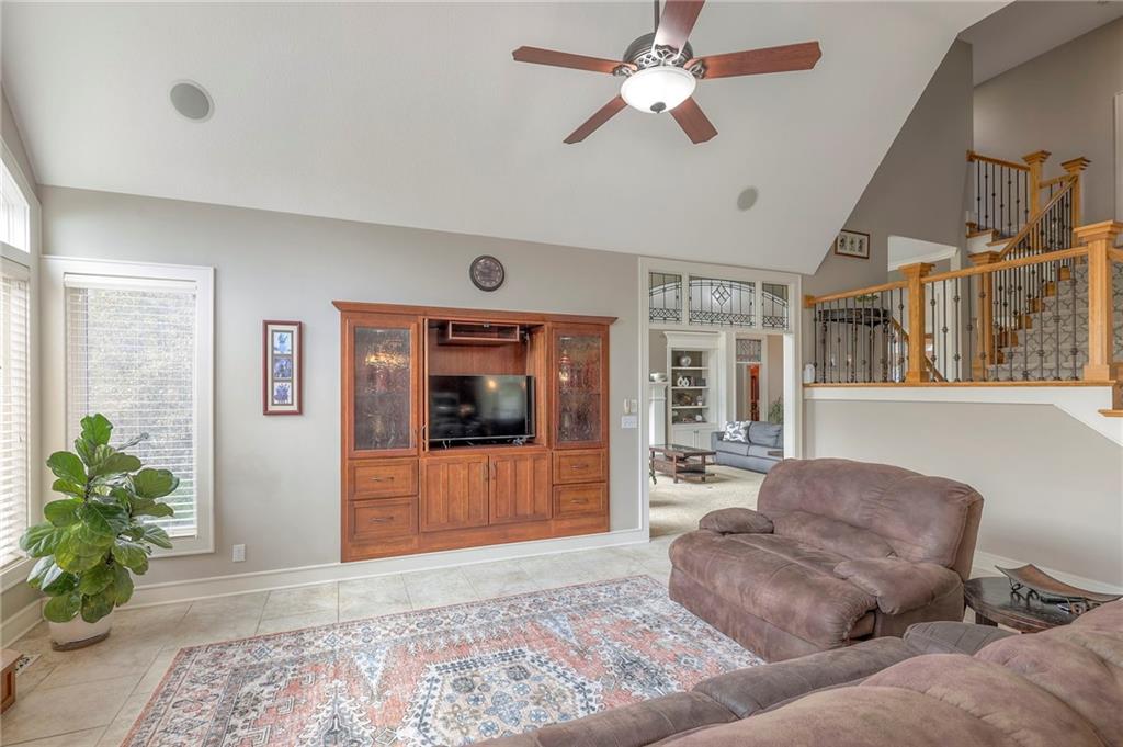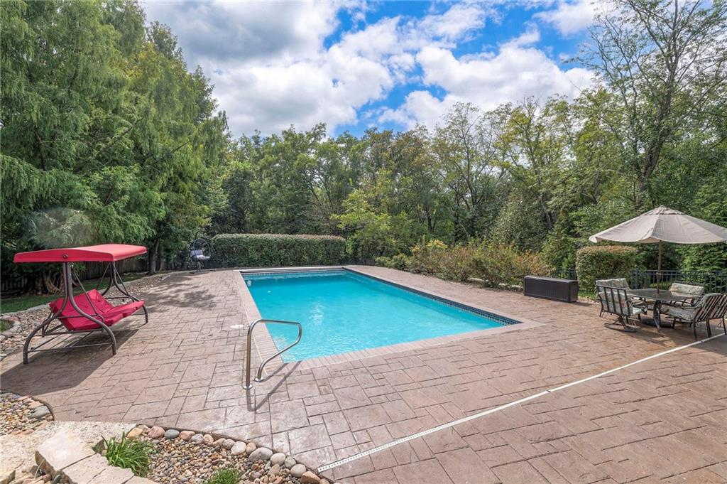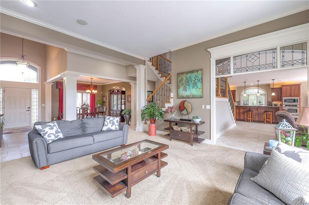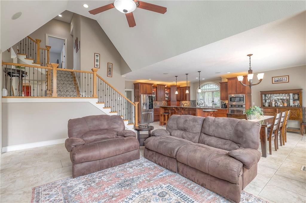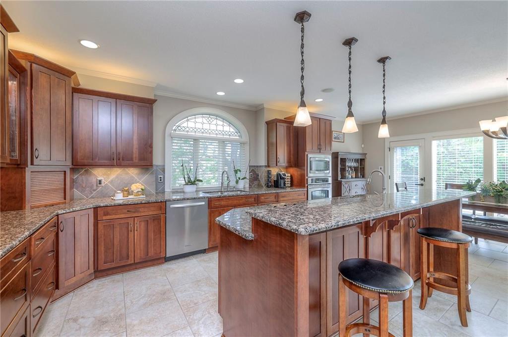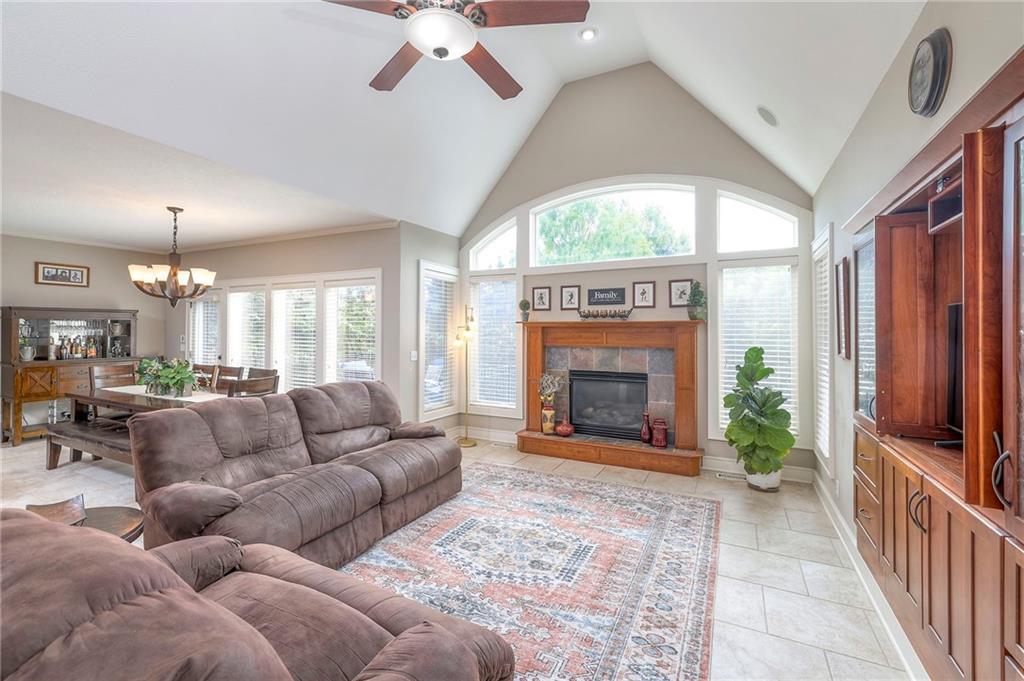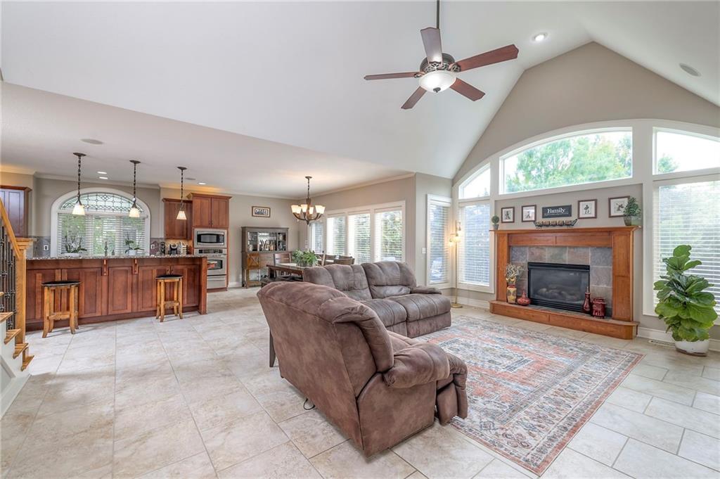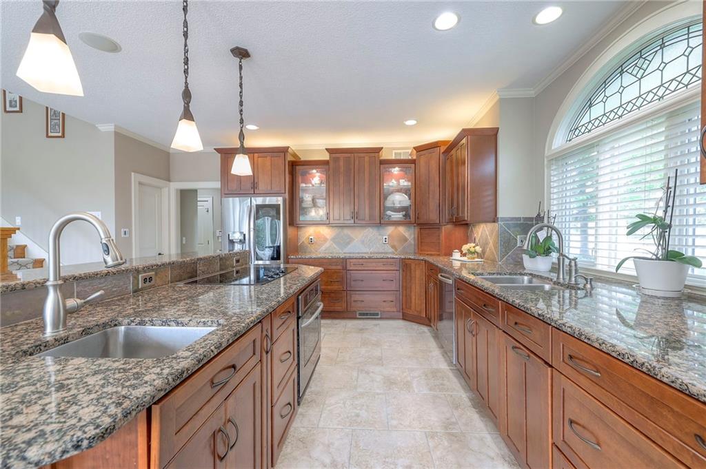 Welcome to this stunning 1.5-story home offering over 5,800 square feet of living space in a fantastic Overland Park location. The inviting entry opens to a formal dining room and home office, setting the tone for the amazing space throughout. The living room is warm and welcoming with vaulted ceilings, a cozy fireplace, and built-ins. The kitchen is truly the heart of the home, featuring an expansive island, double ovens, two sinks, a walk-in pantry, and generous countertop space. Just off the kitchen, a hearth room with its own fireplace and built-ins provides the perfect spot to gather. Step outside to a low-maintenance composite deck overlooking the private, treed backyard. The main-level primary suite is a retreat all its own, with a private balcony, spa-like ensuite bath featuring a walk-in shower and soaking tub, and a huge walk-in closet. A convenient laundry room rounds out the main floor. Upstairs, you’ll find four spacious bedrooms, each with access to bathrooms and large closets. The finished walk-out basement is designed for entertaining, featuring a large rec room, a wet bar, and a separate space perfect for a pool table. A non-conforming sixth bedroom and abundant storage provide additional flexibility. Step outside to the backyard oasis, complete with a beautiful swimming pool, expansive patio, green space, and mature trees for privacy. This home is the complete package, spacious, functional, and perfect for both everyday living and entertaining.