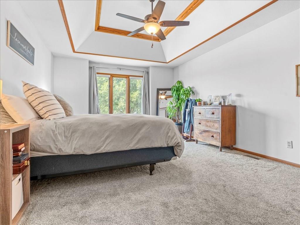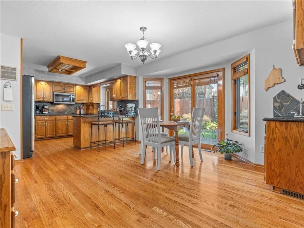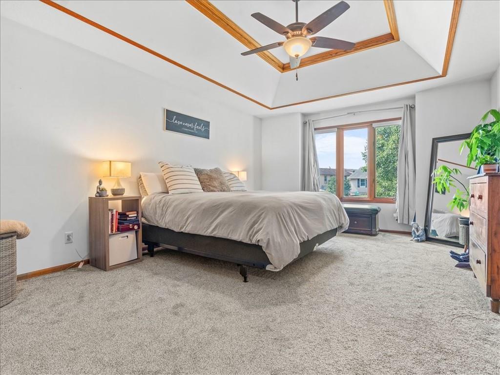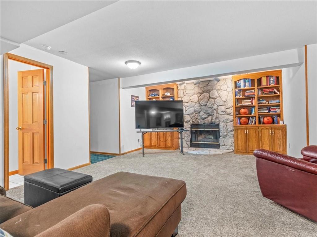 This beautifully maintained 1.5-story home offers an abundance of space and flexibility in a sought after neighborhood. The main floor boasts a warm living room with a brick fireplace, a formal dining room, and a spacious kitchen with a breakfast area. You’ll love the oversized primary suite with a tray ceiling, a spa-like bathroom, plus the convenience of main-floor laundry, a half bath, and a 2 car garage. Upstairs, find three comfortable bedrooms and a full bath, while the finished basement is made for fun - featuring a large rec room, full bath, wet bar, and a non-conforming bedroom or exercise room, along with plenty of storage. A brand new roof, security system, and all electric living finish off the amazing features of this home. With multiple living areas and thoughtful details throughout, this home is perfect for both entertaining and everyday living.