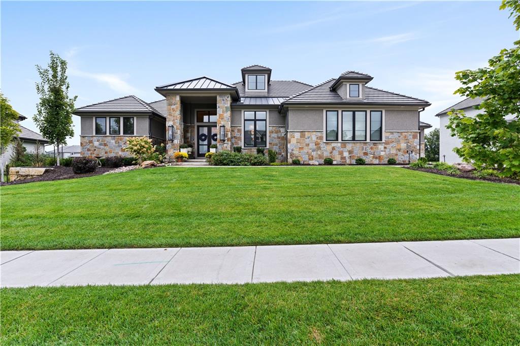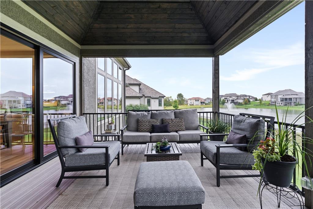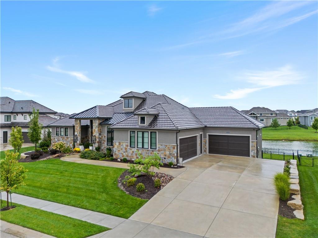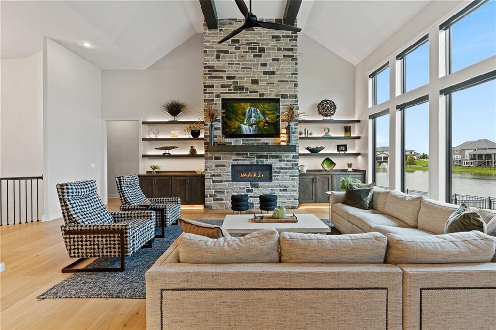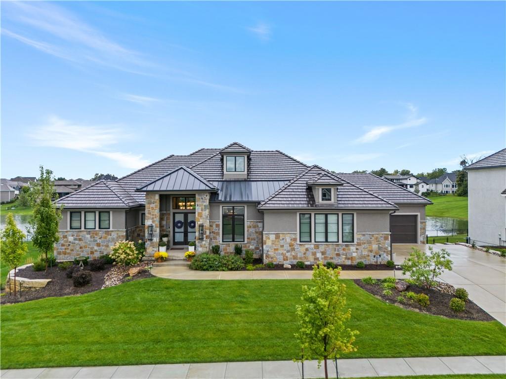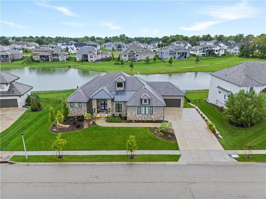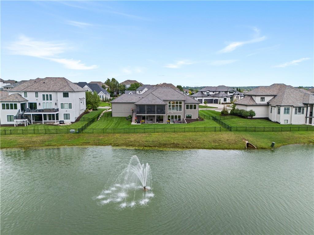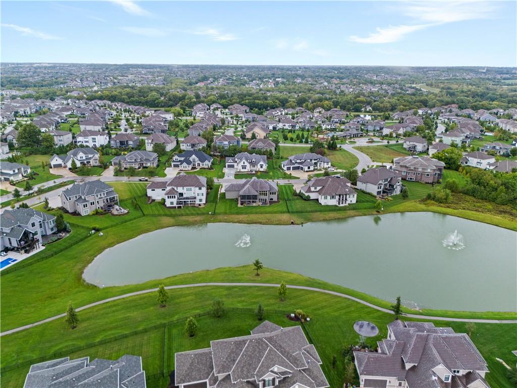 Poised within the prestigious Blue Valley School District, this award-winning Don Julian custom estate embodies the pinnacle of luxury living. Overlooking serene waters and dancing fountains, the residence offers a rare harmony of architectural excellence and natural beauty. The tranquil setting is best savored from the expansive main-level heated covered deck that connects the stunning four-seasons room. Every detail within reflects masterful craftsmanship and thoughtful design. With architectural LED lighting both interior and exterior, highlights the home's contemporary elegance. On the main level, the entrance meets you with glowing hardwoods that flow throughout both levels. The gourmet kitchen, appointed with Wolf appliances and luxurious finishes, anchors the open-concept living area—ideal for both intimate gatherings and grand entertaining. In the great room, remote-controlled window treatments reveal breathtaking lake views framed by cascading fountains.A graceful staircase leads to the lower level, designed as a private retreat and entertainment haven. Here, three ensuite bedrooms with walk-in closets complement an elegant wet bar, family recreation space, and a private music room—perfectly suited to transform into a wine cellar or recording studio.The unfinished space below the suspended garage offers endless possibilities like a home theater. Basement walkout access extends the living experience outdoors connecting to the patio and water views. Advanced home technology with a dedicated network hub with LUXUL gigabit switches, a PANAMAX MR4000 system, pre-wired for security system and in-ceiling Sonos speakers that encompasses the home in sound on both levels and the master bedroom.Enjoy year round energy efficiency with upgraded insulation and two laundry rooms for time efficiency. Blending timeless sophistication with modern innovation, this remarkable estate is more than a home—it is a statement of artistry and lifestyle in Terrybrook Farms