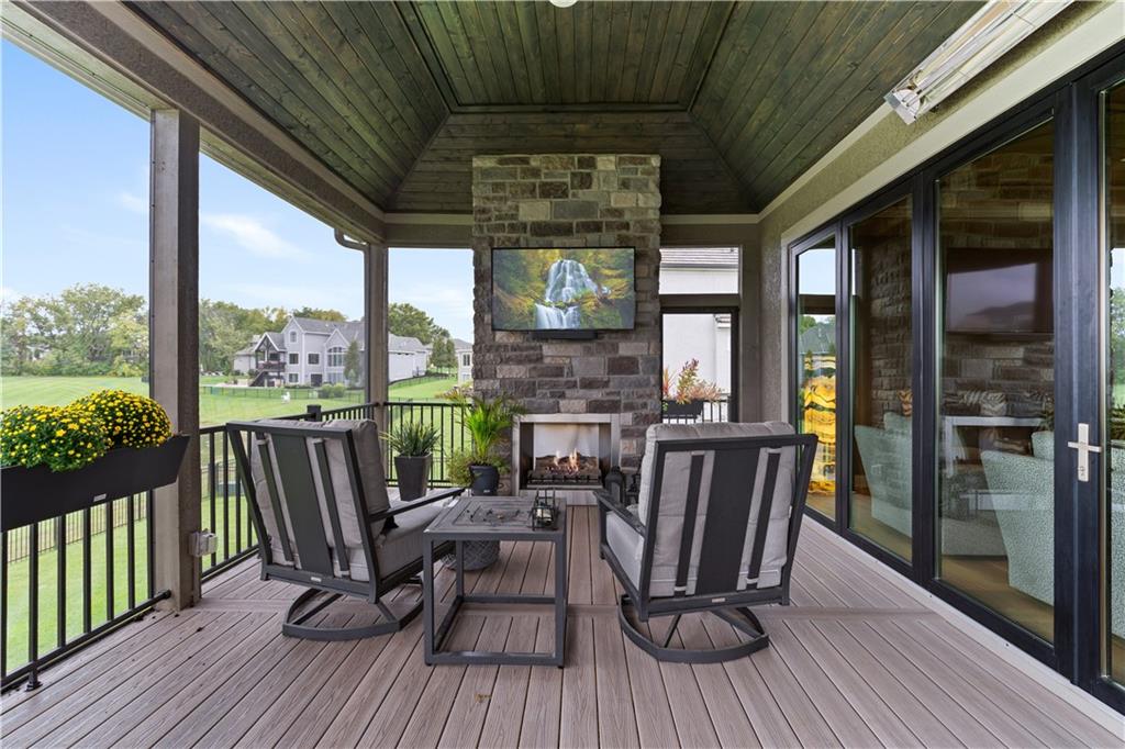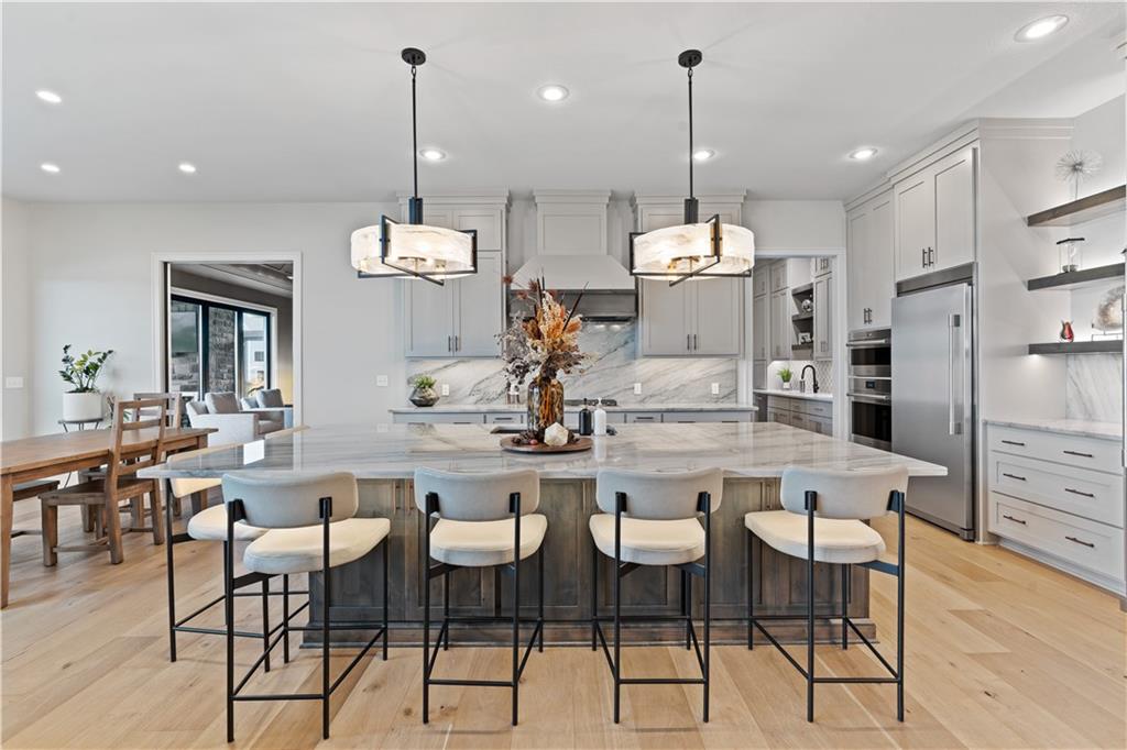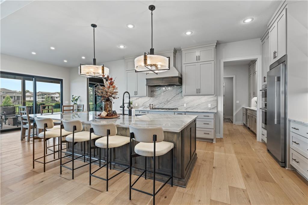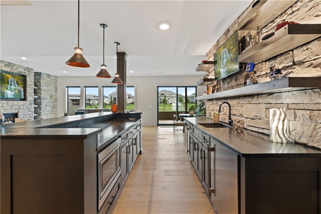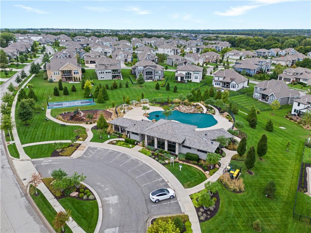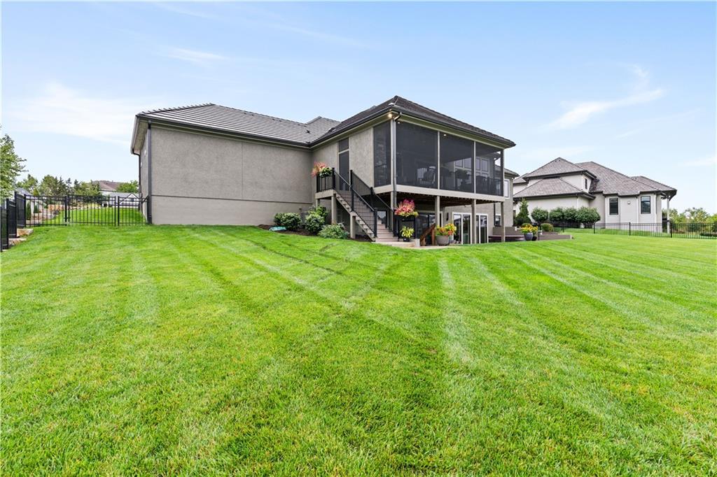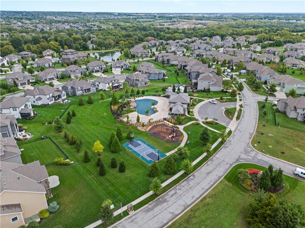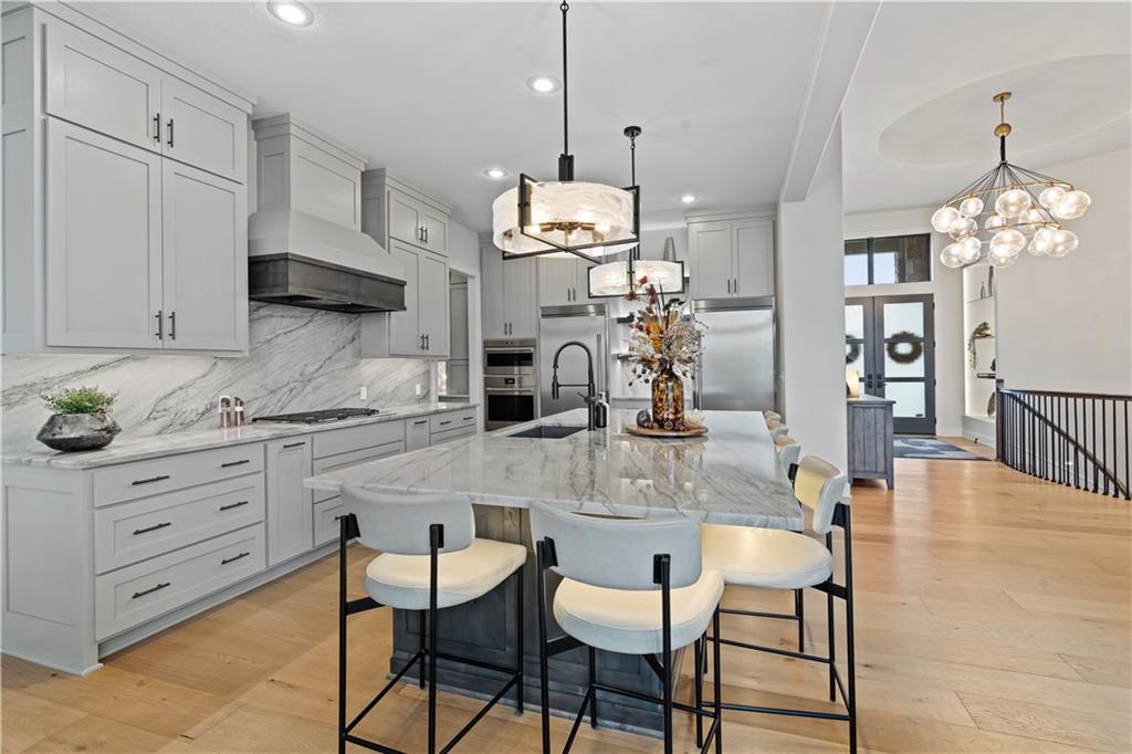 Poised within the prestigious Blue Valley School District, this award-winning Don Julian custom estate embodies the pinnacle of luxury living. Overlooking serene waters and dancing fountains, the residence offers a rare harmony of architectural excellence and natural beauty. The tranquil setting is best savored from the expansive main-level heated covered deck that connects the stunning four-seasons room. Every detail within reflects masterful craftsmanship and thoughtful design. With architectural LED lighting both interior and exterior, highlights the home's contemporary elegance. On the main level, the entrance meets you with glowing hardwoods that flow throughout both levels. The gourmet kitchen, appointed with Wolf appliances and luxurious finishes, anchors the open-concept living area—ideal for both intimate gatherings and grand entertaining. In the great room, remote-controlled window treatments reveal breathtaking lake views framed by cascading fountains.A graceful staircase leads to the lower level, designed as a private retreat and entertainment haven. Here, three ensuite bedrooms with walk-in closets complement an elegant wet bar, family recreation space, and a private music room—perfectly suited to transform into a wine cellar or recording studio.The unfinished space below the suspended garage offers endless possibilities like a home theater. Basement walkout access extends the living experience outdoors connecting to the patio and water views. Advanced home technology with a dedicated network hub with LUXUL gigabit switches, a PANAMAX MR4000 system, pre-wired for security system and in-ceiling Sonos speakers that encompasses the home in sound on both levels and the master bedroom.Enjoy year round energy efficiency with upgraded insulation and two laundry rooms for time efficiency. Blending timeless sophistication with modern innovation, this remarkable estate is more than a home—it is a statement of artistry and lifestyle in Terrybrook Farms