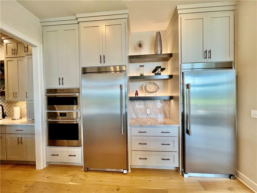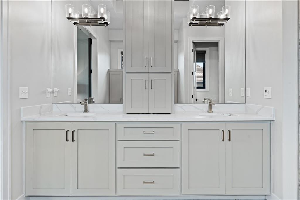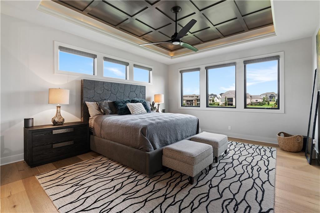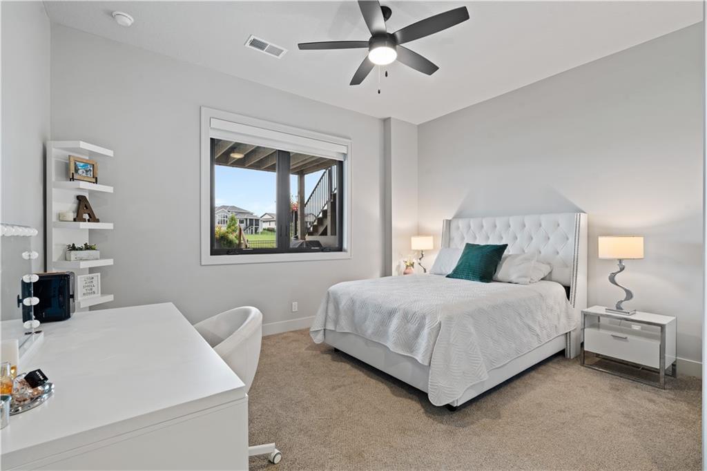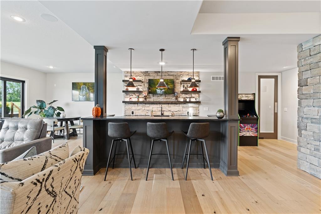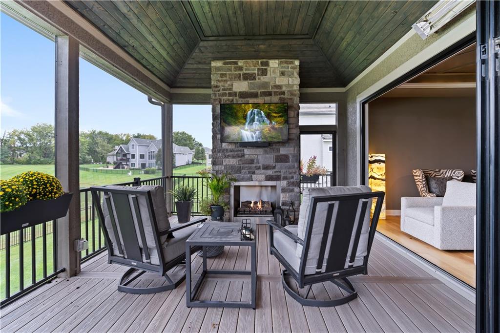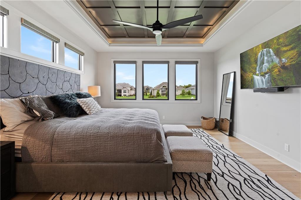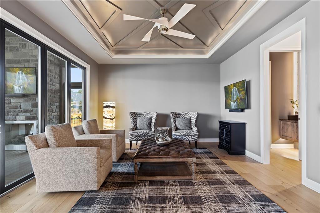 Poised within the prestigious Blue Valley School District, this award-winning Don Julian custom estate embodies the pinnacle of luxury living. Overlooking serene waters and dancing fountains, the residence offers a rare harmony of architectural excellence and natural beauty. The tranquil setting is best savored from the expansive main-level heated covered deck that connects the stunning four-seasons room. Every detail within reflects masterful craftsmanship and thoughtful design. With architectural LED lighting both interior and exterior, highlights the home's contemporary elegance. On the main level, the entrance meets you with glowing hardwoods that flow throughout both levels. The gourmet kitchen, appointed with Wolf appliances and luxurious finishes, anchors the open-concept living area—ideal for both intimate gatherings and grand entertaining. In the great room, remote-controlled window treatments reveal breathtaking lake views framed by cascading fountains.A graceful staircase leads to the lower level, designed as a private retreat and entertainment haven. Here, three ensuite bedrooms with walk-in closets complement an elegant wet bar, family recreation space, and a private music room—perfectly suited to transform into a wine cellar or recording studio.The unfinished space below the suspended garage offers endless possibilities like a home theater. Basement walkout access extends the living experience outdoors connecting to the patio and water views. Advanced home technology with a dedicated network hub with LUXUL gigabit switches, a PANAMAX MR4000 system, pre-wired for security system and in-ceiling Sonos speakers that encompasses the home in sound on both levels and the master bedroom.Enjoy year round energy efficiency with upgraded insulation and two laundry rooms for time efficiency. Blending timeless sophistication with modern innovation, this remarkable estate is more than a home—it is a statement of artistry and lifestyle in Terrybrook Farms