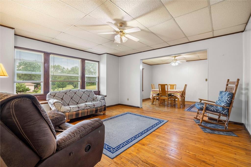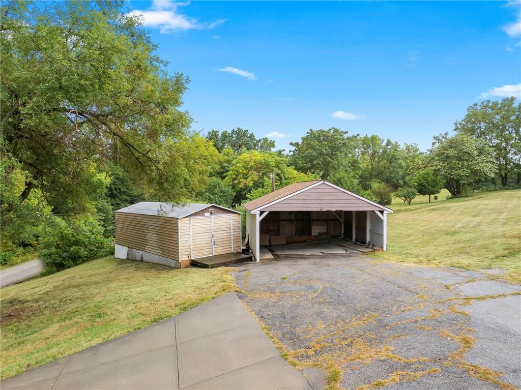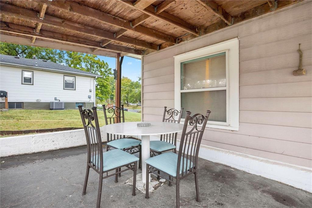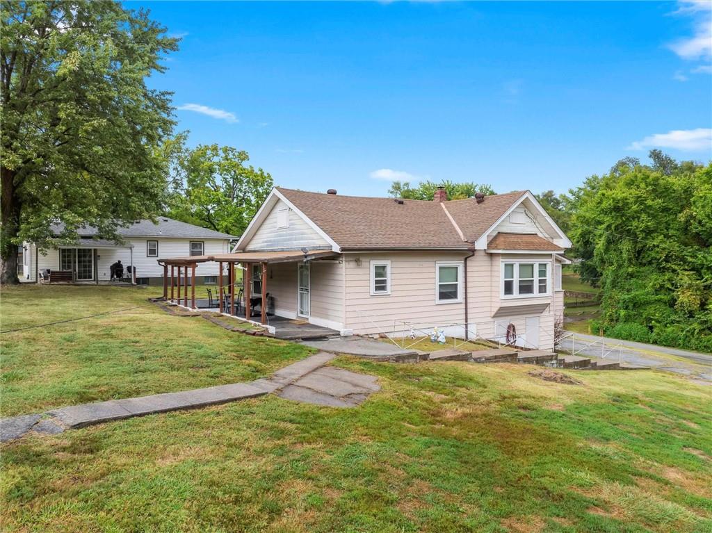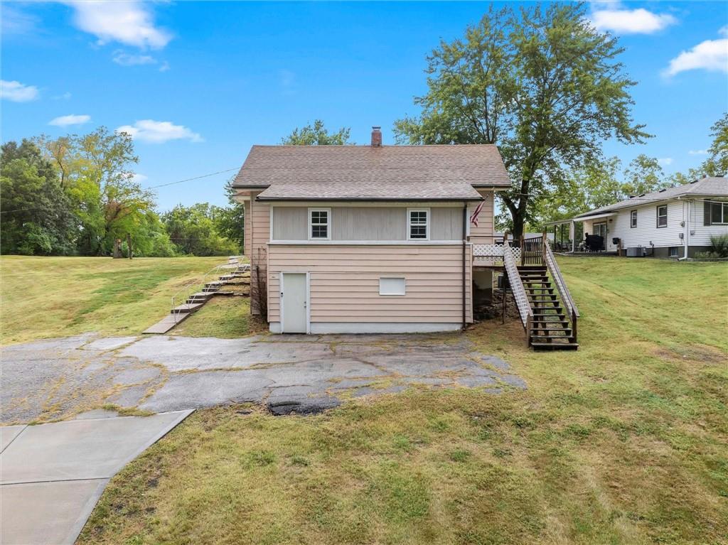 MOTIVATED SELLER!!! Nestled on nearly 2 acres this Grinter Heights home offers tranquility on roads less traveled yet close to everything KC. Main floor living provides a kitchen with well cared for stained cabinetry along with a freestanding gas range and a great view to the property. A large dining area and living room has beautiful wood floors and a lot of daylight through newer windows. Two nice size bedrooms along with a large bathroom with a newly resurfaced shower has lots of storage with built in cabinets. Enjoy the sunroom conveniently located right off the living room that also allows entry and exit from this space. The unfinished walkout basement includes an abundance amount of storage along with a nice shop. The exterior offers a two car carport, two sheds along with a nice size covered patio off the back of the home and right off the kitchen making grilling and entertaining a breeze. The land is nearly 2 acres and has partial fencing and backs up to greenspace. Roof is four years old along with newer HVAC and concrete drive. This property has been home to Halloween parties, hay rides and let's not forget the sleigh rides in the winter. This home located close to amenities yet a country feel on a quiet dead end road is a must see.
