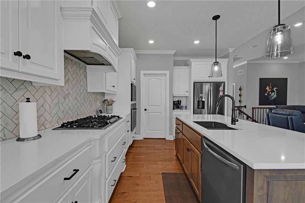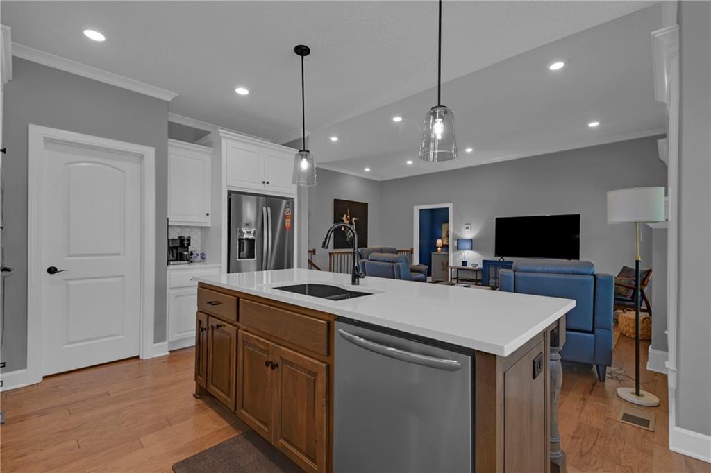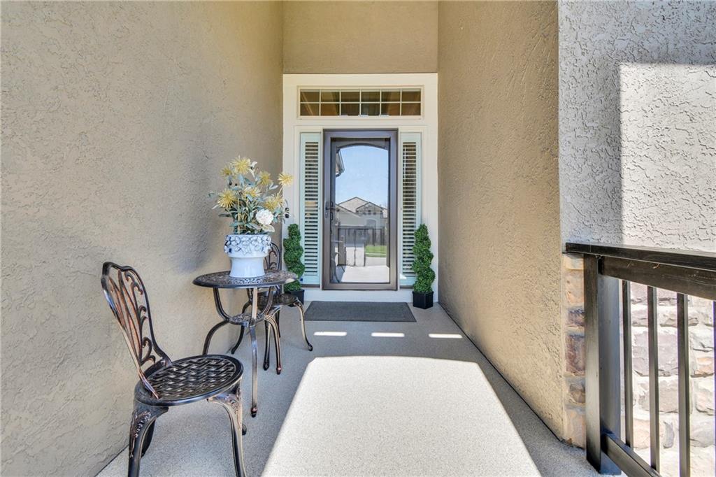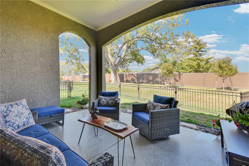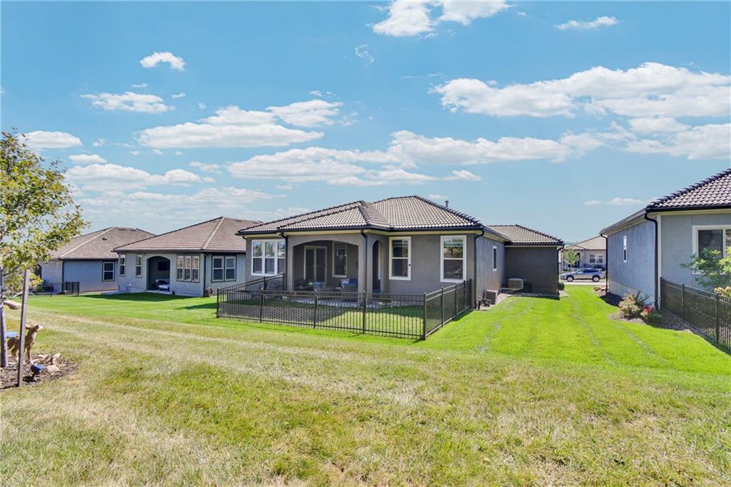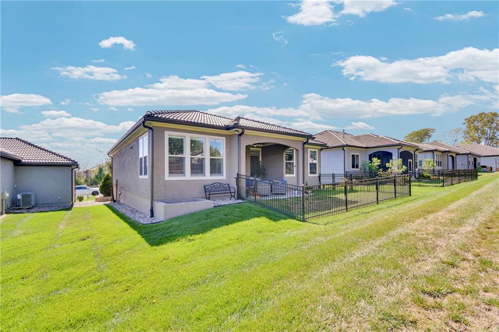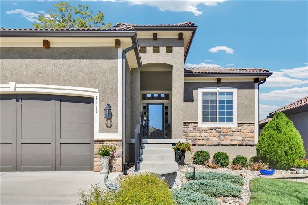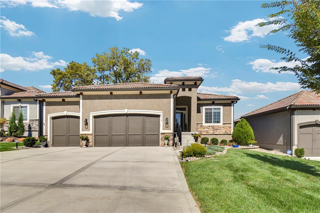 Fantastic opportunity & value in Woodside Ridge Villas! This exquisite Palermo plan blends style and function with a stucco exterior and durable tile roof for lasting curb appeal. The grand entry features intricate ceiling details and a modern light fixture, mirrored in the main-level primary bedroom with ambient tray lighting. Rich, stained cabinetry in the kitchen island and primary bath creates a cohesive flow, complementing the ceiling details. The kitchen dazzles with a marble-inspired herringbone backsplash, upgraded appliances including a built-in microwave/oven, gas cooktop, ustom wood vent hood & expansive pantry. The spa-like primary bath boasts a zero-entry shower, frameless glass door, soaking tub, and granite countertops that echo the tilework’s veining. Plantation shutters and stylish shades throughout enhance elegance and natural light control. Enjoy the covered front porch and rear patio, both featuring durable epoxy-coated floors, perfect for morning coffee, evening relaxation, or year-round gatherings. A sprinkler system keeps the lawn lush, and the over-sized garage also boasts a sleek epoxy-coated floor. The partially finished basement includes a 2nd living area, half bath, egress window for a potential third bedroom, and ample storage. A $143/mo fee covers lawn care and snow removal; the $1,100 annual HOA fee includes a competition-sized pool, clubhouse, pickleball court, walking trails, and trash service. Conveniently located near shopping & dining, and charming downtown Lee’s Summit. Buyer & Buyer's Agent to verify all information including square footage, zoning, taxes & room sizes during the Inspection Period.