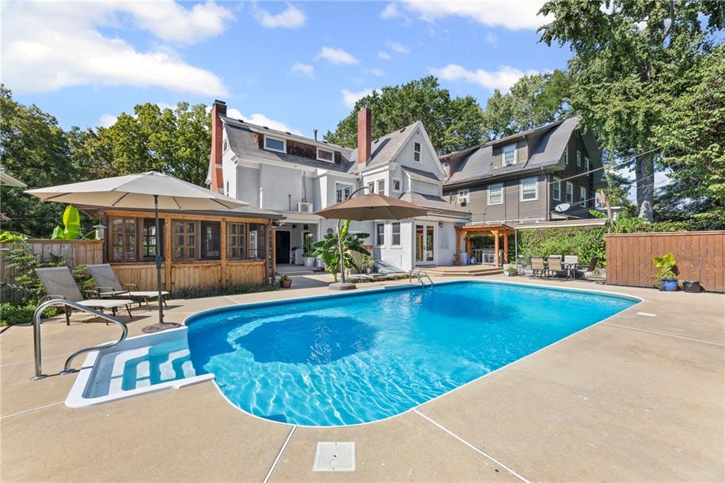 This stunning 3-story Central Hyde Park home perfectly blends historic character with modern comfort. Architectural details have been thoughtfully preserved, including original millwork, oak and fir hardwoods, walnut doors, and built-ins, while quality updates make the home ideal for today’s lifestyle. The main floor welcomes you with a formal dining room and a sunlit living room featuring a wood-burning fireplace with forced air insert. The fully remodeled kitchen is a showstopper, boasting a 7-foot island, granite countertops, stainless steel Thermador gas range, built-in convection oven and microwave, custom red oak cabinetry, and an oversized 11’ x 7’ butler’s pantry. Upstairs, the spacious primary suite includes a massive 15’ x 6’ walk-in closet, alongside two additional large bedrooms and full baths. The third floor offers incredible flexibility with a private apartment or mother-in-law suite with two bedrooms, full bath, kitchen, and its own entry; ideal for guests, extended family, or rental income. Step outside to your own private oasis. The beautifully landscaped backyard is designed for entertaining with a sparkling in-ground pool, a wide wrap-around veranda, multiple lounge areas, composite decking, a Premier Pro-Tall Tuff Shed with loft, and a custom-built “tub house” complete with hot tub. Modern upgrades enhance the home’s comfort and efficiency, including newer windows, zoned HVAC, dual water heaters, a security system, gated driveway, and a full walk-up basement with abundant storage. This home truly offers the best of both worlds, historic elegance and modern living in one of the city’s most desirable neighborhoods