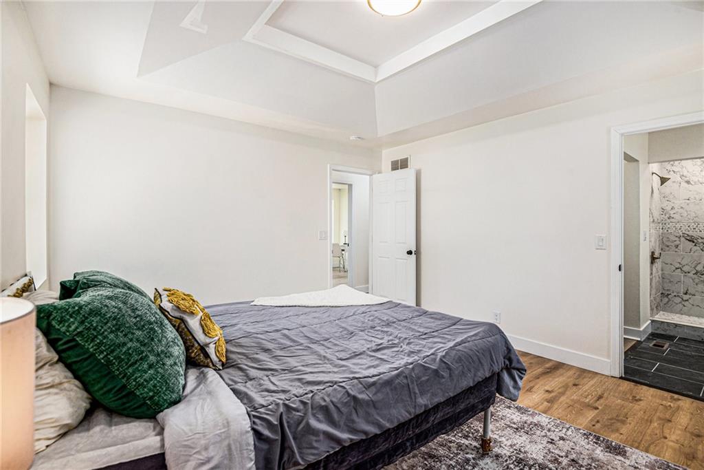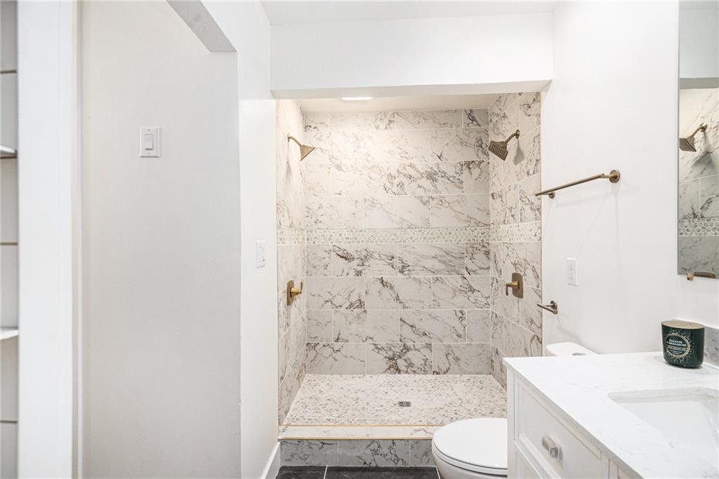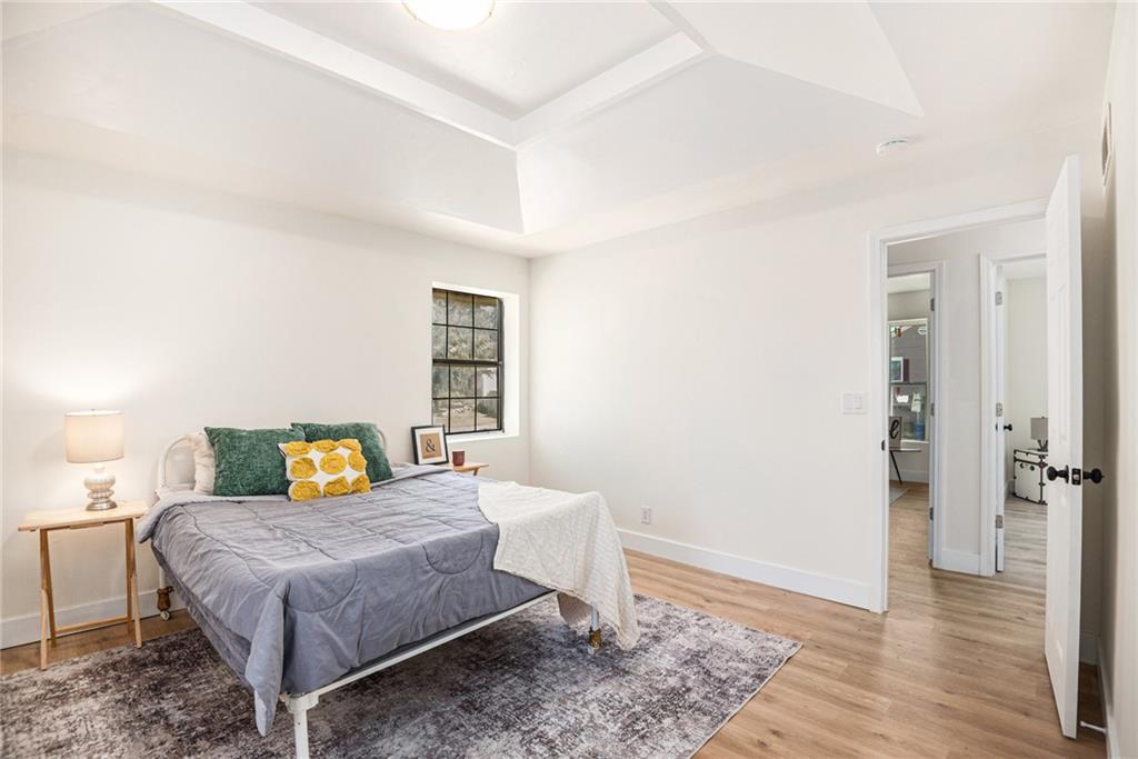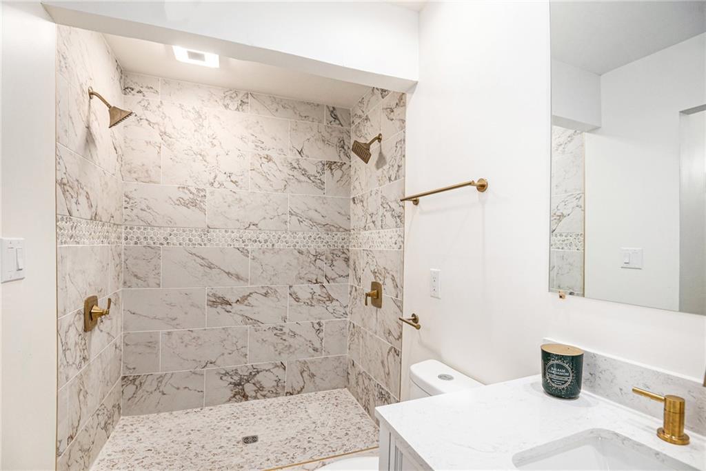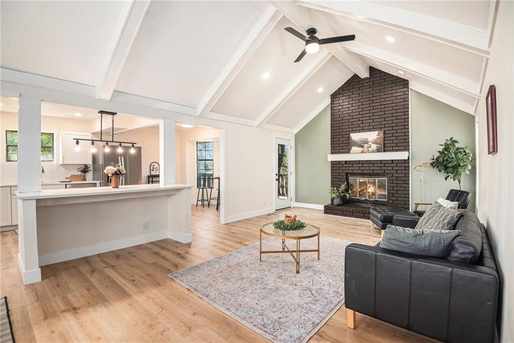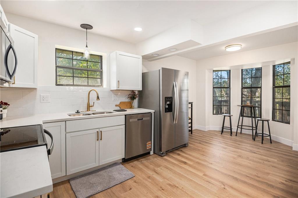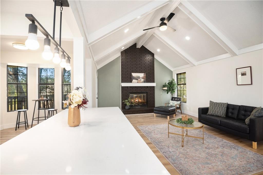 Refreshed with NEW LANDSCAPING, this beautiful 4-bedroom, 2.5-bath home is located in the sought-after Stonehaven South subdivision of Grandview! Featuring soaring vaulted ceilings and an open floor plan, this home blends modern updates with comfortable living. Step inside to a bright entry with stylish black iron railings leading up to a spacious living room anchored by a dramatic floor-to-ceiling brick fireplace. The brand-new kitchen boasts white shaker cabinets, quartz counters, stainless steel appliances, and brass accents—perfect for gathering around the bay-window breakfast nook. Both bathrooms have been tastefully renovated with sleek tile, quartz vanities, and modern finishes. The master bathroom features a custom shower with a double shower head and a walk-in closet. The walk-out lower level provides additional living space, a 4th bedroom, a half bath, and access to the oversized 2-car garage. Enjoy outdoor living on the private deck surrounded by mature trees. This home sits on a quiet street and is move-in ready with fresh paint and flooring throughout. 4 Bedrooms | 2 Full and 1 Half Baths New Kitchen & Baths Vaulted Ceilings & Fireplace Fresh Paint & Flooring 2-Car Garage