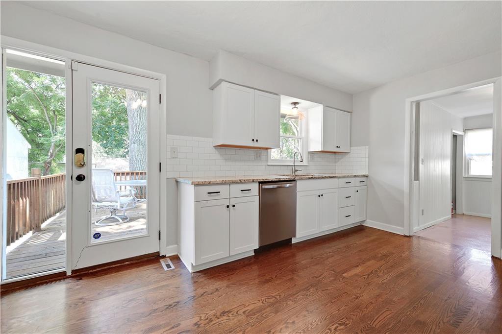 This inviting home features a classic layout with recently updated hardwood and tile floors on the main level. The remodeled eat-in kitchen offers granite countertops, ample cabinet space + pantry storage. A versatile side room can serve as a mudroom with walk-in pantry, a home office or a spacious dining area. Finished walkout lower level includes a recreation room, laundry, storage and possible third bedroom with full bath. A massive detached two-car garage provides exceptional storage, while the additional powered outbuilding is perfect for a potting shed, workshop, or even a fun backyard Tiki bar. Relax or entertain on the spacious two-level deck, ideal for BBQs and gatherings. Enjoy the walkable location near restaurants and shops, with quick highway access and the sought-after Shawnee Mission School District. Situated in friendly Downtown Overland Park, you'll have easy access to a vibrant array of local restaurants, shops and parks. Explore the OP farmer's market, stroll quaint Downtown shops, visit area historical attractions + museums. Boutique shop, or dine at one of the many nearby eateries – the possibilities are endless.
