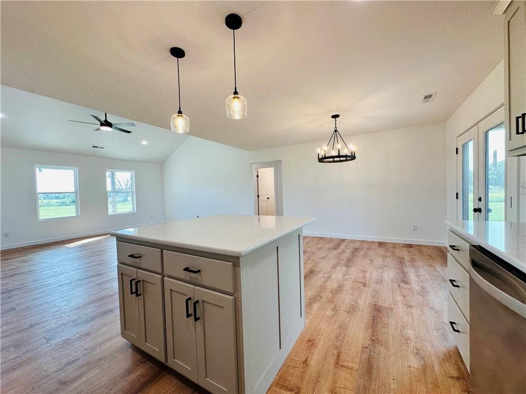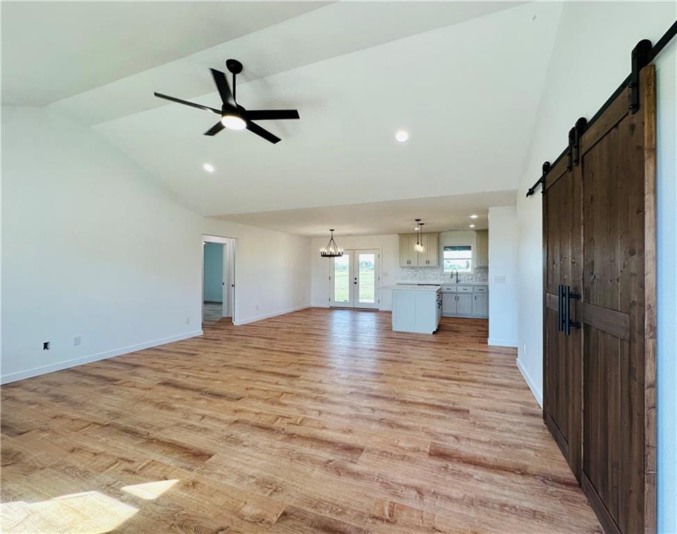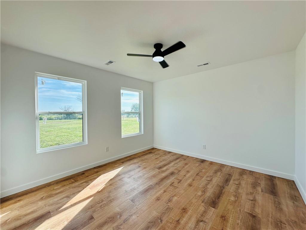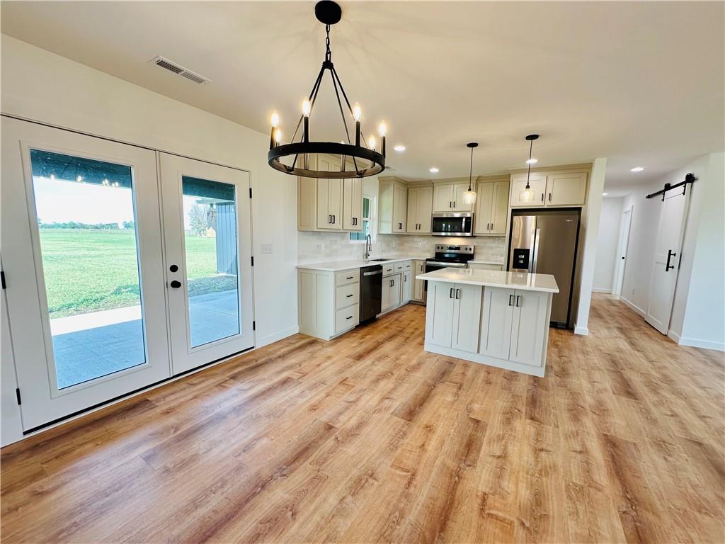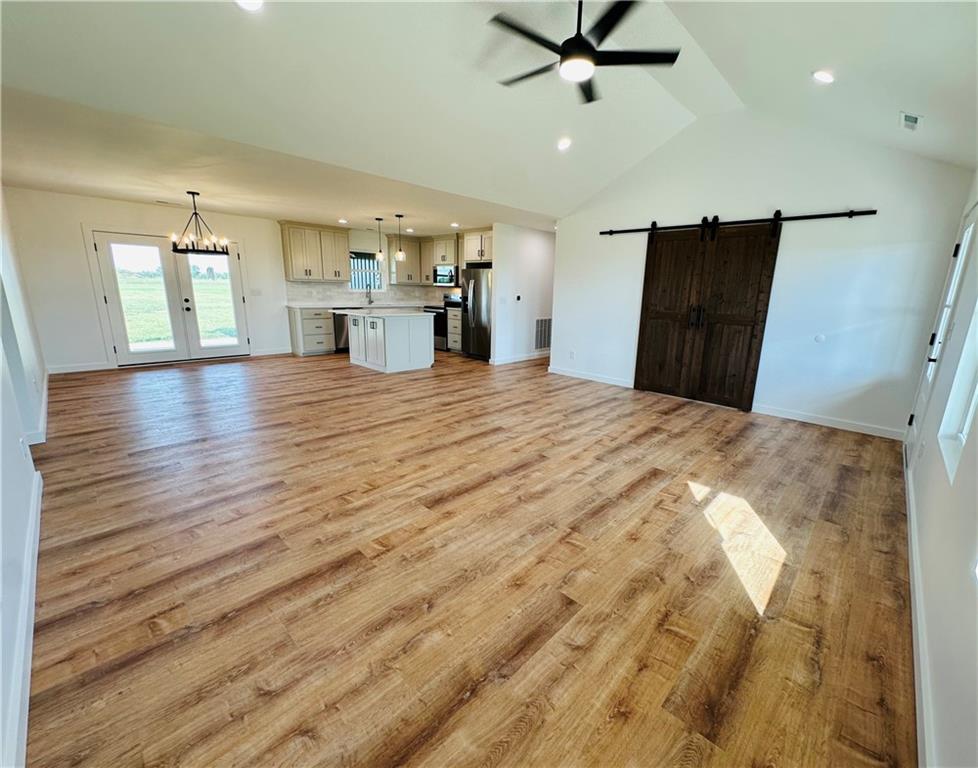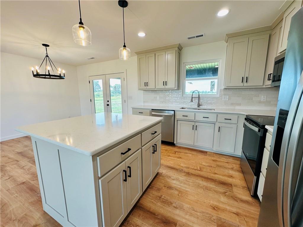Welcome to this stunning, brand-new, custom-built home situated on two acres of picturesque prairie land. This slab home features a metal roof and siding with a partial stone front, offering low-maintenance living while combining modern design with serene country charm. Conveniently located on a paved road just two miles west of Highway 69 and ten miles north of Pittsburg, KS, the property provides both privacy and easy accessibility. Inside, the open-concept floor plan showcases a spacious living room with vaulted ceilings and expansive windows that frame unobstructed prairie views. The kitchen is equipped with custom cabinetry, quartz countertops, a striking backsplash, and a large central island, complemented by a complete four-piece stainless steel appliance suite, and a spacious pantry. Lifeproof luxury vinyl flooring and recessed lighting flow throughout the home, offering both durability and contemporary style. This home includes four bedrooms, one of which can serve as an office or flex space, along with two full bathrooms featuring custom vanities with quartz tops. The primary suite offers a generous walk-in closet, double vanities, and a walk-in shower, while each additional bedroom provides ample storage. A thoughtfully designed mudroom and laundry area, complete with custom cabinetry and a built-in hall tree, enhance everyday convenience. This property is completed by a spacious two-car garage and covered front and back porches, ideal for enjoying the scenic surroundings. With its high-quality construction, modern finishes, and tranquil setting, this property represents a rare opportunity for those seeking a new construction home in the country! Don’t miss your chance to make this home yours—schedule your private showing today! Note: listing agent is directly related to seller.