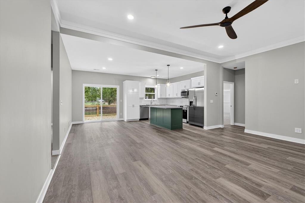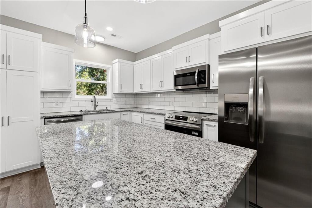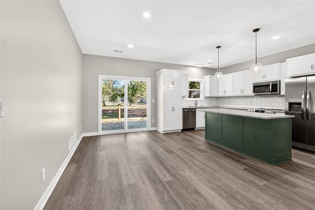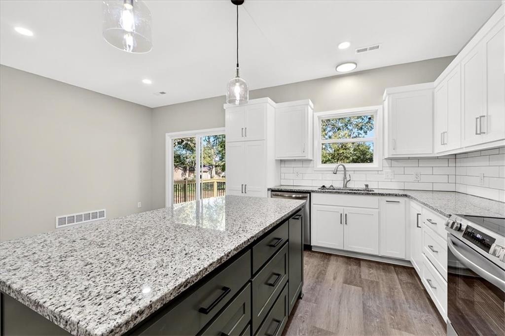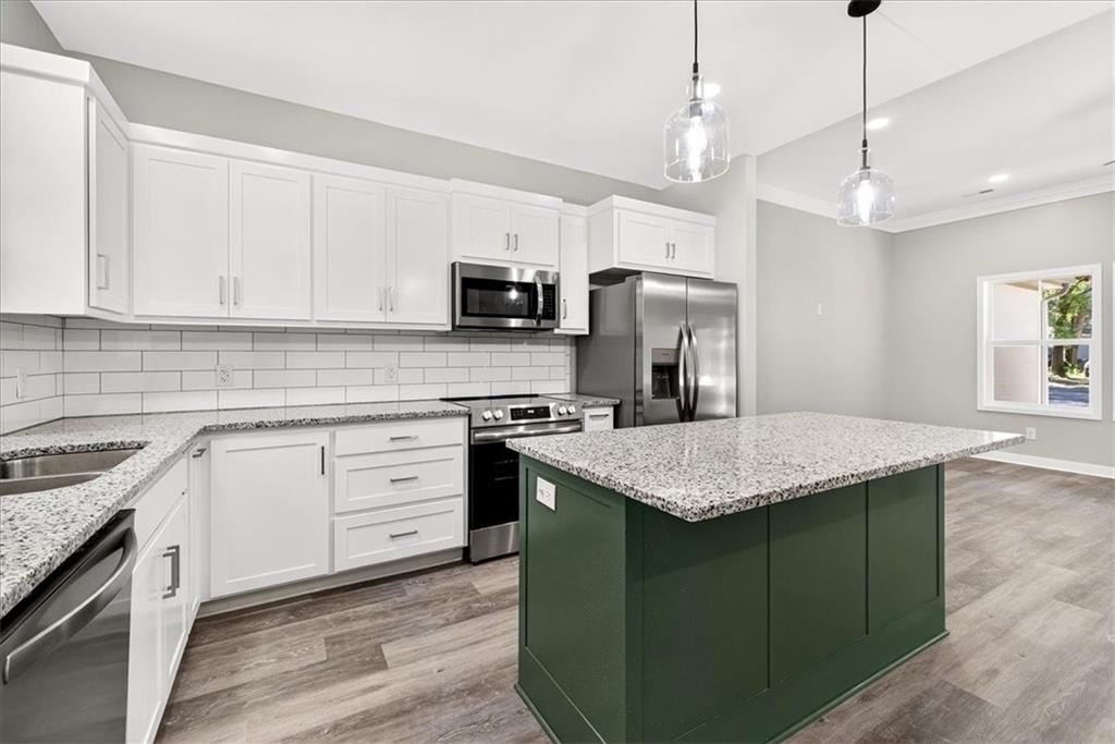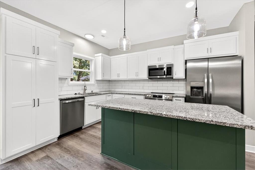 Welcome to this brand-new, beautifully finished home offering the perfect blend of modern style and everyday comfort. Step inside to find an open-concept layout with luxury vinyl plank flooring, tall ceilings, and abundant natural light. The kitchen is a showpiece—featuring crisp white cabinetry, granite countertops, stainless steel appliances, and a striking green island that adds character and warmth. The primary suite includes a spa-like bath with dual sinks, a tiled shower with glass doors, and a spacious walk-in closet. Additional highlights include upgraded fixtures, neutral tones throughout, and a convenient main-level laundry room. Outside, enjoy a brand-new deck overlooking a tree-filled yard with plenty of room to play, garden, or entertain. Bonus opportunity: Buyers have the option to purchase the adjoining lot expanding the property to nearly half an acre—a rare find for new construction!