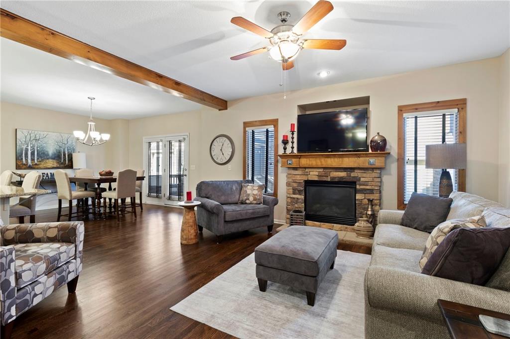 Maintenance provided living at its best in this stunning Tom French–designed Winston plan townhome, perfectly located in the highly sought-after Villages of Quail Park. This gorgeous neighborhood is known for its lush, manicured landscaping and inviting curb appeal, and this home is tucked onto a quiet cul-de-sac with a shared driveway, creating both privacy and charm. The ledge stone and stucco exterior welcome you to a covered front porch and storm door entry. Inside, gleaming hardwood floors set the tone, flowing past a stately half bath with granite vanity and into the spacious great room. Centered by a stone fireplace flanked by large windows, the great room creates a warm and inviting space that seamlessly connects to the breakfast area. From here, step through French doors to the screened-in deck with access to a flagstone patio and small yard—an ideal spot for morning coffee or evening relaxation. The kitchen offers a granite breakfast peninsula, stainless steel appliances, and two access points to the laundry room, one leading directly to from the kitchen and the other from the main entry hallway. Upstairs, a versatile loft/office area provides additional living space, perfect for working from home or relaxing with a book. The owner’s suite is a true retreat with plush carpet, ceiling fan, and French doors that open to a spa-like en suite bath featuring a jetted tub with tile surround, separate shower with ledge, double granite vanity, and large walk-in closet. Two additional bedrooms, each with ceiling fans, blinds, and soft carpet, share a hall bath with tile flooring, an extended granite vanity, and shower. The daylight, unfinished lower level is stubbed for a bath and offers excellent storage now with the opportunity to expand living space in the future. Blue Valley Schools add to the value of this thoughtfully designed home in a community where comfort, convenience, and timeless style come together.