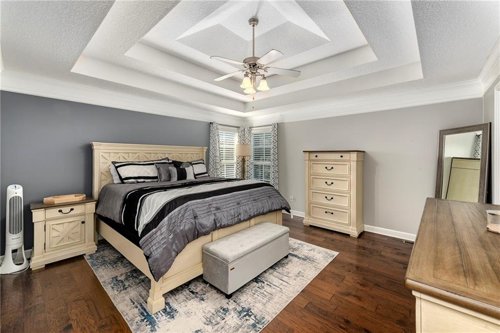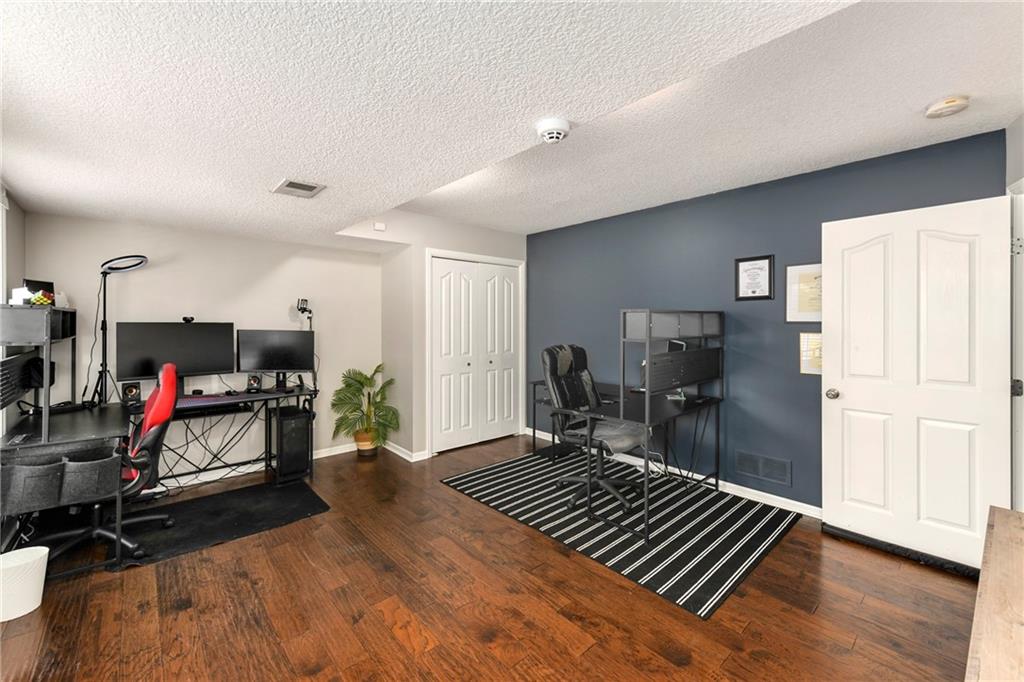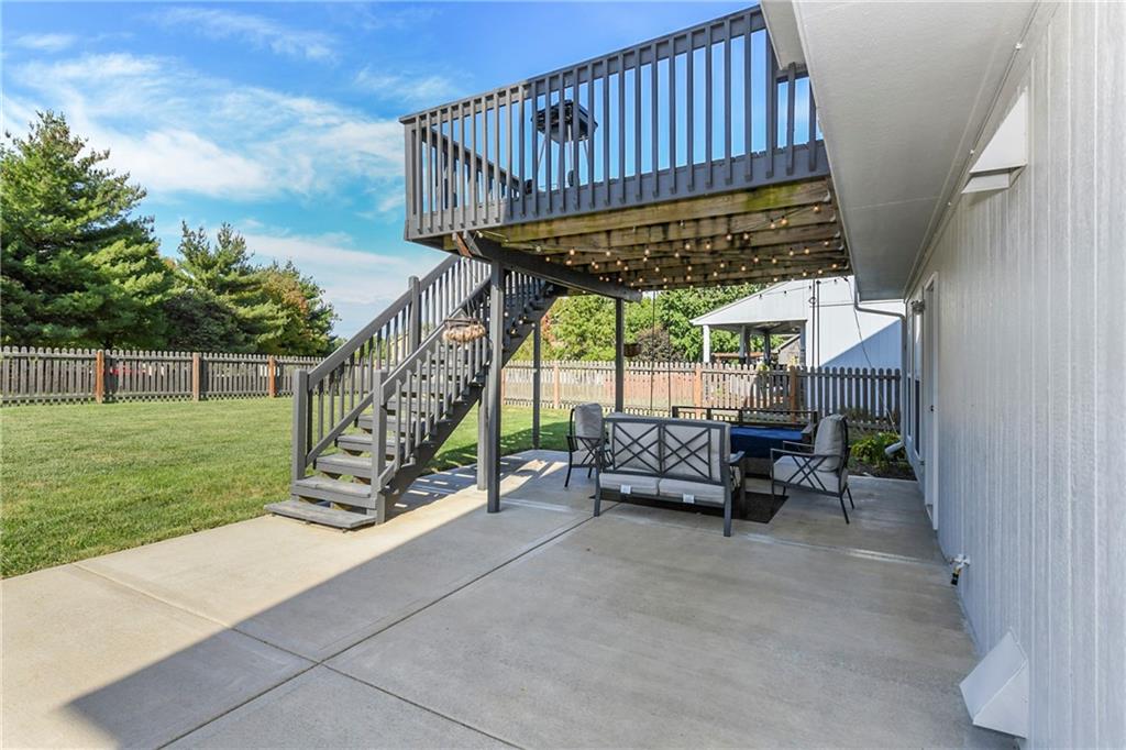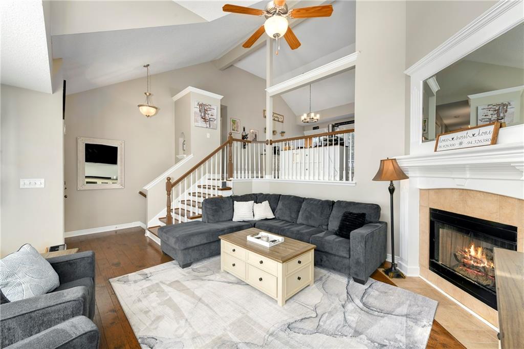 Plenty of time to move in before your first holiday feast lights up this much-sought-after Carriage Point gem, nestled on a peaceful cul-de-sac. 4 true bedrooms & 3 full baths! This beautiful front-to-back floor plan is expansive with its vaulted ceilings and staggered levels that allow natural light to beam in and kiss every inch of this updated home with fresh vitamin D. Also, a gas log fireplace in the living room adds instant warmth. Newer hand-scraped hardwood floors gleam throughout, tying in with the newer paint, sleek modern lighting, updated plumbing fixtures, and newer vinyl windows with included window treatments that elevate every room. The kitchen steals the show next, with bright white quartz countertops, backsplash, stainless steel appliances (all staying put), and a pantry loaded with pull-out shelving. That glass-top range? Effortless cleanup for your home's chef. Adjacent, the dining room flows onto the painted deck, w/ stairs descending to the patio. Spacious primary is a private escape, boasting a custom closet system in XL walk-in and an en-suite bath w/ double vanity, tiled floors, separate shower, and jetted tub—perfect for sinking into spa-like bliss on those unwind days. Laundry's right on the main level for everyday ease, sharing space with three more true bedrooms. The true fourth bedroom is an XL standout, doubling as prime flex space—a home office, playroom, or man cave—with direct walkout to the covered patio (sheltered by the painted deck overhead), complete with a custom bed-sized swing and string lights for outdoor ambiance & magic. From there, the lush, green yard unfolds, wrapped in a privacy fence for seclusion. The deep three-car garage stores vehicles and extra gear, while the sub-basement offers bonus square footage for storage, a future workout haven, or more flex uses. And location? Prime proximity to Lee's Summit schools, swift highway ramps, and a bounty of shopping & dining hotspots.