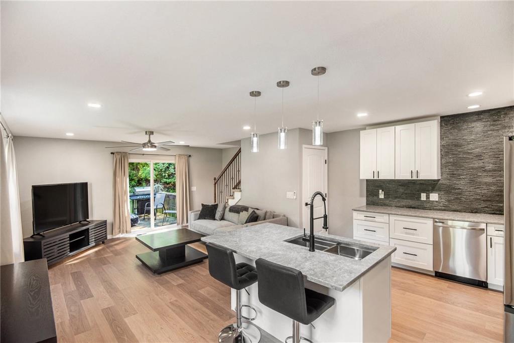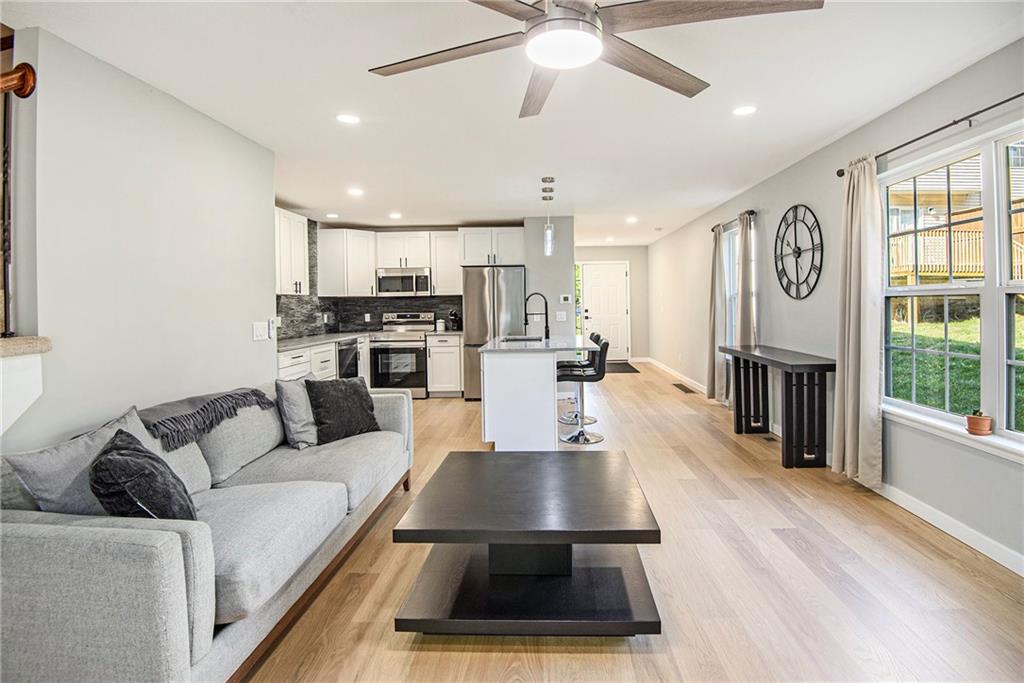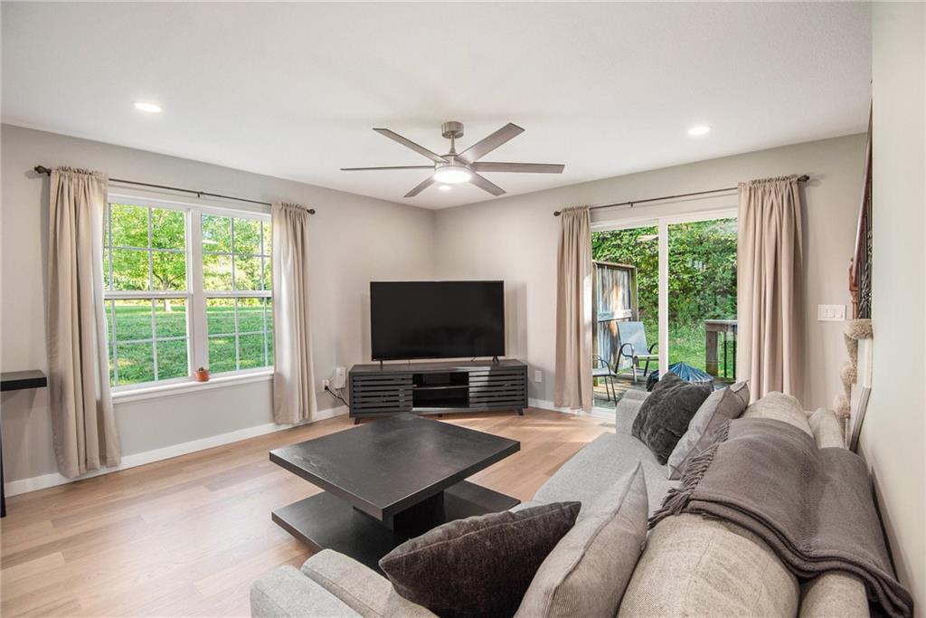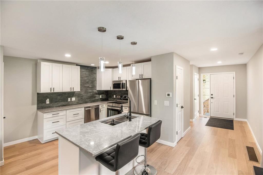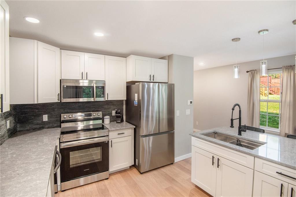 Renovated End-Unit Townhome where Modern Style Meets Everyday Comfort! Welcome home to this move-in-ready townhome that has been beautifully overhauled with high-end finishes and thoughtful design tucked in a cul-de-sac with a long drive way to provide plenty of parking. This 3-bedroom, 2-full bath, 2-half bath home blends style, function, and privacy in one perfect package. Step inside to all-new LVP flooring, a sleek kitchen with new quartz counters, new cabinets, stylish backsplash, and stainless steel appliances (fridge included!). The half bath features new cabinetry, and fresh paint and lighting updates flow throughout the space. Upstairs, the large primary suite impresses with vaulted ceilings, a full en-suite bath, and a walk-in closet. Two additional bedrooms share a Jack & Jill bath, each with spacious closets. Laundry is on bedroom level making it super convenient, and washer and dryer stay! The finished basement offers flexible living and has been recently finished with LVP flooring, a custom built-in desk, and even a coffee nook. Whether you need a home office, entertainment space, or playroom, there’s still room to make it your own, plus a convenient half bath rounds it out. Enjoy your morning coffee or evening wind-down on the private deck that backs to trees, offering rare privacy in a townhome setting. With a beautiful renovation already done for you, new flooring, fixtures, cabinetry, and more, this end-unit is the turnkey opportunity you’ve been waiting for. Prime KC location + modern updates = the perfect home.