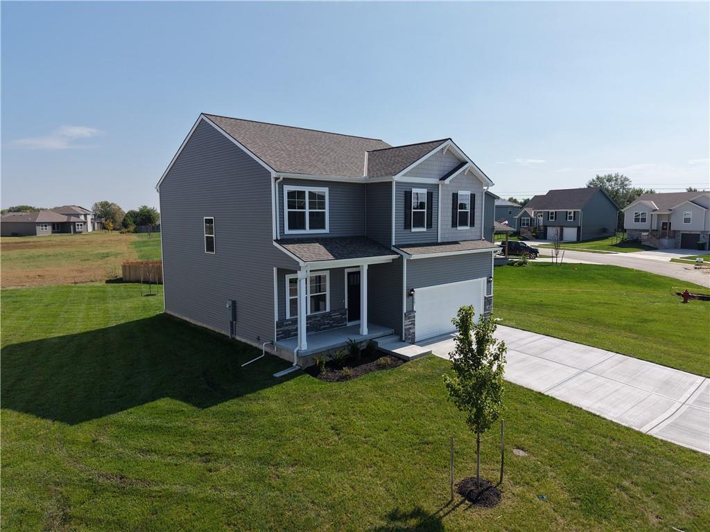 Built by D.R. Horton Inc®, this stunning residence is our Bellamy Plan, which combines superior craftsmanship with the latest in-home design, creating a space that’s as functional as it is beautiful. This 4-bedroom, 2 1/2-bathroom, 2-story home is situated in Peculiar, MO. Comfortably nestled in the heart of our Tuscany community. As you step inside, you’ll be greeted by 9-foot ceilings and an abundance of natural light. The heart of this home is undoubtedly the Chefs Kitchen, featuring a Chef-inspired Gas Range, gorgeous 36-inch painted maple cabinets, beautiful white quartz countertops, and top-of-the-line Whirlpool® stainless steel appliances. Which will all be perfect for both everyday meals, as well as entertaining guests. The Primary suite is a generous space, leading to our Primary Ensuite bathrooms. All of which are designed to be your own personal sanctuary, with features like quartz-topped vanities, Moen® Chrome Faucets, and a walk-in shower, helping to create a serene retreat from the hustle and bustle of daily life. This home is also equipped with cutting-edge Smart Home technology. Control your environment effortlessly with a Honeywell® Pro Z-Wave® Thermostat, Amazon Echo, and a connected home panel, all designed to make your life easier and more comfortable. LED lighting throughout the home and energy-efficient windows ensure that this home is as practical as it is beautiful. From luxury vinyl flooring to a garage complete with openers, every detail in this home has been thoughtfully considered. This Beautiful 2 story also features a full, unfinished basement already stubbed for plumbing to aid in future growth opportunities. Don’t miss the opportunity to own this exceptional property in Tuscany!