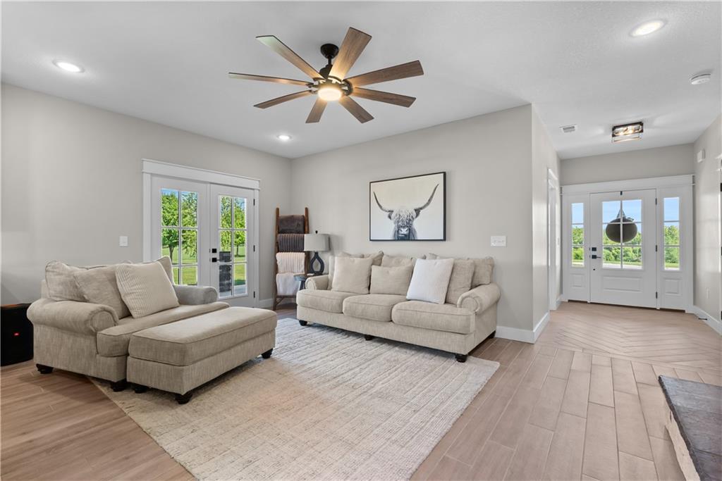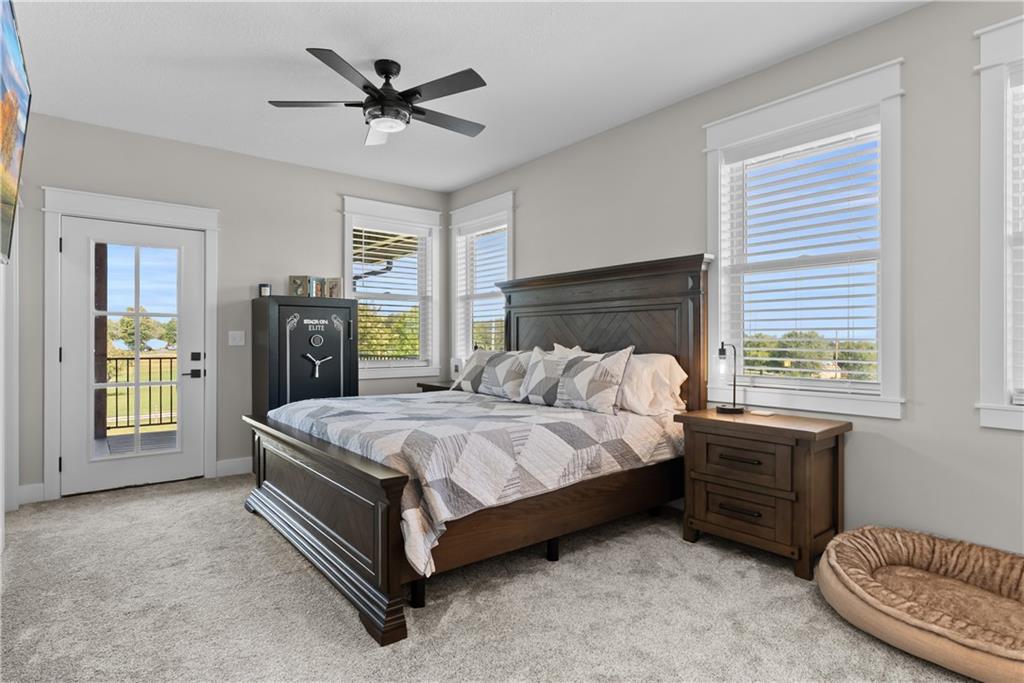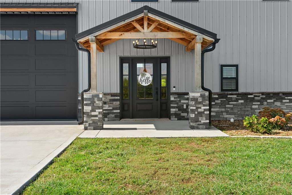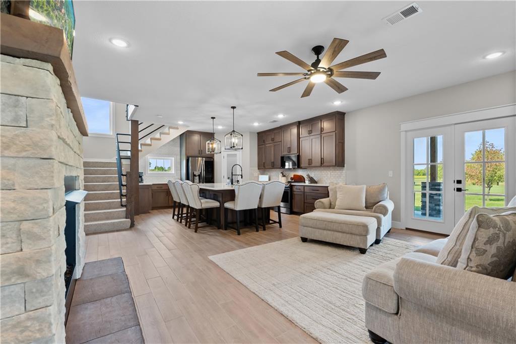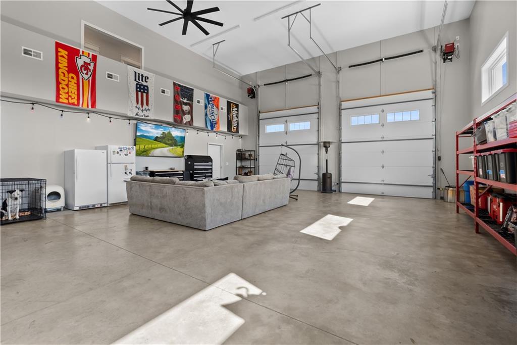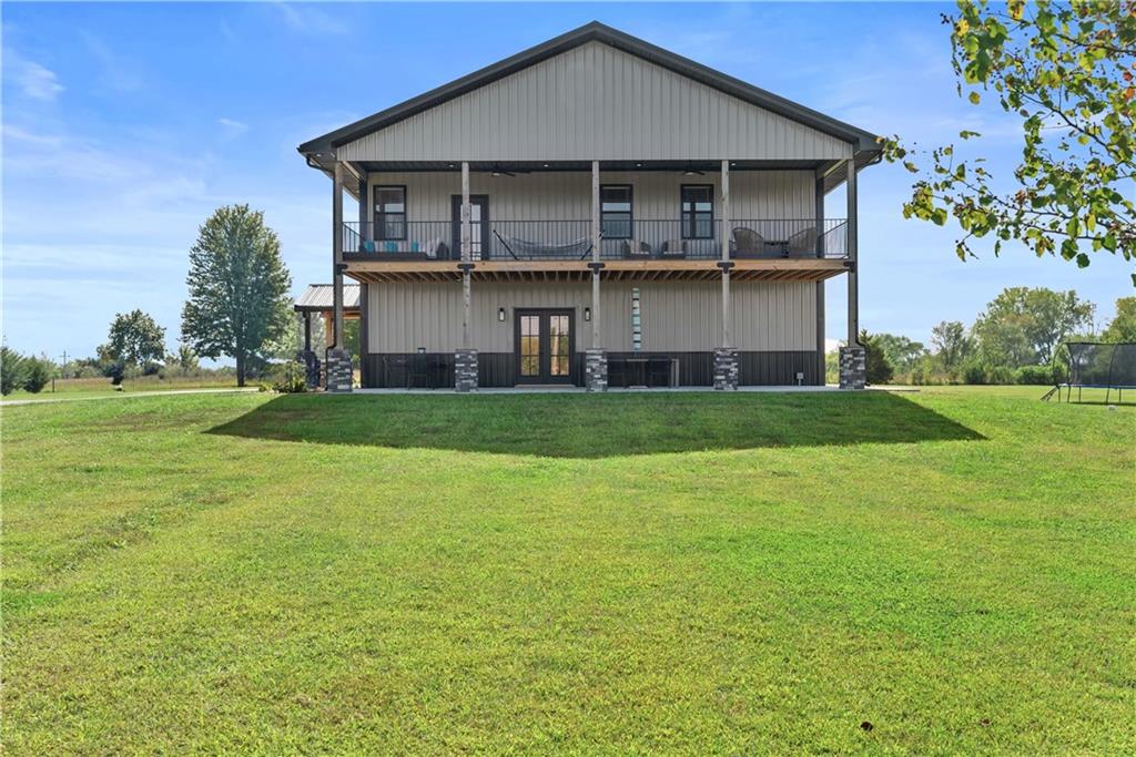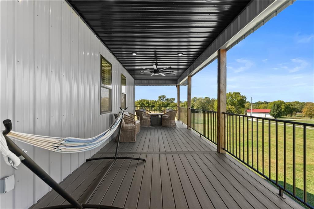 Welcome to this stunning 2-year young custom barndominium situated on 10 acres in Johnson County with the advantage of low taxes. Built with 2x6 walls and extra insulation, this home blends efficiency, style, and country living. Step inside to find an open floor plan featuring a gorgeous kitchen with quartz countertops, a walk-in pantry, large island, and a coffee bar—perfect for gatherings. The living area offers a cozy gas fireplace and 9-foot ceilings throughout the main floor. Convenient main-level laundry and a walk-in shower are also included. Upstairs, you’ll find 2 spacious bedrooms, each with a large walk-in closet, along with a deck overlooking the acreage. The home also includes a 1200 sq. ft. garage area with soaring 20-ft ceilings, offering endless possibilities for vehicles, storage, or a workshop. Enjoy the outdoors with a large covered patio on the main level, second-floor deck, and a fully fenced outbuilding ideal for animals. The owner, who built the home himself, thoughtfully added numerous upgrades throughout. This property delivers the perfect mix of modern comfort and rural charm—ready for its next chapter.