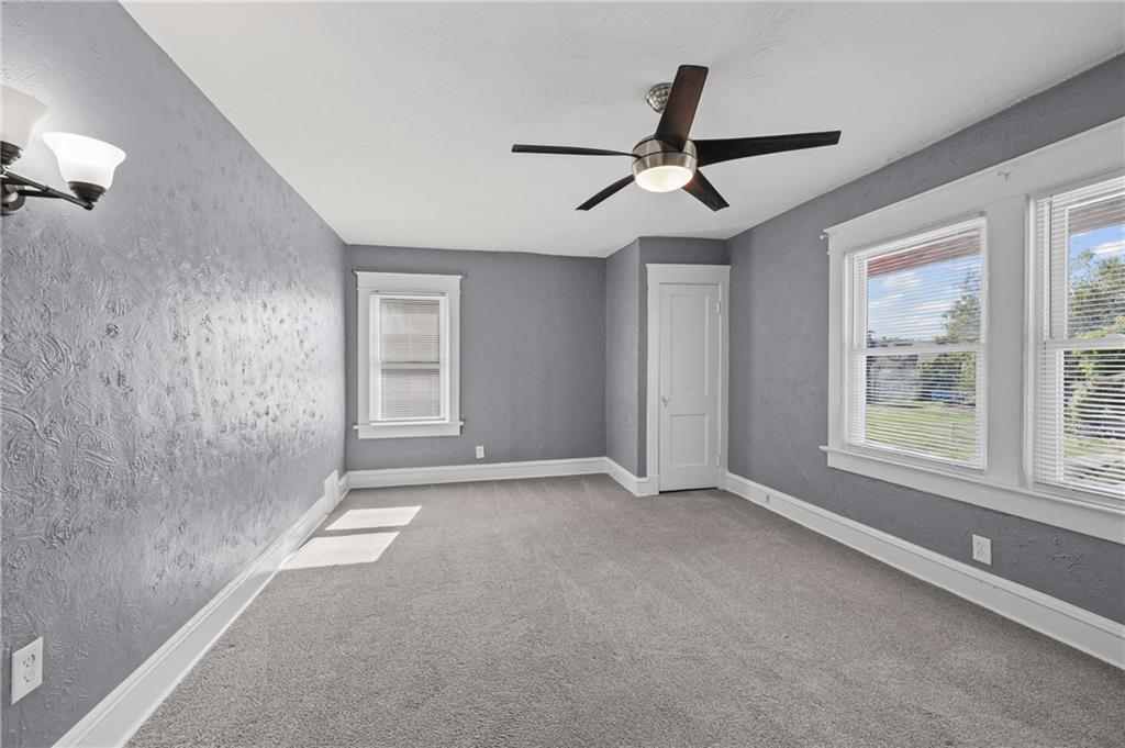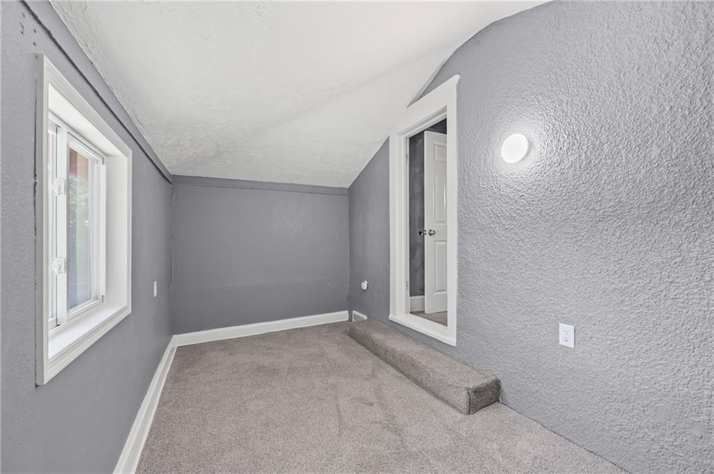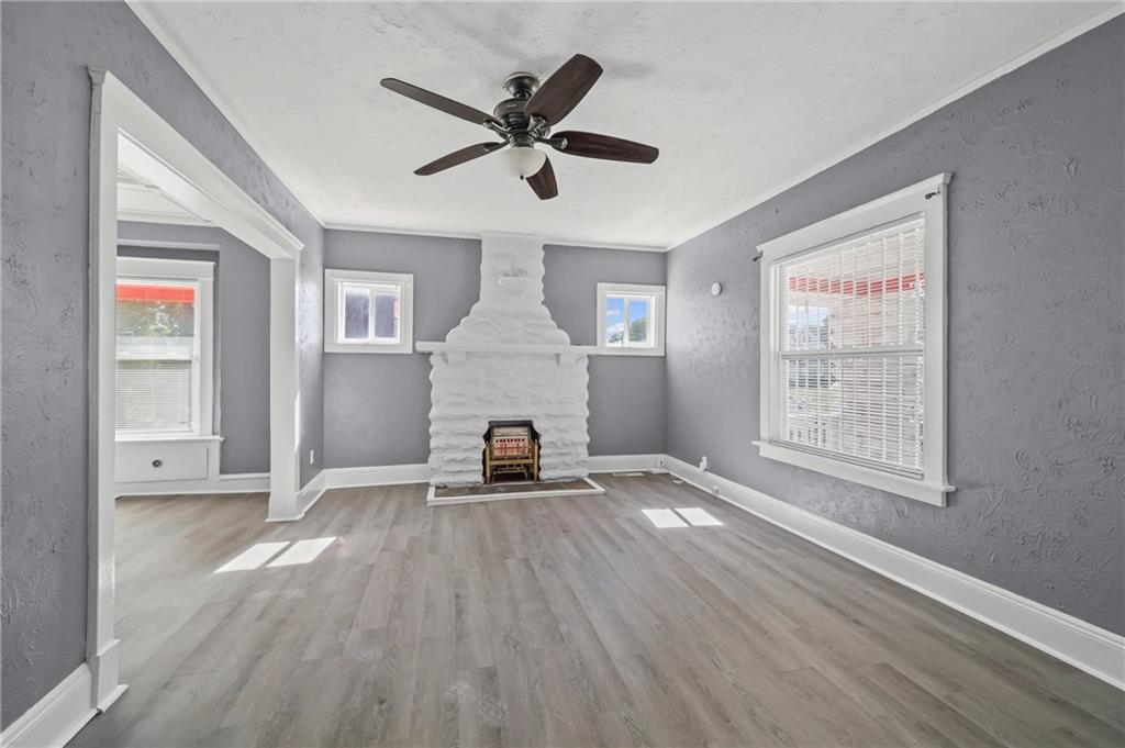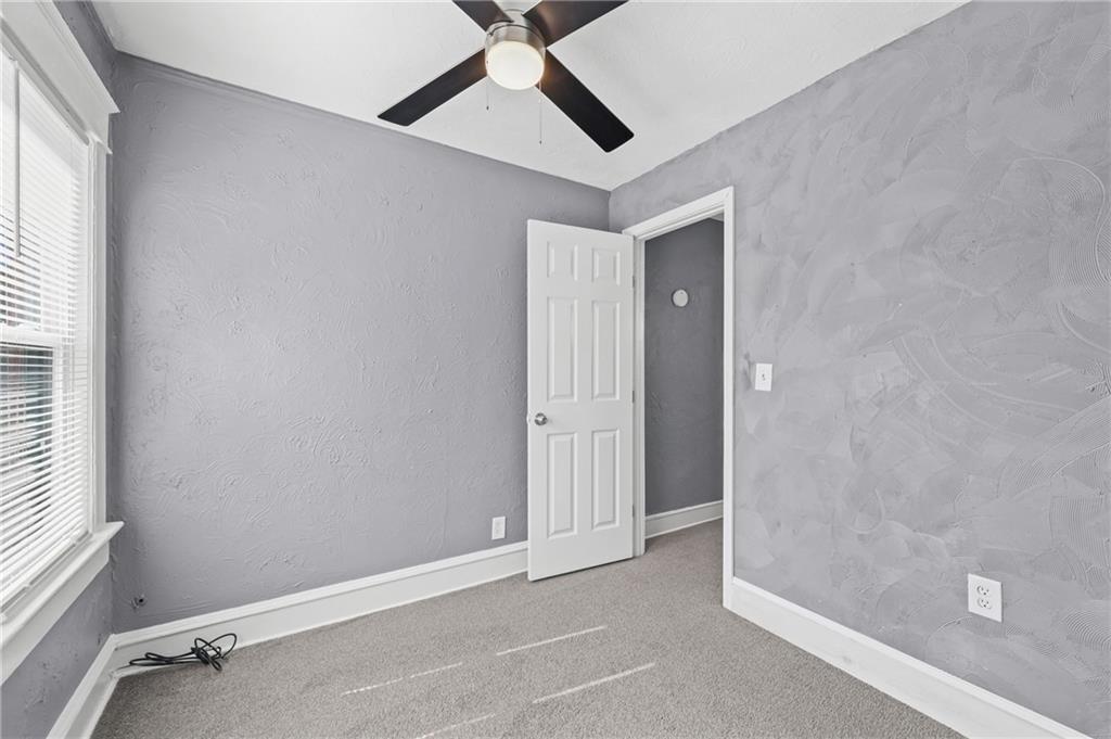 Discover the perfect blend of classic charm and modern convenience in this delightful 2-story home, located at 3427 Agnes Avenue in Kansas City. This property offers a welcoming atmosphere with its vibrant red exterior, complemented by a covered front porch featuring distinctive stone pillars. The home provides ample space for both relaxation and entertainment, with a functional and inviting layout. Upon entering, you are greeted by a spacious open-concept living and dining area, distinguished by elegant coffered ceilings and a decorative painted brick fireplace that serves as a beautiful focal point. The interior is freshly painted in a neutral gray with crisp white trim, creating a bright and airy feel throughout. Large windows allow for an abundance of natural light, enhancing the sense of space. The main living areas feature attractive and durable laminate flooring, providing a seamless flow from room to room. Thoughtful built-in cabinetry and a cozy window seat add to the home's character and provide practical storage solutions. The galley-style kitchen is well-equipped with dark wood cabinetry, offering plenty of storage, and is paired with stylish granite-look countertops. The kitchen comes complete with a refrigerator, stove, and microwave, making it ready for all your culinary endeavors. A convenient pantry provides additional storage space for your kitchen essentials. This home includes multiple comfortable bedrooms, each featuring ceiling fans and ample natural light. The updated bathroom is clean and modern, with a white tub and shower combination and contemporary fixtures. For outdoor enjoyment, a wooden deck at the rear of the house provides a private space for grilling and relaxing. The fenced backyard also includes two sheds for extra storage. With its combination of traditional architectural details and recent updates, this home is move-in ready and waiting for you to make it your own.
