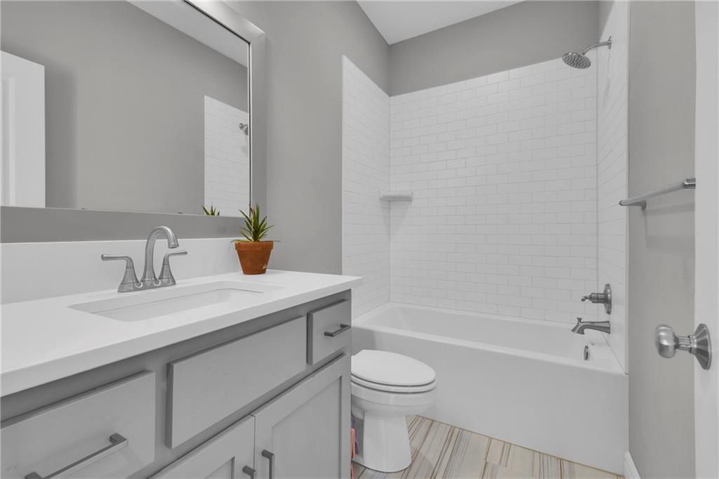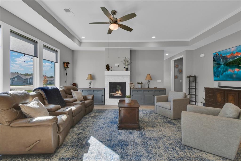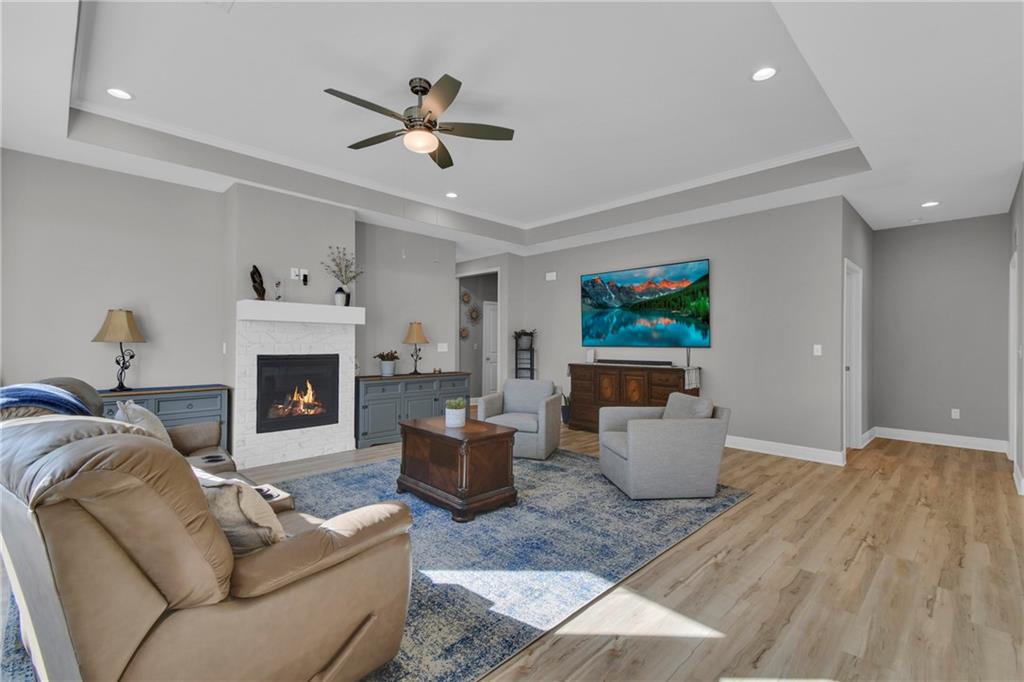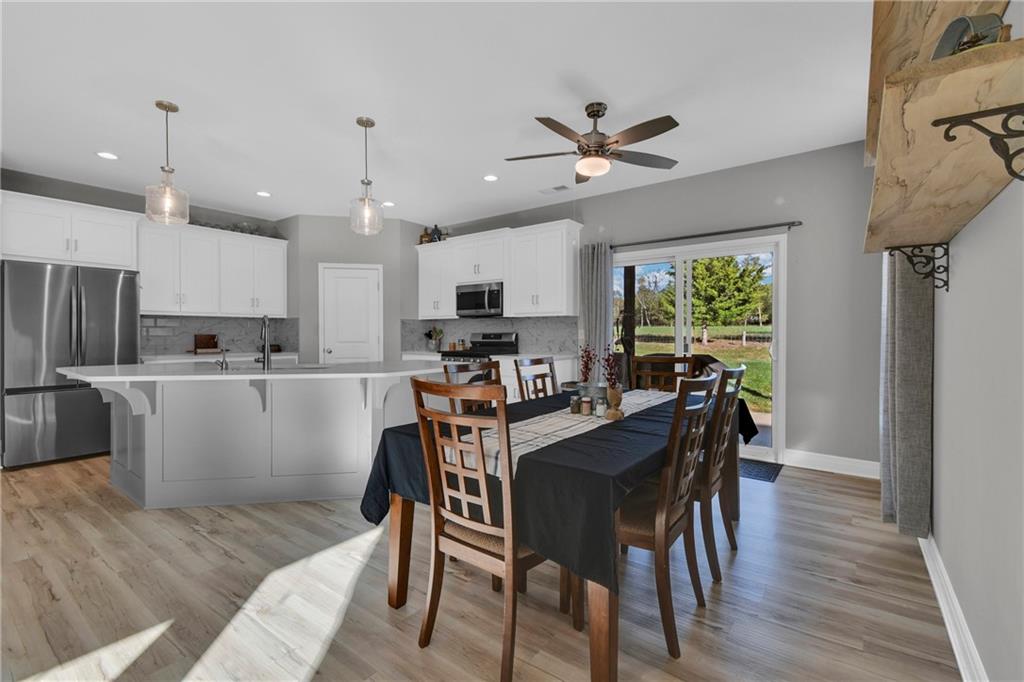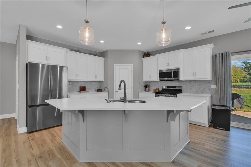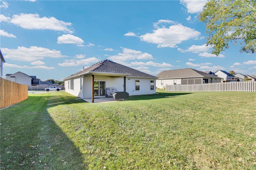Nearly “New” built home, ready for you. Welcome to Aster, a beautiful ranch-style home by Authentic Homes KC! This thoughtfully designed home is packed with luxurious upgrades and stylish touches throughout. Gorgeous & upgraded flooring offers both elegance and durability. This open-concept layout features a chef-inspired kitchen with quartz countertops, stainless steel appliances including a gas stove, custom cabinetry, a walk-in pantry, ample counter space, and a large center island that flows seamlessly into the spacious living room—perfect for entertaining. The master suite boasts a large bedroom, a spa-inspired bathroom with double vanity, custom tiled shower with bench seat, and a generous walk-in closet conveniently connected to the laundry room. Step outside to enjoy the expansive covered patio, large back patio, and beautifully manicured yard—ideal for relaxing or hosting gatherings. This home is move-in ready and easy to show—don’t miss your chance to make it yours!