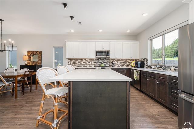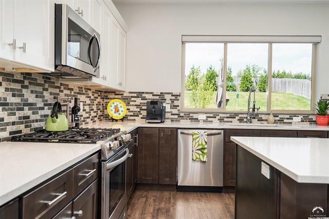 Beautifully designed and move-in ready, this 3-bedroom, 3-bath home in the desirable Langston Hughes community offers the perfect blend of comfort and style. Step inside to a bright, open floor plan with soaring ceilings, a cozy fireplace, and expansive windows that bring in natural light. The chef’s kitchen features quartz countertops, custom tile backsplash, stainless steel appliances, and a large island with seating perfect for gatherings. The main-level primary suite is a true retreat with a spa-like ensuite showcasing a soaking tub, oversized walk-in shower with custom tile detail, and double vanities. Upstairs, two generously sized bedrooms share a Jack & Jill bathroom, each with its own large closet. Outside, enjoy beautifully landscaped front and back yards with curated flower beds, a full irrigation system, and a spacious patio ideal for outdoor entertaining. The fenced yard, stone retaining wall, and mature plantings provide both beauty and privacy. Built just three years ago, this home combines modern amenities with thoughtful details inside and out. Schedule your private showing today!