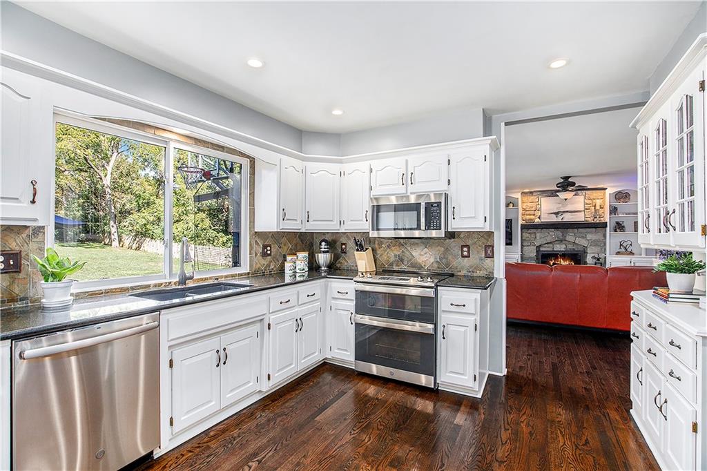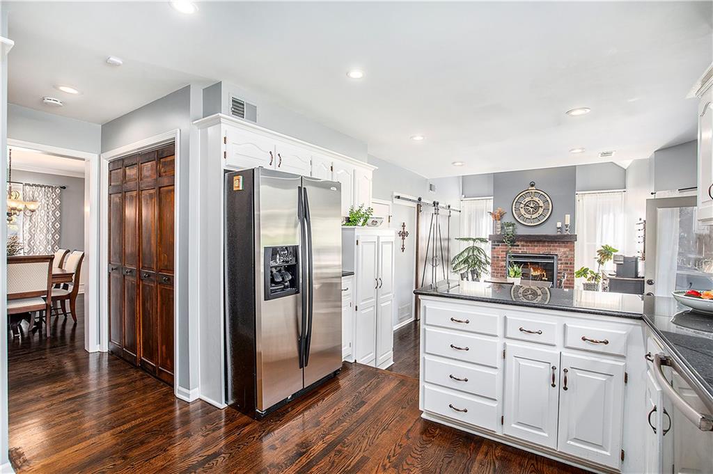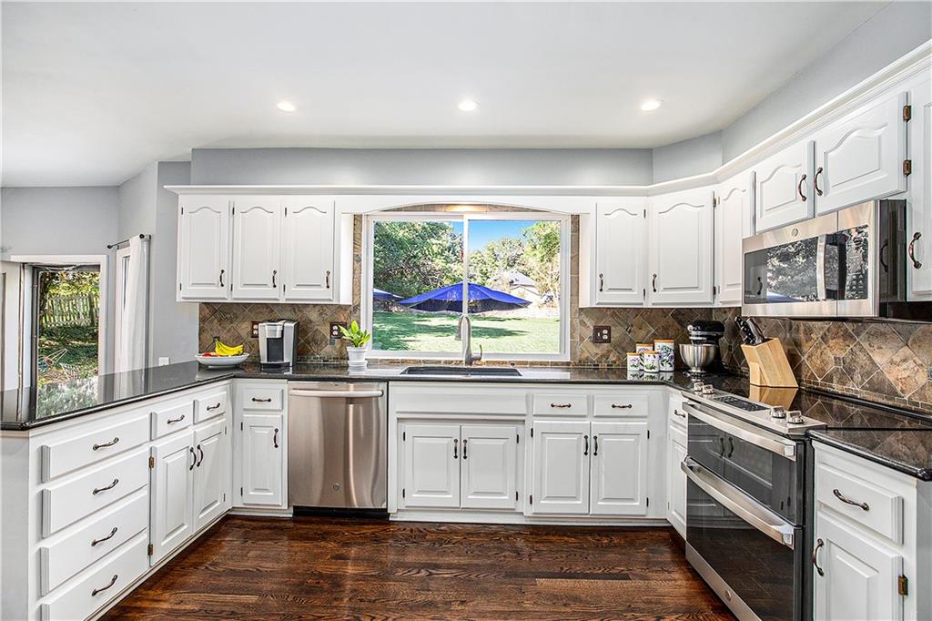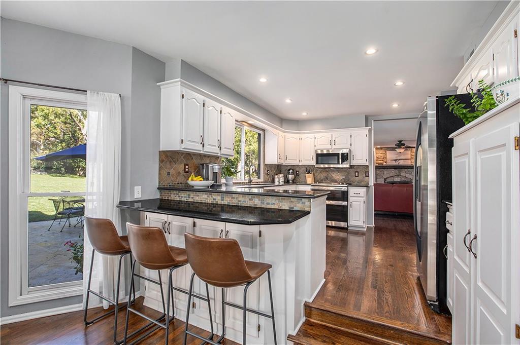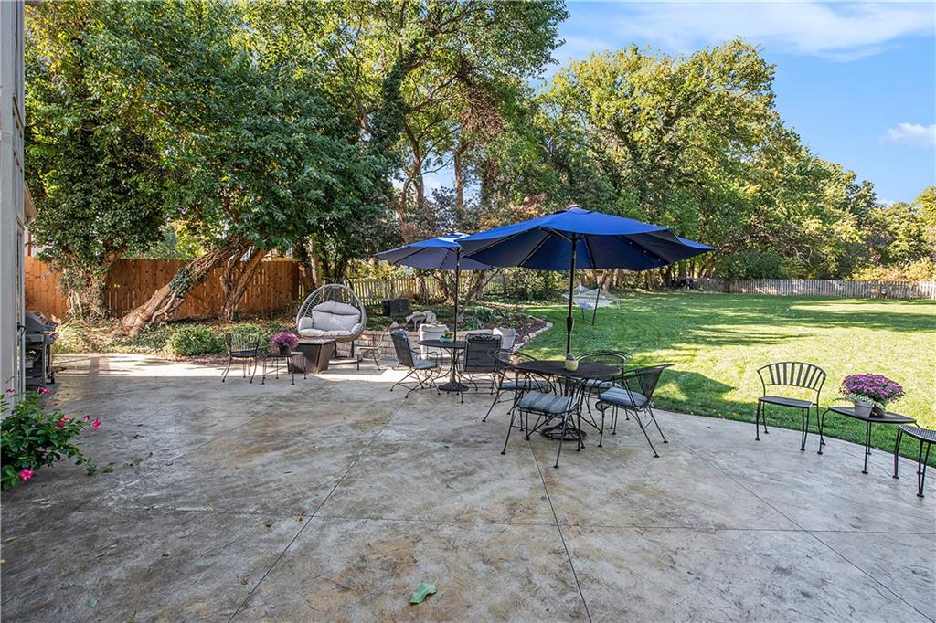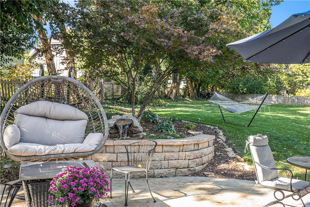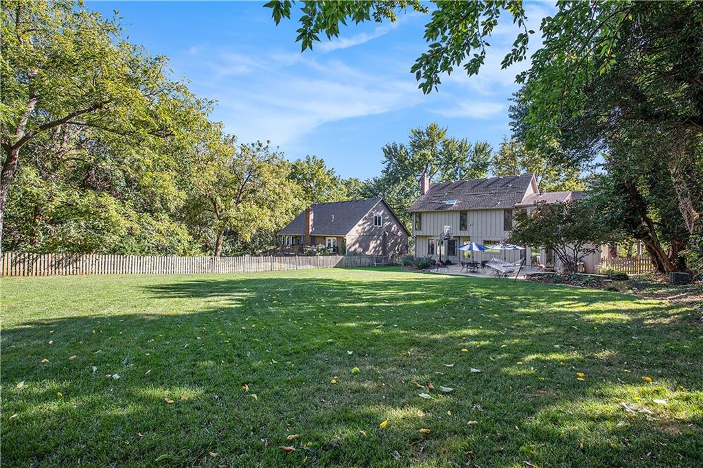 Celebrate the Holidays in Oak Tree Meadows Move in before the end of the year and enjoy the seasons ahead in this beautifully-updated home on a stunning park-like lot. This 4-bedroom, 2 1/2 -bath home in the desirable Oak Tree Meadows community of Overland Park offers the perfect blend of comfort, charm, and thoughtful design. Pride of ownership shines throughout with consistent updates including an updated roof, fresh exterior paint, and an updated kitchen that opens to the hearth room, dining room, and living room—all overlooking a spectacular backyard. The kitchen features painted cabinetry, granite counters, stainless steel appliances, and an eat-in hearth area accented by a brick fireplace and a clever barn-door drop zone for everyday organization. The living room boasts a stone fireplace framed by built-ins and rich hardwood floors that bring warmth and character to the main level. Step outside to your own private oasis—a lush, level .39-acre treed lot with a stamped concrete patio, tranquil water feature, and ample space for entertaining or quiet evenings under the trees. Upstairs, the spacious primary suite includes a sitting area, updated ensuite bath with granite double vanity, walk-in shower, jacuzzi tub, and generous walk-in closet. Secondary bedrooms are equally spacious and share a hall bath with painted vanity and skylight. The finished lower level is designed for fun and function—featuring a family room, wet bar, exercise space, and a stylish barn door accent. Nestled in a quiet, established neighborhood with access to Stoll Park, a private neighborhood lake, and just minutes from shopping, dining, and major highways (I-35, 435, and 69)—this home perfectly balances comfort, convenience, and community.