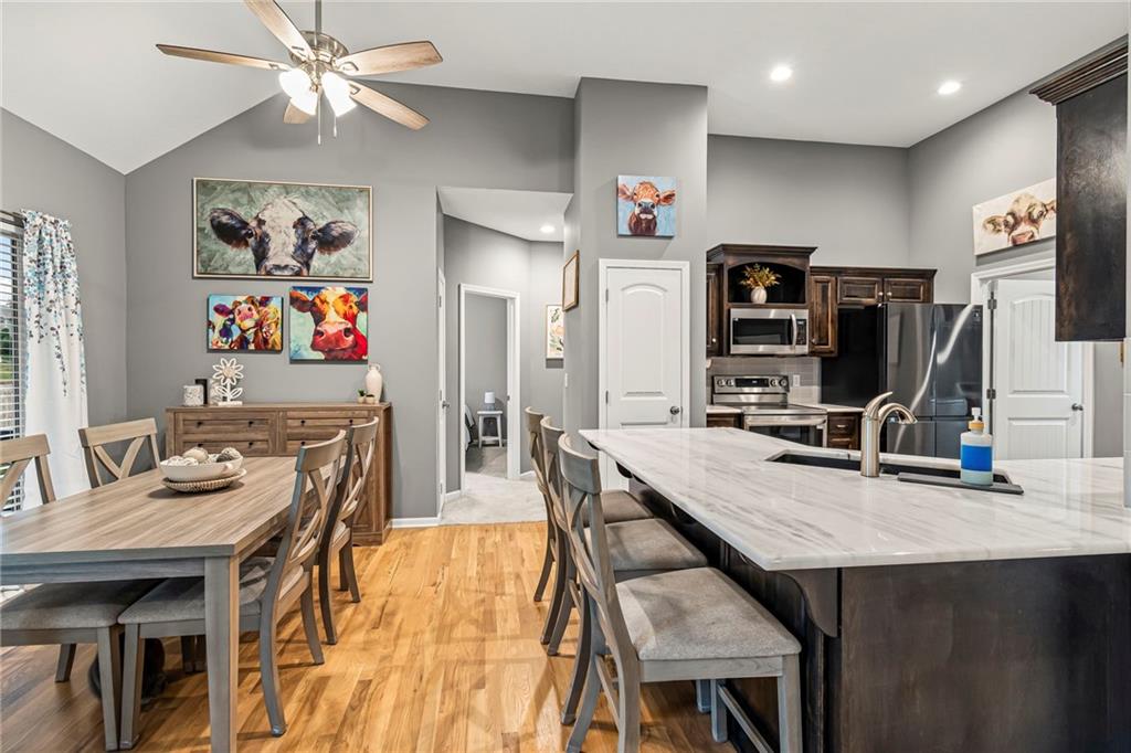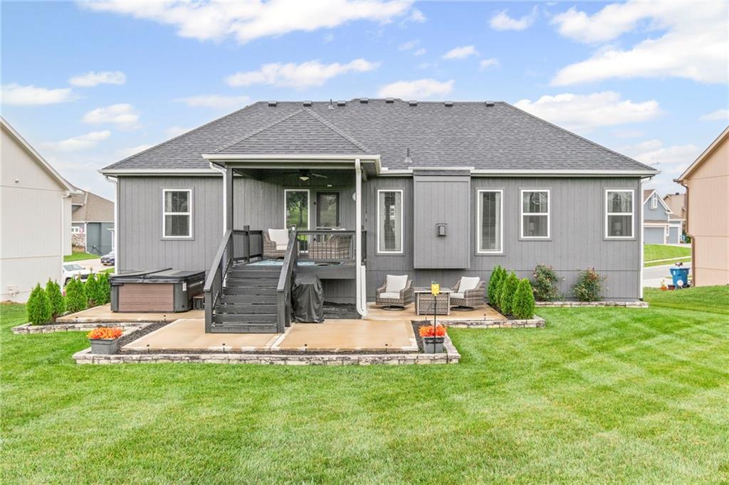 Step inside this nearly new Liberty home where thoughtful design and everyday comfort come together. The main level greets you with a spacious, light-filled living room anchored by a cozy gas fireplace and plush carpet that invites you to kick off your shoes and stay awhile. Just beyond, warm hardwood floors carry through the kitchen and dining area—an open, seamless space perfect for gatherings. The kitchen shines with quartz countertops, stainless steel appliances, ample cabinetry, and a pantry, while the conveniently located laundry room just off the kitchen keeps everything practical and within reach. The primary suite is privately tucked away, offering a peaceful retreat with a large walk-in closet and a spa-inspired bath complete with dual sinks, soaking tub, and separate shower. Two additional bedrooms and a full bath round out the main level. Downstairs, the finished lower level expands your living space with a generous family room ideal for movie nights, game days, or a cozy hangout spot. You’ll also find a fourth bedroom and third full bath—perfect for guests or a home office. Out back, unwind on the covered deck or entertain on the extended patio overlooking the beautifully maintained yard. With an oversized three-car garage and access to Clay Meadows’ neighborhood pool, this home blends small-town Liberty charm with modern style and convenience.