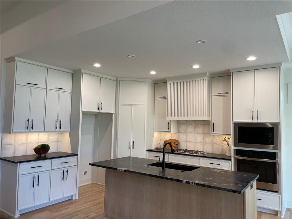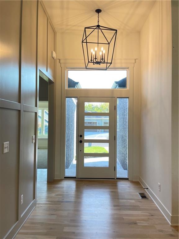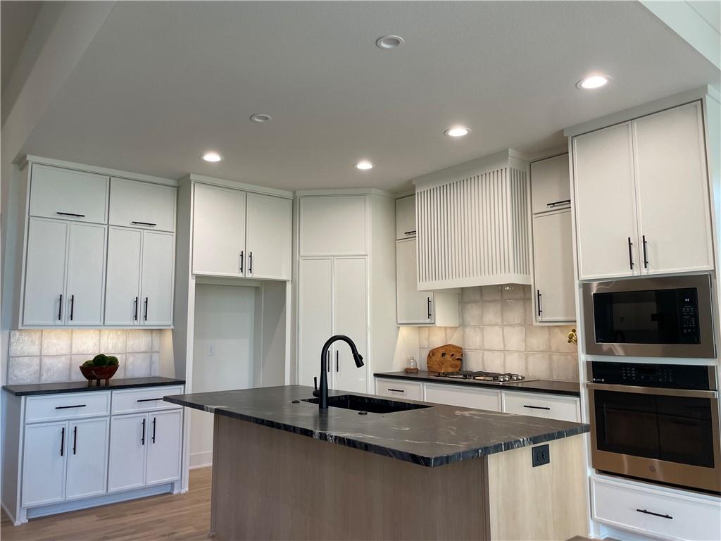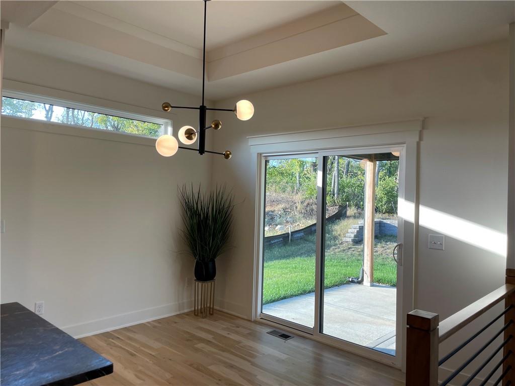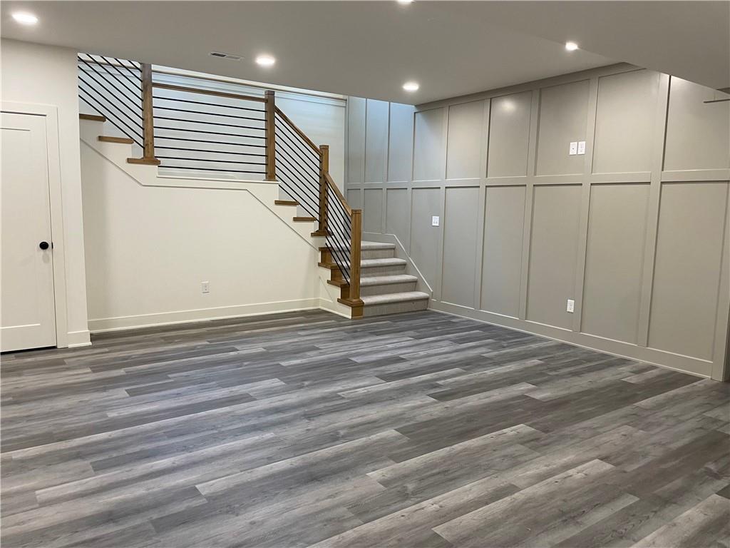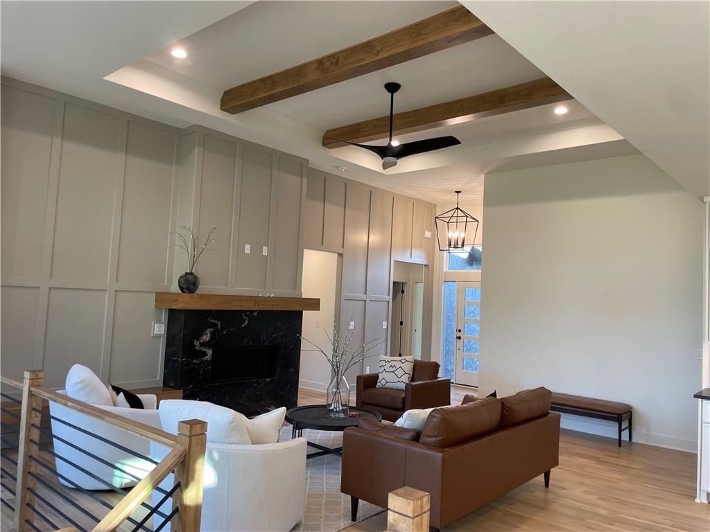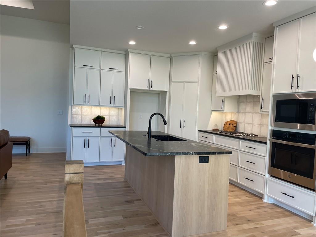 WaterCrest Landing | Sunset Views. Elevated Living. Discover the Brookside at WaterCrest Landing - by Spiess Custom Homes: an architectural statement poised on a quiet, tree-lined lot. This brand-new, Rev 1.5 Story offers a seamless blend of expert craftsmanship and tranquil natural surroundings. Spanning 2,707 finished square feet, the home's interiors are defined by impeccable details and superior finishes. The kitchen is a chef's delight, showcasing custom cabinetry, a generous island, and rich wood flooring that flows throughout the main level. The great room features a vaulted ceiling, creating an airy, light-filled space for gathering. The design effortlessly extends to the outdoors with a spacious covered patio, an ideal extension of the living area for relaxation or hosting. The lower level is built for entertainment, featuring a full wet bar anchoring the expansive recreation room. This prime location places you directly across from Lake Lenexa and Black Hoof Park, granting immediate access to scenic trails and water activities. Enjoy the carefree lifestyle of WaterCrest Landing, complete with a community pool and included maintenance services. This is a distinctive property, offering a refined, comfortable life. Make the Brookside your own.