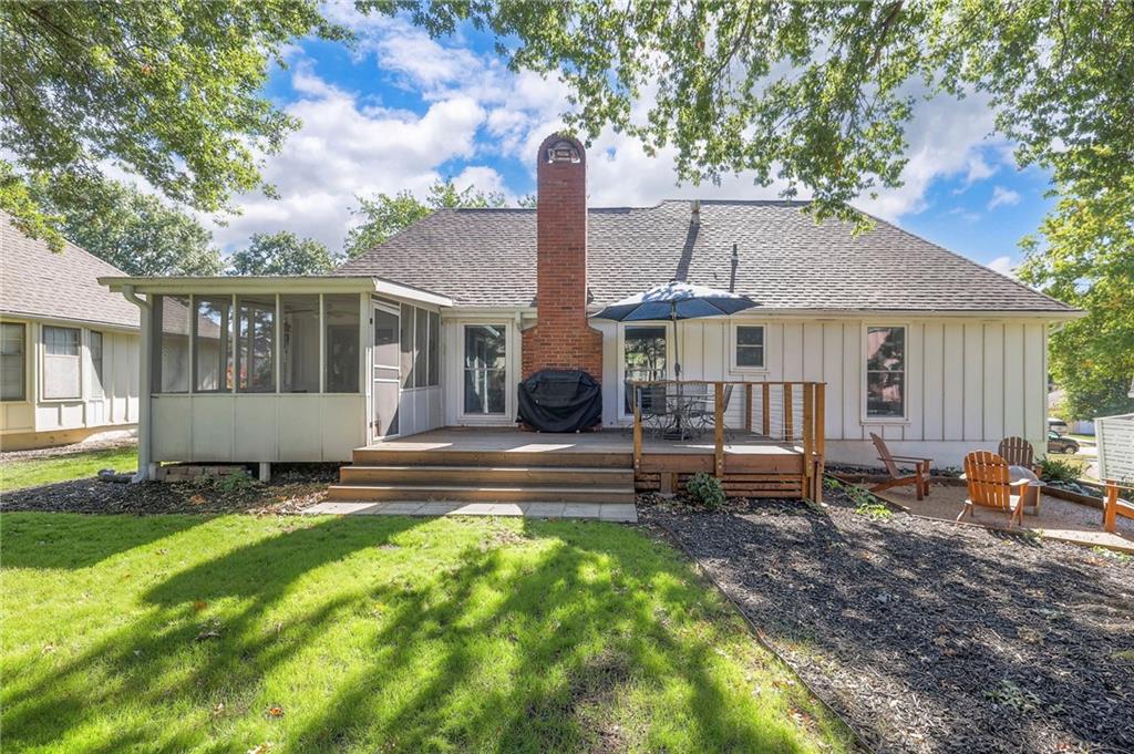 Welcome to this beautifully updated Overland Park home. The open and inviting floor plan features, vaulted ceilings, a light and bright kitchen with stainless steel appliances, wood floors, and modern lighting. Enjoy cozy evenings by the fireplace and morning coffee in the sunroom. The large deck and patio offer multiple outdoor spaces for relaxing, dining, or hosting guests. The huge unfinished basement provides endless potential - whether you're dreaming of a home gym, theater, or additional living space. Perfectly situated in a charming neighborhood with mature trees, great schools, parks, shopping, and highway access, this home checks every box. Don't miss your chance to enjoy comfort, style, and convenience all in one. Schedule your private showing today!