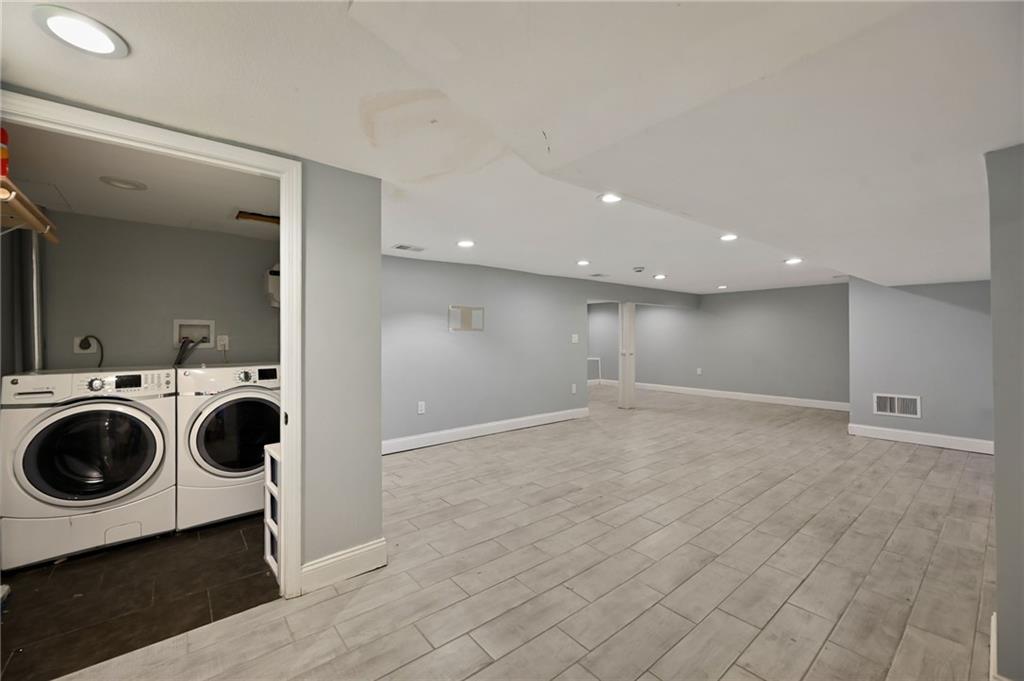 Better than new Construction! Lake views! Character! True ranch 3/2 on main level. 4th nonconforming bathroom w/ private en suite in lower level. Well lit, tall floor to ceiling windows w/ views of the lake from kitchen, dining, and living room! Kitchen quartz island. Big fenced level backyard for all kinds of activities. HVAC zoned! Kitchen walks out to adorable courtyard. Primary bedroom walks out to backyard. All right next to the private lake you have access to.