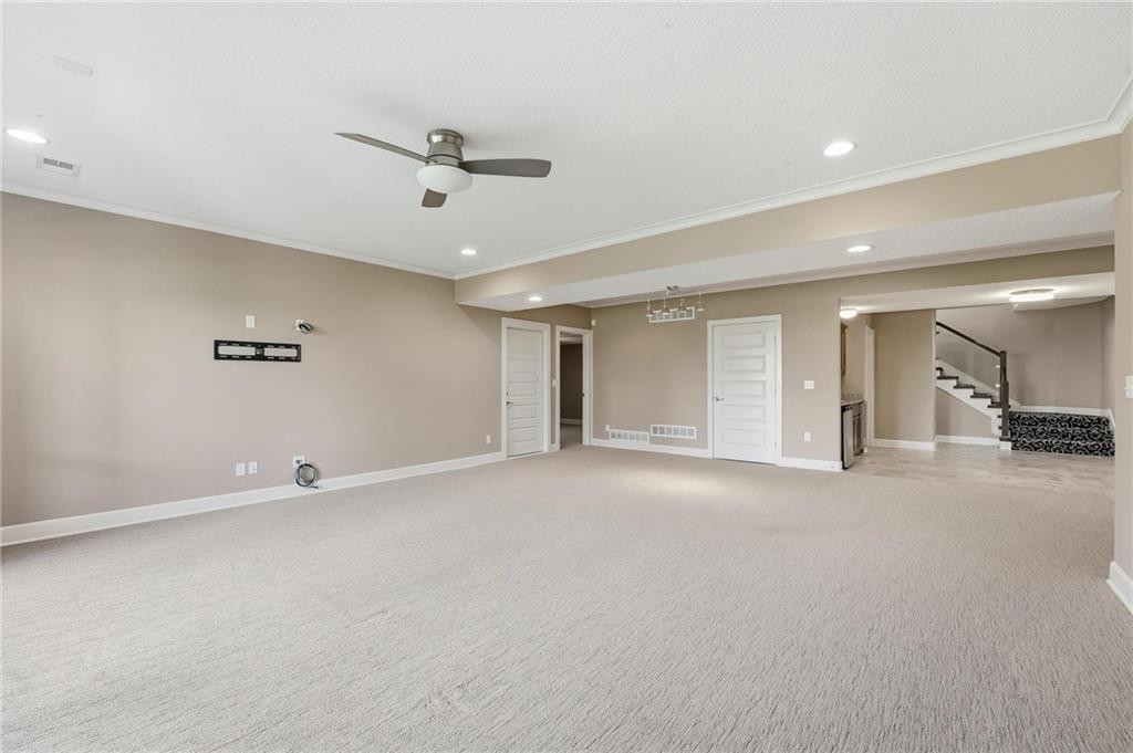 Exceptional custom home designed with entertaining in mind. Stunning walnut floors from the gracious entry, through the great room, kitchen & breakfast room. Great room has vaulted ceiling, gas fireplace in stone accent wall, built-ins & floating shelves. Kitchen has large island, top of the line appliances including built-in Frigidaire Professional refrigerator/freezer, cooktop with vented hood, dbl oven, microwave & dishwasher. Pantry is 5x16 with built in desk under window, tons of shelf space. Breakfast nook is ideal for banquet, full glass door out to Lanai, vaulted ceiling, ceiling fan. Bonus main level family room has 19' bar w/custom cabinets, granite counters, stone walls behind bar, 2nd 15' long serving bar with tons of storage, granite countertop & mid century design. Family room has 15' vaulted ceiling with tongue & groove ceiling & beams. A beautiful den space, or room for baby grand piano, under the beautiful fixture plus additional dining space surrounded by windows & door out to large covered Lanai with tile floor. The primary suite is large with vaulted ceiling & luxury bath with separate vanities, very large tiled shower, dream 10x18 walk-in closet with large dresser island, walks through to laundry. Staircase to lower level with custom glass panel railing, large windows flooding the stairway with natural light. Large family room with wet bar area with tiled floor. 1 guest suite with bath & large walk-in closet, 2 additional bedrooms have walk-in closets, each with private vanity spaces, share shower. 1 bedroom has a secret passageway through built-in bookcase, to 8x9 storm area/storage under front porch! New covered patio off lower level family room is 20x13. Car lovers, a bonus 4th garage, has driveway from main level, is 22'd x 19'w. The main level 3 car garage is oversized, 31'wide, with 11' ceiling, 2 car side is 24'deep, 1 car side 29'deep with 9' wide door. North Shore is Cass County, Lee's Summit Schools.